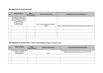 REKOMENDACJE HORYZONTALNE Lp. Rekomendacja Klasa rekomendacji Rozwiązania systemowe umożliwiające studentom uzyskanie profesjonalnego przygotowania do komponowania muzyki filmowej Adresat rekomendacji Proponowany sposób wdrożenia IMiT, Uczelnie Muzyczne, MKiDN, MEN Zmiany w programach nauczania, wspieranie kursów, szkoleń, etc. I 1 REKOMENDACJE OPERACYJNE – Panel: Polska Muzyka Filmowa z obrazem i bez Lp. 1 Rekomendacja Wzmocnienie profesjonalnej krytyki muzycznej muzyki filmowej Klasa rekomendacji Adresat rekomendacji Proponowany sposób wdrożenia Organizacja kolejnej edycji programu „Krytyka muzyczna 2.0” poświęconego krytyce muzycznej muzyki filmowej II IMiT Rekomendacje horyzontalne – związane z długofalowymi procesami, wieloletnimi programami, tendencjami Rekomendacje operacyjne – konkretne projekty do realizacji wciągu najbliższych 12 miesięcy Rekomendacja – zwięzła i jednoznaczna; można powołać się na zewnętrzne źródła informacji (np. przeprowadzone badania) Klasa rekomendacji – klasa odpowiadająca klasyfikacji z systemu rekomendacji (1 – pilna i ważna, 2 – pilna lub ważna, 3 – bieżąca) Adresat rekomendacji – instytucja (instytucje, osoby) odpowiedzialna za wdrożenie rekomendacji. Sposób wdrożenia – syntetyczne przedstawienie sposobu wdrożenia rekomendacji.