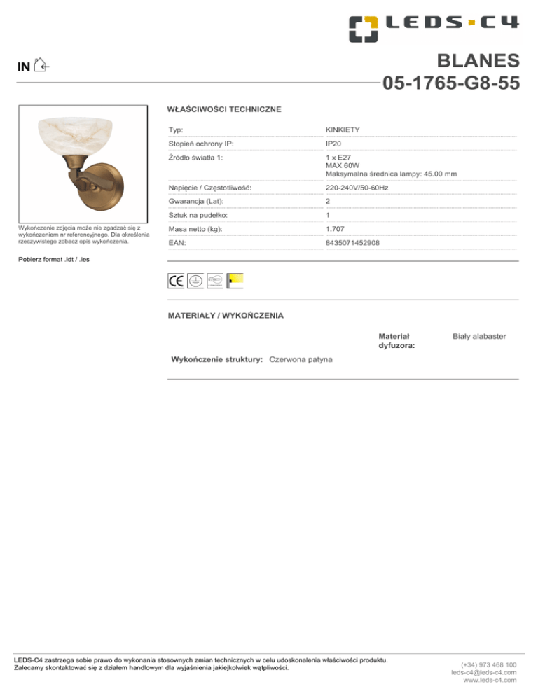 BLANES 05-1765-G8-55 IN WŁAŚCIWOŚCI TECHNICZNE Wykończenie zdjęcia może nie zgadzać się z wykończeniem nr referencyjnego. Dla określenia rzeczywistego zobacz opis wykończenia. Typ: KINKIETY Stopień ochrony IP: IP20 Źródło światła 1: 1 x E27 MAX 60W Maksymalna średnica lampy: 45.00 mm Napięcie / Częstotliwość: 220-240V/50-60Hz Gwarancja (Lat): 2 Sztuk na pudełko: 1 Masa netto (kg): 1.707 EAN: 8435071452908 Pobierz format .ldt / .ies MATERIAŁY / WYKOŃCZENIA Materiał dyfuzora: Biały alabaster Wykończenie struktury: Czerwona patyna LEDS-C4 zastrzega sobie prawo do wykonania stosownych zmian technicznych w celu udoskonalenia właściwości produktu. Zalecamy skontaktować się z działem handlowym dla wyjaśnienia jakiejkolwiek wątpliwości. (+34) 973 468 100 [email protected] www.leds-c4.com