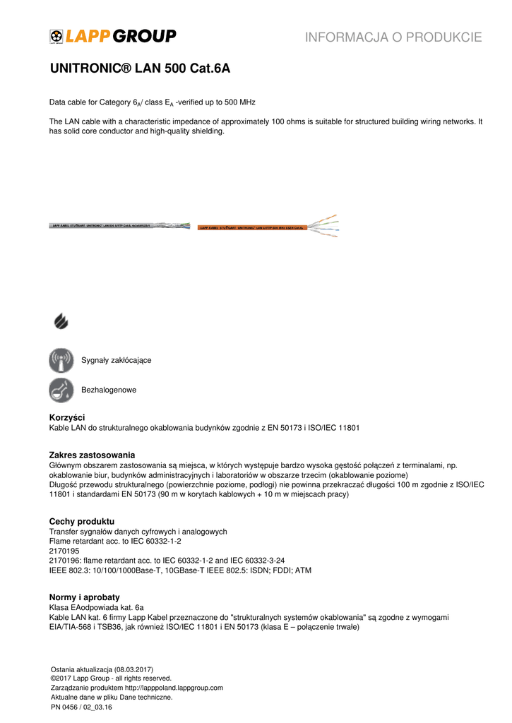 INFORMACJA O PRODUKCIE UNITRONIC® LAN 500 Cat.6A Data cable for Category 6A/ class EA -verified up to 500 MHz The LAN cable with a characteristic impedance of approximately 100 ohms is suitable for structured building wiring networks. It has solid core conductor and high-quality shielding. Sygnały zakłócające Bezhalogenowe Korzyści Kable LAN do strukturalnego okablowania budynków zgodnie z EN 50173 i ISO/IEC 11801 Zakres zastosowania Głównym obszarem zastosowania są miejsca, w których występuje bardzo wysoka gęstość połączeń z terminalami, np. okablowanie biur, budynków administracyjnych i laboratoriów w obszarze trzecim (okablowanie poziome) Długość przewodu strukturalnego (powierzchnie poziome, podłogi) nie powinna przekraczać długości 100 m zgodnie z ISO/IEC 11801 i standardami EN 50173 (90 m w korytach kablowych + 10 m w miejscach pracy) Cechy produktu Transfer sygnałów danych cyfrowych i analogowych Flame retardant acc. to IEC 60332-1-2 2170195 2170196: flame retardant acc. to IEC 60332-1-2 and IEC 60332-3-24 IEEE 802.3: 10/100/1000Base-T, 10GBase-T IEEE 802.5: ISDN; FDDI; ATM Normy i aprobaty Klasa EAodpowiada kat. 6a Kable LAN kat. 6 firmy Lapp Kabel przeznaczone do "strukturalnych systemów okablowania" są zgodne z wymogami EIA/TIA-568 i TSB36, jak również ISO/IEC 11801 i EN 50173 (klasa E – połączenie trwałe) Ostania aktualizacja (08.03.2017) ©2017 Lapp Group - all rights reserved. Zarządzanie produktem http://lapppoland.lappgroup.com Aktualne dane w pliku Dane techniczne. PN 0456 / 02_03.16 INFORMACJA O PRODUKCIE UNITRONIC® LAN 500 Cat.6A Budowa produktu Żyła jednodrutowa U/FTP: aluminiowa folia kompozytowa jako ekran par przewodów F/FTP: aluminiowa folia kompozytowa służąca jako ekran ogólny i ekran par przewodów S/FTP: miedziany oplot do ekranowania ogólnego i aluminiowa folia kompozytowa do ekranowania par przewodów Płaszcz zewnętrzny z PVC (kolor szary RAL1015) lub z LSZH (kolor pomarańczowy RAL 2003) Dane techniczne Klasyfikacja: ETIM 5.0 Class-ID: EC000830 Opis klasy ETIM 5.0: Przewody do transmisji danych Minimalny promień gięcia: Podczas montażu: 8 x średnica zewnętrzna Instalacja na stałe: 4 x średnica zewnętrzna Impedancja falowa: 100 Ohm ±3 % Zakres temperatury: Podczas pracy: od -20°C do +60°C Podczas montażu: 0°C do +50°C Wskazówka Standardowe odcinki proszę sprawdzić na: www.lapppolska.pl Rodzaj opakowania: krążek 100 m; bęben (500; 1000 m) Kat. 6a znajduje się obecnie w fazie projektowania Szczegółowa specyfikacja techniczna na zamówienie. Prosimy podawać dokładne typy kabli/wymiary. Fotografie nie mogą być używane do wymiarowania oraz nie stanowią szczegółowego odwzorowania przedstawionych produktów. * Podane ceny to ceny netto bez podatku VAT i dodatkowych opłat. Sprzedaż klientom biznesowym. Ostania aktualizacja (08.03.2017) ©2017 Lapp Group - all rights reserved. Zarządzanie produktem http://lapppoland.lappgroup.com Aktualne dane w pliku Dane techniczne. PN 0456 / 02_03.16 Powered by TCPDF (www.tcpdf.org) Oznaczenie wyrobu Liczba par i rozmiar AWG żyły Maksymalna średnica zewnętrzna [mm] Indeks miedzi [kg/km] Waga [kg/km] 500 S/FTP Cat.6A 4 x 2 x AWG23/1 7,7 27 58 2170195 500 U/FTP Cat.6A LSZH 4 x 2 x AWG23/1 7,4 21 52 2170196 500 F/FTP Cat.6A LSZH 4 x 2 x AWG23/1 7,6 22 56 Wersje PVC 2170143 Wersje bezhalogenowe UNITRONIC® LAN 500 Cat.6A Ostania aktualizacja (08.03.2017) ©2017 Lapp Group - all rights reserved. Zarządzanie produktem http://lapppoland.lappgroup.com Aktualne dane w pliku Dane techniczne. PN 0456 / 02_03.16 INFORMACJA O PRODUKCIE Powered by TCPDF (www.tcpdf.org) Numer katalogowy