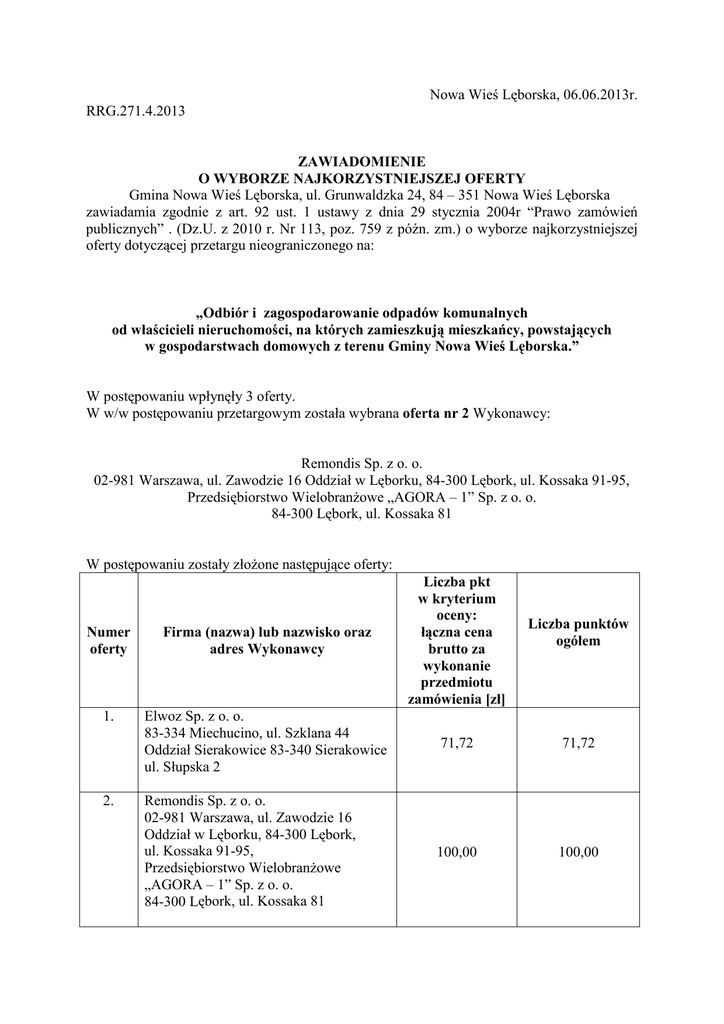 Nowa Wieś Lęborska, 06.06.2013r. RRG.271.4.2013 ZAWIADOMIENIE O WYBORZE NAJKORZYSTNIEJSZEJ OFERTY Gmina Nowa Wieś Lęborska, ul. Grunwaldzka 24, 84 – 351 Nowa Wieś Lęborska zawiadamia zgodnie z art. 92 ust. 1 ustawy z dnia 29 stycznia 2004r “Prawo zamówień publicznych” . (Dz.U. z 2010 r. Nr 113, poz. 759 z późn. zm.) o wyborze najkorzystniejszej oferty dotyczącej przetargu nieograniczonego na: „Odbiór i zagospodarowanie odpadów komunalnych od właścicieli nieruchomości, na których zamieszkują mieszkańcy, powstających w gospodarstwach domowych z terenu Gminy Nowa Wieś Lęborska.” W postępowaniu wpłynęły 3 oferty. W w/w postępowaniu przetargowym została wybrana oferta nr 2 Wykonawcy: Remondis Sp. z o. o. 02-981 Warszawa, ul. Zawodzie 16 Oddział w Lęborku, 84-300 Lębork, ul. Kossaka 91-95, Przedsiębiorstwo Wielobranżowe „AGORA – 1” Sp. z o. o. 84-300 Lębork, ul. Kossaka 81 W postępowaniu zostały złożone następujące oferty: Numer oferty Firma (nazwa) lub nazwisko oraz adres Wykonawcy Liczba pkt w kryterium oceny: łączna cena brutto za wykonanie przedmiotu zamówienia [zł] 1. Elwoz Sp. z o. o. 83-334 Miechucino, ul. Szklana 44 Oddział Sierakowice 83-340 Sierakowice ul. Słupska 2 71,72 71,72 Remondis Sp. z o. o. 02-981 Warszawa, ul. Zawodzie 16 Oddział w Lęborku, 84-300 Lębork, ul. Kossaka 91-95, Przedsiębiorstwo Wielobranżowe „AGORA – 1” Sp. z o. o. 84-300 Lębork, ul. Kossaka 81 100,00 100,00 2. Liczba punktów ogółem 3. „Lukas” Łukasz Gniedziejko 84-300 Lębork, ul. Zwycięstwa 7 --------------- --------------- Wyżej wymieniona oferta spełnia wszystkie wymagane kryteria i nie podlega odrzuceniu. Kryterium oceny ofert była łączna cena brutto za wykonanie przedmiotu zamówienia waga 100%. Wybrany Wykonawca otrzymał największą liczbę punktów i uzyskał w kryterium oceny ofert łącznie 100 pkt. Cena w wybranej ofercie jest najniższa i przekracza kwotę, jaką Zamawiający zamierza przeznaczyć na sfinansowanie zamówienia, lecz zgodnie z art. 93 ust. 1 pkt. 4 ustawy Pzp Zamawiający zwiększa kwotę, którą zamierza przeznaczyć na sfinansowanie zamówienia do ceny najkorzystniejszej oferty. W postępowaniu na podstawie art. 24 ust. 2 pkt 4 ustawy Pzp. wykluczono Wykonawcę: „Lukas”, 84-300 Lębork, ul. Zwycięstwa 7, gdyż nie wykazał spełniania warunków udziału w postępowaniu. Zgodnie z art. 24 ust. 4 w powiązaniu z art. 89 ust. 1 pkt 5 uPzp ofertę Wykonawcy wykluczonego uznaje się za odrzuconą – oferta Nr 3. Uzasadnienie faktyczne i prawne: 1. Wykonawca w celu wykazania spełniania warunku posiadania uprawnienia do wykonywania określonej działalności lub czynności, jeżeli przepisy prawa nakładają obowiązek ich posiadania Wykonawca posłużył się firmą Usługowo – Handlową „AL – EKO” z Świeszyna występującą jako podwykonawca a w dalszej części oferty występująca na zasadach określonych w art. 26 ust. 2b uPzp. Wykonawca złożył zezwolenia na transport odpadów wystawione na firmę „Lukas” w którym nie figurują kody: 20 01 35* zużyte urządzenia elektryczne i elektroniczne inne niż wymienione w 20 01 21 i 20 01 23 zawierające niebezpieczne składniki 20 01 36 zużyte urządzenia elektryczne i elektroniczne inne niż wymienione w 20 01 21, 20 01 23 i 20 01 35 Wykonawca został wezwany do złożenia wyjaśnień: a. w jakim charakterze występuje F.U.H „AL-EKO”: jako podwykonawca czy na zasadach określonych w art. 26 ust. 2b uPzp. b. rozbieżności pomiędzy podaniem, że podwykonawca odbierze i zagospodaruje odpady niebezpieczne a oświadczeniem F.U.H „AL-EKO” że odbierze odpady od firmy: LUKAS. Ponadto Wykonawca został wezwany do uzupełnienia zezwolenia na transport odpadów, wydanego na podstawie art. 28 ustawy z dnia 27 kwietnia 2001 r. o odpadach (Dz. U. z 2010 r. Nr 185, poz. 1243 ze zm.) lub wpis do rejestru, o którym mowa w art. 49 w związku z art. 233 ustawy z dnia 14 grudnia 2012 r. o odpadach (Dz. U z 2013 r., poz. 21) w zakresie: 20 01 36 zużyte urządzenia elektryczne i elektroniczne inne niż wymienione w 20 01 21, 20 01 23 i 20 01 35. Wykonawca w piśmie z dnia 29.03.2013 wyjaśnił że: a. F.U.H. „AL-EKO” występuje w w/w zamówieniu na zasadach określonych w art. 26 ust. 2b oraz b. F.U.H. „AL-EKO” odbierze i zagospodaruje odpady niebezpieczne. Ponadto poinformował, że zezwolenie na transport odpadów w zakresie 20 01 36 – zużyte urządzenia elektryczne i elektroniczne inne niż wymienione w 20 01 21, 20 01 23 i 20 01 35 posiada firma „AL-EKO”, która w oświadczeniu zobowiązała się do odbioru i zagospodarowania także innych odpadów na które posiada zezwolenie od firmy „Lukas” Wykonawca nie przedstawił zezwolenia na transport odpadów wystawione na firmę Lukas w którym figurują kody: 20 01 35* zużyte urządzenia elektryczne i elektroniczne inne niż wymienione w 20 01 21 i 20 01 23 zawierające niebezpieczne składniki 20 01 36 zużyte urządzenia elektryczne i elektroniczne inne niż wymienione w 20 01 21, 20 01 23 i 20 01 35. Wezwany do uzupełnień wykonawca nie przedstawił wpisu do rejestru zbierających zużyty sprzęt elektryczny i elektroniczny prowadzonego przez GIOS, a wymagany art. 7 ustawy z dnia 29 lipca 2005 roku o zużytym sprzęcie elektrycznym i elektronicznym. W piśmie z dnia 29.05.2013 wyjaśnił, że firma „Lukas” korzysta z wpisu do rejestru zbierających zużyty sprzęt elektryczny i elektroniczny o numerze rejestracyjnym E0000785Z. Z załączonych dokumentów wynika, że pod tym numerem figuruje F.U.H. „AL-EKO”. Tym samym Wykonawca nie udowodnił że jest uprawniony do odbioru odpadów elektrycznych i elektronicznych od mieszkańców gminy Nowa Wieś Lęborska. Wykonawca nie przedstawił ww. dokumentów więc nie wykazał, że jest w stanie przetransportować odpady do F.U.H. „AL-EKO”. Wykonawca przedstawił ww. zezwolenie w którym figurują wymienione kody