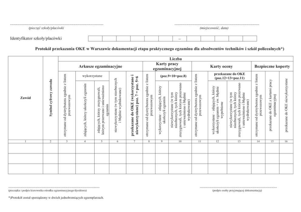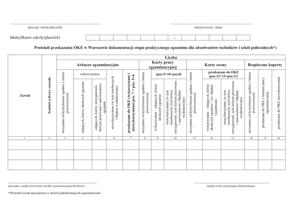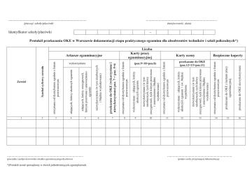 1 2 3 4 (pieczątka i podpis kierownika ośrodka egzaminacyjnego/dyrektora) ..................................................................................... *)Protokół został sporządzony w dwóch jednobrzmiących egzemplarzach. 6 7 8 (poz.9+10=poz.8) 9 10 przekazane do OKE z kartami pracy egzaminacyjnej przekazane do OKE niewykorzystane 11 otrzymane od dystrybutora zgodnie z listem przewozowym Liczba Karty pracy egzaminacyjnej niewykorzystane (w tym nieobecnych, tych którzy zrezygnowali, tych którym przerwano i uniewaŜniono i błędnie wydrukowane) Identyfikator szkoły/placówki wykorzystane – zdających, którzy ukończyli egzamin + ew. błędnie wypełnione (pieczęć szkoły/placówki otrzymane od dystrybutora zgodnie z listem przewozowym niewykorzystane (w tym nieobecnych, tych którzy zrezygnowali, tych którym przerwano i uniewaŜniono i błędnie wydrukowane) Arkusze egzaminacyjne wykorzystane – zdających, którzy ukończyli egzamin otrzymane od dystrybutora zgodnie z listem przewozowym 5 przekazane do OKE (wykorzystane i niewykorzystane) poz. 7 = poz. 5+6 wykorzystane niewykorzystane (w tym nieobecnych i błędnie wydrukowane) zdających, którzy zrezygnowali, którym przerwano i uniewaŜniono egzamin zdających, którzy ukończyli egzamin otrzymane od dystrybutora zgodnie z listem przewozowym Zawód Symbol cyfrowy zawodu ....................................................................................... ............................................................................... (miejscowość, data) − Protokół przekazania OKE w Warszawie dokumentacji etapu praktycznego egzaminu dla absolwentów techników i szkół policealnych*) Karty oceny Bezpieczne koperty przekazane do OKE (poz.12+13=poz.11) 12 13 14 15 16 ........................................................................ (podpis osoby przyjmującej dokumentację)