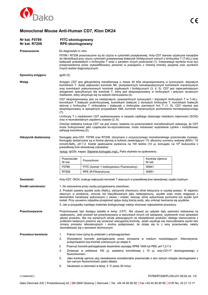 Monoclonal Mouse Anti-Human CD7, Klon DK24 Nr kat. F0789 Nr kat. R7208 Przeznaczenie FITC-skoniugowany RPE-skoniugowany Do diagnostyki in vitro. F0789 i R7208 przeznaczone są do użycia w cytometrii przepływowej. Anty-CD7 stanowi użyteczne narzędzie do identyfikacji przy użyciu cytometrii przepływowej białaczek limfatycznych ostrych z limfocytów T (T-ALL) oraz białaczek przewlekłych z limfocytów T wraz z panelem innych przeciwciał (1). Interpretacja wyników musi być przeprowadzona przez wykwalifikowany personel w powiązaniu z historią choroby pacjenta oraz wynikami innych testów diagnostycznych. Synonimy antygenu gp40 (2). Wstęp Antygen CD7 jest glikoproteiną transbłonową o masie 40 kDa ekspresjonowaną w tymocytach, dojrzałych komórkach T, dużej większości komórek NK, pluripotentnych hematopoetycznych komórkach macierzystych oraz komórkach prekursorowych komórek szpikowych i limfatycznych (3, 4, 5). CD7 jest najwcześniejszym antygenem specyficznym dla komórek T, który jest ekspresjonowany w limfocytach i jedynym wczesnym markerem, który utrzymuje się na wskorś różnicowania (4). CD7 ekspresjonowany jest na niedojrzałych, powszechnych tymocytach i dojrzałych limfocytach T w T-ALL, komórkach T białaczki prolimfocytowej, komórkach białaczki z dorosłych limfocytów T, komórkach białaczki skórnej z limfocytów T /chłoniaków i białaczek z limfocytów ziarnistych linii T (1, 6). CD7 również jest ekspresjonowany w specjalnych przypadkach AML komórek macierzystych pochodzenia hematopoetycznego (7). Limfocyty T z niedoborem CD7 zaobserwowano w zespole ciężkiego złożonego niedoboru odporności (SCID) oraz w reumatoidalnym zapaleniu stawów (2, 6). Chociaż dokładna funkcja CD7 nie jest znana, badania na przeciwciałach monoklonalnych wskazują, że CD7 może funkcjonować jako cząsteczka ko-stymulatorowa, może indukować wydzielanie cytokin i modyfikować adhezję komórkową (2). Odczynnik dostarczony Koniugaty anty-CD7, F0789 oraz R7208, otrzymano z oczyszczonego monoklonalnego przeciwciała mysiego. Koniugaty dostarczane są w formie płynnej w buforze zawierającym 1% albuminy surowicy wołowej (BSA) i 15 mmol/LNaN3, pH 7,2. Każde opakowanie wystarcza na 100 testów (10 µL koniugatu na 106 leukocytów z prawidłowej krwi obwodowej człowieka). Isotyp: IgG2b, kappa. Stężenie koniugatu mg/L: Patrz etykieta na opakowaniu. Swoistość Środki ostrożności Przeciwciało Nr kat. Fluorochrom Kontrola Ujemna Nr kat. F0789 FITC (Izomer 1 Izotiocjanianu Fluoresceiny) X0941 R7208 RPE (R-Fikoerytryna) X0951 Anty-CD7, DK24, znakuje większość komórek T obecnych w prawidłowej krwi obwodowej i szpiku kostnym. 1. Do stosowania przez osoby przygotowane zawodowo. 2. Produkt zawiera azydek sodu (NaN3), odczynnik chemiczny silnie toksyczny w czystej postaci. W stężeniu obecnym w produkcie, chociaż nie klasyfikowanym jako niebezpieczny, azydek sodu może reagować z elementami kanalizacji wykonanymi z ołowiu i miedzi, tworząc silnie wybuchowe pochodne lub azydki tych metali. Przy usuwaniu odpadów przepłukać spływ dużą ilością wody, aby uniknąć tworzenia się azydków. 3. Jak w przypadku każdego materiału biologicznego należy stosować odpowiednie procedury. Przechowywanie Procedura barwienia (114449-001) Przechowywać bez dostępu światła w temp. 2-8oC. Nie używać po upływie daty ważności wskazanej na opakowaniu. Jeśli produkt był przechowywany w warunkach innych niż wskazane, użytkownik musi sprawdzić jakość produktu. Nie ma wyraźnych oznak wskazujących na niestabilność produktu, dlatego równocześnie z próbkami badanymi powinno się oznaczać wiarygodną kontrolę. Jeżeli uzyskuje się nieoczekiwane wyniki bez zmiany procedur laboratoryjnych i można podejrzewać, że dzieje się to z winy przeciwciała, należy skontaktować się z serwisem technicznym. 1. Pobrać krew żylną do próbówki z antykoagulantem. 2. Wyodrębnić komórki jednojądrzaste przez wirowanie w medium rozdzielającym. Alternatywnie, przeprowadzić lizę krwinek czerwonych po etapie 6 3. Przemyć komórki jednojądrzaste dwukrotnie używając RPMI 1640 lub PBS, pH 7,2-7,4. 4. Zmieszać w próbówce 100 µL zawiesiny komórkowej z 10 µL anty-CD117 skoniugowanego z fluorochromem. 5. Jako kontrolę ujemna użyj niereaktywne monoklonalne przeciwciało o tym samym izotypie skoniugowane z tym samym fluorochromem (patrz tabela). 6. Inkubować w ciemności w temp. 4 °C przez 30 minut. F0789/R7208/PL/OKJ/01.09.02 str. 1/2 Dako Denmark A/S | Produktionsvej 42 | DK-2600 Glostrup | Denmark | Tel. +45 44 85 95 00 | Fax +45 44 85 95 95 | CVR No. 33 21 13 17 7. Przemyć dwukrotnie PBS zawierającym 2% BSA. Ponownie wykonać zawieszenie komórek z każdej z probówek w medium odpowiednim dla cytometrii przepływowej np. 0,3 mL 1% paraformaldehydu (utrwalacz) w 0,01 mol/L PBS, pH 7,4. 8. Wykonać analizę na cytometrze przepływowym. Zaleca się wykonanie kontroli ujemnej i dodatniej równolegle z przygotowaniem badanych próbek. Należy także zwrócić uwagę na fakt że, próbki zawierające fluorochromy są nieodporne na światło, dlatego należy je ochraniać w trakcie całej procedury przygotowania i analizy. Literatura 1. van Dongen JJM, Adriaansen HJ. Chapter 6. Immunobiology of leukaemia. In:Henderson ES, Lister TA, Greaves MF. Leukemia. Philadelphia, London, Toronto, Montreal, Sydney, Tokyo: WB Saunders Company; 1996. p. 83-130. 2. Bowen MA. CD Guide. CD7. In: Mason D, André P, Bensussan A, Buckley C, Civin C, Clark E, et al., editors. Leucocyte typing VII. White cell differentiation antigens. Proceedings of the 7th International Workshop and Conference; 2000 Jun 19-23; Harrogate, United Kingdom. New York: Oxford University Press Inc.; 2002. p. 754. 3. Reiter C. Cluster report: CD7. In: Knapp W, Dörken B, Gilks WR, Rieber EP, Schmidt RE, Stein H, et al., editors. Leucocyte typing IV. White cell differentiation antigens. Proceedings of 