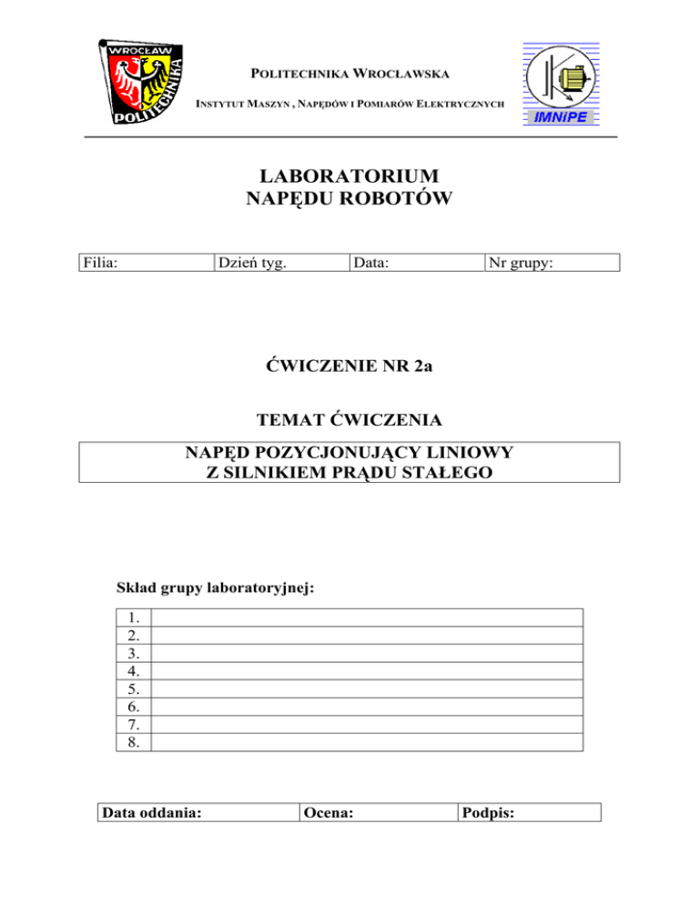 POLITECHNIKA WROCŁAWSKA INSTYTUT MASZYN , NAPĘDÓW I POMIARÓW ELEKTRYCZNYCH LABORATORIUM NAPĘDU ROBOTÓW Filia: Dzień tyg. Data: Nr grupy: ĆWICZENIE NR 2a TEMAT ĆWICZENIA NAPĘD POZYCJONUJĄCY LINIOWY Z SILNIKIEM PRĄDU STAŁEGO Skład grupy laboratoryjnej: 1. 2. 3. 4. 5. 6. 7. 8. Data oddania: Ocena: Podpis: 1. Zagadnienie sterowania położeniem 1.1. Sterowanie numeryczne w technice wytwarzania Z rozważań dotyczących przebiegów kinematycznych w poszczególnych obrabiarkach stosowanych w technikach wytwarzania wynika następujący podział sterowań położeniem [1]. • sterowanie kształtowe • sterowanie punktowe W sterowaniu punktowym ruch między punktami o określonych współrzędnych może odbywać się wzdłuż dowolnej drogi . Przykładowo gdy przemieszcza się stół wiertarki od punktu A o współrzędnych (x1y1) do punktu B o współrzędnych (x2y2), wówczas jest obojętne po jakiej drodze to nastąpi, ponieważ podczas przemieszczania narzędzie nie styka się z przedmiotem obrabianym. Ograniczenia co do drogi, po której przemieszcza się narzędzie, mogą pojawić się wtedy, gdy na drodze narzędzia znajduje się przeszkoda np. żebro. Ten rodzaj sterowania jest najprostszym rodzajem sterowania położeniem. Jest on stosowany w wiertarkach, zgrzewarkach punktowych, urządzeniach montażowych układów elektronicznych, w urządzeniach pomiarowych i kontrolnych [1]. Sterowanie kształtowe umożliwia obróbkę dowolnych powierzchni, dwu lub wielowymiarowych, jakie są przeważnie realizowane na frezarkach tokarkach lub wycinarkach palnikowych. Przy takim sterowaniu położeniem narzędzie przemieszcza się od punktu A do B według drogi opisanej funkcją y=f(x) lub (x,y)=f(t), narzędzia w osi x i y są wtedy położenia powiązane ze sobą wzajemnie i z czasem . W obrabiarkach sterowanych numerycznie o sterowaniu kształtowym, w wyniku nadążania suportów za wartościami zadanymi, narzędzie porusza się po określonym torze. Tor ten jednak nie zawsze pokrywa się z torem zadanym, zwłaszcza gdy zmiany kierunku toru i szybkości nie następują w sposób łagodny i ciągły. Występujące odchyłki toru są wynikiem właściwości układu regulacji położenia i są nazywane dynamicznymi odchyłkami toru [1]. 1.2. Sposoby nastawiania położenia W procesie nastawiania położenia decydującą rolę odgrywają parametry napędu. Decydują one o właściwościach dynamicznych układu regulacji położenia, a tym samym o zniekształceniu toru. W obrabiarkach NC zadaniem urządzeń do nastawiania położenia jest zapewnienie zespołom maszyny nadążania, w sposób możliwie nie zniekształcony i bez opóźnień, za wielkością sterującą utworzoną na podstawie zadanego toru ruchu. Nastawianie położenia następuje przez: -sterowanie w układzie otwartym -regulację (sterowanie w układzie zamkniętym ze sprzężeniem zwrotnym) W sterowaniu położeniem, gdy nie jest konieczne sprzężenie zwrotne, a więc w układach sterowania numerycznego otwartego , nastawianie położenia można zrealizować za pomocą silników krokowych pracujących w układzie otwartym (bez kontroli położenia). W silniku krokowym podczas normalnej pracy wirnik przemieszcza się synchronicznie z polem magnetycznym. W przypadku, gdy silnik jest zbyt silnie obciążony lub dynamika zmian prędkości obrotowej pola wirującego jest zbyt duża mogą powstawać różnice w kącie obrotu pola i wirnika. Z tego powodu częściej stosuje się regulację położenia . Sposób działania układu regulacji polega na porównywaniu wartości zadanej położenia z wartością rzeczywistą. Uchyb położenia uruchamia napęd. Ruch wykonywany jest tak długo, jak długo istnieje różnica między wartością zadaną i rzeczywistą. Zespoły które biorą udział w tym zamkniętym układzie regulacji nazywa się obwodem regulacji położenia [1]. Do sterowania w układzie zamkniętym wykorzystuje się szczotkowe i bezszczotkowe silniki prądu stałego , synchroniczne i asynchroniczne silniki prądu zmiennego. W opracowanym układzie ze względu na dostępność silnika i prostotę sterowania zastosowano silnik prądu stałego z magnesami trwałymi. 1.3 Sterowanie kształtowe wielkości sterujących o synchronicznym tworzeniu Synchroniczne tworzenie wielkości zadanych ma miejsce wtedy , gdy przyrosty wartości zadanej, podczas posuwu o stałej lub programowanej wartości są dostarczane z odpowiednia częstotliwością przez zespół do nastawiania położenia. Wartościom przyrostów położenia zadanego, gdy częstotliwość podawania tych przyrostów jest stała, odpowiadają prędkości w kierunku sterowanej osi [1]. 2. Wyposażenie stanowiska laboratoryjnego. 2.1 Charakterystyka układu. Mikrokontroler SAB80C535 UP WRM WRS dx(t1) ZS SPS UN WZM WZS dx(t2) LI .... PIO dx(tn) Program Servo V1.0 RS232 x=f(t) PC Rys.1. Schemat blokowy układu do sterowania położeniem z wykorzystaniem silnika prądu stałego. Model napędu umożliwia regulacje położenia (mechanicznego przesunięcia liniowego) w jednej osi według ustalonej funkcji x=f(t). Układ składa się z następujących podzespołów : -sterownik zasilacza silnika prądu stałego zbudowany przy wykorzystaniu mikrokontrolera SAB80C535 -układ pośredniczący między zasilaczem silnika a jego sterownikiem UP -sterowany zasilacz silnika ZS -silnik prądu stałego SPS -układ napędzany UN -przetwornik impulsowo-obrotowy MPL3 PIO -układ licznika impulsów LI 2.2. Silnik prądu stałego W układzie zastosowano silnik prądu stałego z magnesami trwałymi : Dane silnika: Typ: SM-2 P 1,3W U 12V Sn 500 obr/min 2.3 Układ napędzany Układ napędzany składa się z podstaw, prowadnic, śruby pociągowej i suportu przejezdnego. Na jednym końcu śruby znajduje się sprzęgnięty z nią silnik a na drugim przetwornik obrotowo-impulsowy. Na śrubie znajduje się nakrętka która przenosi napęd na suport przejezdny. Podstawowe dane układu to: Zakres
