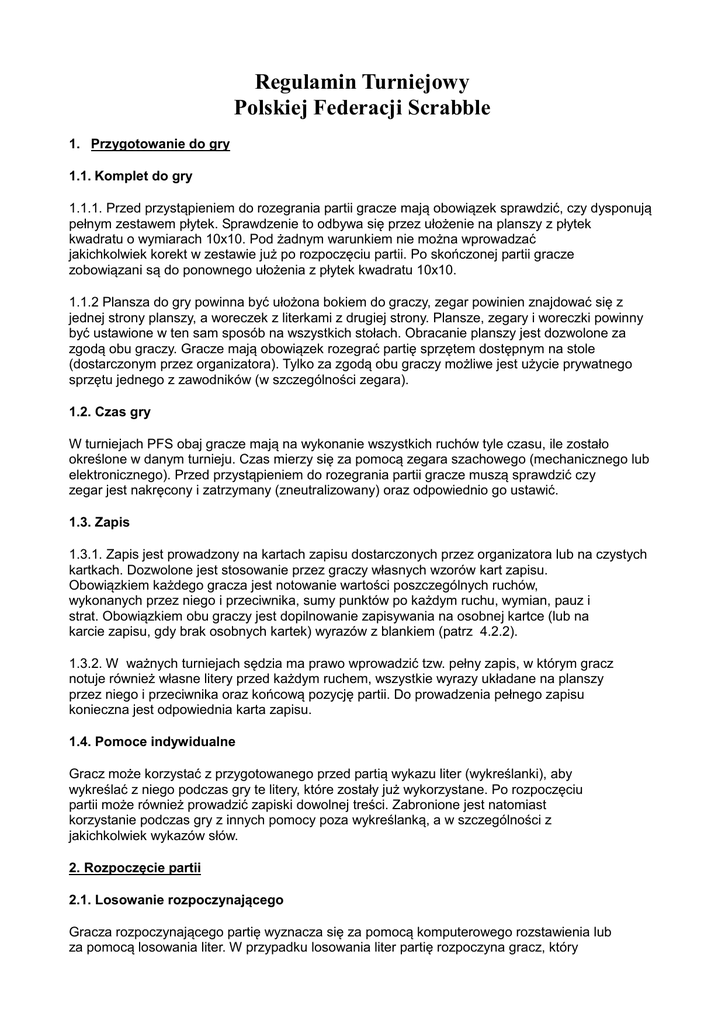 Regulamin Turniejowy Polskiej Federacji Scrabble 1. Przygotowanie do gry 1.1. Komplet do gry 1.1.1. Przed przystąpieniem do rozegrania partii gracze mają obowiązek sprawdzić, czy dysponują pełnym zestawem płytek. Sprawdzenie to odbywa się przez ułożenie na planszy z płytek kwadratu o wymiarach 10x10. Pod żadnym warunkiem nie można wprowadzać jakichkolwiek korekt w zestawie już po rozpoczęciu partii. Po skończonej partii gracze zobowiązani są do ponownego ułożenia z płytek kwadratu 10x10. 1.1.2 Plansza do gry powinna być ułożona bokiem do graczy, zegar powinien znajdować się z jednej strony planszy, a woreczek z literkami z drugiej strony. Plansze, zegary i woreczki powinny być ustawione w ten sam sposób na wszystkich stołach. Obracanie planszy jest dozwolone za zgodą obu graczy. Gracze mają obowiązek rozegrać partię sprzętem dostępnym na stole (dostarczonym przez organizatora). Tylko za zgodą obu graczy możliwe jest użycie prywatnego sprzętu jednego z zawodników (w szczególności zegara). 1.2. Czas gry W turniejach PFS obaj gracze mają na wykonanie wszystkich ruchów tyle czasu, ile zostało określone w danym turnieju. Czas mierzy się za pomocą zegara szachowego (mechanicznego lub elektronicznego). Przed przystąpieniem do rozegrania partii gracze muszą sprawdzić czy zegar jest nakręcony i zatrzymany (zneutralizowany) oraz odpowiednio go ustawić. 1.3. Zapis 1.3.1. Zapis jest prowadzony na kartach zapisu dostarczonych przez organizatora lub na czystych kartkach. Dozwolone jest stosowanie przez graczy własnych wzorów kart zapisu. Obowiązkiem każdego gracza jest notowanie wartości poszczególnych ruchów, wykonanych przez niego i przeciwnika, sumy punktów po każdym ruchu, wymian, pauz i strat. Obowiązkiem obu graczy jest dopilnowanie zapisywania na osobnej kartce (lub na karcie zapisu, gdy brak osobnych kartek) wyrazów z blankiem (patrz 4.2.2). 1.3.2. W ważnych turniejach sędzia ma prawo wprowadzić tzw. pełny zapis, w którym gracz notuje również własne litery przed każdym ruchem, wszystkie wyrazy układane na planszy przez niego i przeciwnika oraz końcową pozycję partii. Do prowadzenia pełnego zapisu konieczna jest odpowiednia karta zapisu. 1.4. Pomoce indywidualne Gracz może korzystać z przygotowanego przed partią wykazu liter (wykreślanki), aby wykreślać z niego podczas gry te litery, które zostały już wykorzystane. Po rozpoczęciu partii może również prowadzić zapiski dowolnej treści. Zabronione jest natomiast korzystanie podczas gry z innych pomocy poza wykreślanką, a w szczególności z jakichkolwiek wykazów słów. 2. Rozpoczęcie partii 2.1. Losowanie rozpoczynającego Gracza rozpoczynającego partię wyznacza się za pomocą komputerowego rozstawienia lub za pomocą losowania liter. W przypadku losowania liter partię rozpoczyna gracz, który wylosował literę bliższą początkowi alfabetu. Blank jest równoznaczny z literą „A”. W przypadku wylosowania jednakowych liter losowanie powtarza się do skutku. 2.2. Zajęcie miejsca przy stole W przypadku konfliktu między graczami co do zajmowanych przez nich miejsc przy stole prawo wyboru uzyskuje ten gracz, który wygra losowanie liter opisane w podpunkcie 2.1. 2.3. Dobieranie płytek Gracz, który wygrał losowanie, dobiera losowo z woreczka siedem płytek i układa je na stojaku. Podczas dobierania płytek woreczek należy trzymać na wysokości ramienia. Płytki należy dobierać bez ociągania się, w taki sposób, by w sumie nie wyciągnąć ich z woreczka więcej niż siedem. 2.4. Włączenie zegara w momencie rozpoczęcia gry Przeciwnik gracza rozpoczynającego włącza zegar w chwili, gdy gracz rozpoczynający zobaczył literę (lub blank) na pierwszej płytce, natomiast swoje siedem płytek dobiera z woreczka dopiero po włączeniu zegara. Włączenie zegara w tej sytuacji jest jednoznaczne z rozpoczęciem partii. Włączenie zegara graczowi nieobecnemu w chwili rozpoczęcia rundy nie rozpoczyna partii. 3. Ruch 3.1. Definicja ruchu. Ruch to: a. ruch zwykły lub b. wymiana lub c. pauza 3.2. Ruch zwykły 3.2.1. Na ruch zwykły składają się kolejno: a. ułożenie płytek na planszy b. ewentualne zdefiniowanie blanków; c. zatrzymanie zegara; d. podanie głośno wartości punktowej ruchu; e. ewentualne zakwestionowanie poprawności ruchu przez przeciwnika; f. zapisanie ruchu przez zawodnika (wartości punktowej danego ruchu i sumy punktów po ruchu); g. zapisanie ruchu przez przeciwnika lub zdjęcie skutecznie sprawdzonego wyrazu i zapisanie straty zawodnika przez obu graczy ; h. włączenie zegara przeciwnikowi; i. dobranie płytek j. ewentualne wykreślenie liter na wykreślance. 3.2.2. Kolejność podpunktów e) i f) może być odwrotna. 3.2.3. W szczególnym przypadku ruch zwykły może zakończyć się stratą (czyli pominięciem ruchu). Powodem może być nieistniejące słowo skutecznie zakwestionowane przez Przeciwnika lub ułożenie płytek na planszy niezgodne z zasadami gry (odizolowana litera lub słowo, rozpoczęcie partii z pominięciem środkowego pola itp.) 3.3. Wymiana Na wymianę składają się kolejno: a. zgłoszenie wymiany; b. zdjęcie wymienianych płytek ze stojaka; c. zatrzymanie zegara; d. zapisanie wymiany przez obu zawodników; e. włączenie zegara przeciwnikowi; f. dobranie płytek; g. wrzucenie wymienianych płytek do worka. 3.4. Pauza 3.4.1. Zawodnik, na którego przypada posunięcie zawsze może zgłosić pauzę. 3.4.2. Zawodnik zgłaszający pauzę mówi „pauza”, wyłącza zegar na czas zapisania pauzy przez obu graczy, a następnie włącza zegar przeciwnika. 3.4.3. Cztery kolejne pauzy oznaczają zakończenie partii. Wymiana ani strata kolejki nie jest pauzą. 3.4.4. W szczególnym przypadku pauza może być wymuszona ze względu na upłynięcie czasu na całą partię lub dany ruch, decyzję sędziego itp. 4. Elementy ruchu Uwaga: W opisach wykonywanych czynności poszczególne słowa oznaczaj