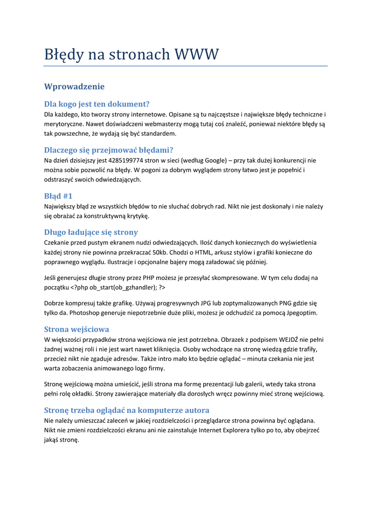 Błędy na stronach WWW Wprowadzenie Dla kogo jest ten dokument? Dla każdego, kto tworzy strony internetowe. Opisane są tu najczęstsze i największe błędy techniczne i merytoryczne. Nawet doświadczeni webmasterzy mogą tutaj coś znaleźd, ponieważ niektóre błędy są tak powszechne, że wydają się byd standardem. Dlaczego się przejmować błędami? Na dzieo dzisiejszy jest 4285199774 stron w sieci (według Google) – przy tak dużej konkurencji nie można sobie pozwolid na błędy. W pogoni za dobrym wyglądem strony łatwo jest je popełnid i odstraszyd swoich odwiedzających. Błąd #1 Największy błąd ze wszystkich błędów to nie słuchad dobrych rad. Nikt nie jest doskonały i nie należy się obrażad za konstruktywną krytykę. Długo ładujące się strony Czekanie przed pustym ekranem nudzi odwiedzających. Ilośd danych koniecznych do wyświetlenia każdej strony nie powinna przekraczad 50kb. Chodzi o HTML, arkusz stylów i grafiki konieczne do poprawnego wyglądu. Ilustracje i opcjonalne bajery mogą załadowad się później. Jeśli generujesz długie strony przez PHP możesz je przesyład skompresowane. W tym celu dodaj na początku <?php ob_start(ob_gzhandler); ?> Dobrze kompresuj także grafikę. Używaj progresywnych JPG lub zoptymalizowanych PNG gdzie się tylko da. Photoshop generuje niepotrzebnie duże pliki, możesz je odchudzid za pomocą Jpegoptim. Strona wejściowa W większości przypadków strona wejściowa nie jest potrzebna. Obrazek z podpisem WEJDŹ nie pełni żadnej ważnej roli i nie jest wart nawet kliknięcia. Osoby wchodzące na stronę wiedzą gdzie trafiły, przecież nikt nie zgaduje adresów. Także intro mało kto będzie oglądad – minuta czekania nie jest warta zobaczenia animowanego logo firmy. Stronę wejściową można umieścid, jeśli strona ma formę prezentacji lub galerii, wtedy taka strona pełni rolę okładki. Strony zawierające materiały dla dorosłych wręcz powinny mied stronę wejściową. Stronę trzeba oglądać na komputerze autora Nie należy umieszczad zaleceo w jakiej rozdzielczości i przeglądarce strona powinna byd oglądana. Nikt nie zmieni rozdzielczości ekranu ani nie zainstaluje Internet Explorera tylko po to, aby obejrzed jakąś stronę. Strona w budowie Odwiedzających doskonale odstrasza napis strona w budowie albo martwe linki. Nawet, jeśli strona zawiera bardzo dużo treści zostanie uznana niekompletną i nie wartą oglądania. Odwiedzający, który natknie się na niedziałający link lub gorzej – prowadzący do pustej strony zrezygnuje z dalszego oglądania zakładając, że pozostałe linki też nie będą działad. ISO 1250 Dla polskich znaków jest tylko jeden obowiązujący standard kodowania stron WWW: ISO—8859-2. Ewentualnie można użyd uniwersalnego UTF—8. Kodowanie znaków Windows (słusznie) nie zostało uznane jako standard i dla reszty świata znaczy on tyle samo, co kodowanie Zdzichu3000. Taki tag meta powinien byd umieszczony sekcji head strony: <META HTTP-EQUIV=Content-Type CONTENT=text/html; charset=ISO—8859-2">. Oczywiście sama deklaracja to za mało. Znaki muszą byd napisane w tym kodowaniu. Animacje Animacje mają negatywny wpływ na odbiór strony. Po pierwsze kojarzą się z reklamą. Po drugie rozpraszają i przeszkadzają w dłuższym czytaniu strony. Kręcący się znaczek @ (czyt. at) opatrzył się już każdemu internaucie. Pomrugujące logo we Flash jest cool najwyżej przez 3 sekundy. Tylko Flash Flash nie nadaje się do robienia w nim całych stron. Takie strony bardzo ciężko się ogląda – tekst jest rozmyty (albo poszarpany, zależnie od ustawieo, ale prawie nigdy czytelny). Poruszanie się po stronie jest utrudnione – nie działają kółka myszy, nie ma możliwości otworzenia linku w nowym oknie, a często wciśnięcie Wstecz wychodzi ze strony. Aby strona była wyraźna i użyteczna tekst i linki muszą byd zrobione w HTML. Wyjątek stanowią strony, które prawie w całości składają się z grafiki, np.: prezentacje, filmiki. Pop-upy i nowe okna Należy unikad stosowania okienek pop-up (stosowanie ich do otworzenia strony w oknie np. 800x600 jest kardynalnym błędem). Dziś prawie wszystkie przeglądarki je blokują i (jeśli pop-up nie był zrobiony poprawnie) uniemożliwiają skorzystanie ze strony. Coraz popularniejsze są przeglądarki oferujące przeglądanie w kartach (tabach), a w nich otwieranie nowych okien więcej utrudnia niż ułatwia. Nowe okno przeglądarki utrudni dostęp do kart w poprzednim oknie. Jeśli przeglądarka zamiast okien otwiera karty, to i tak przycisk wstecz na nowej karcie nie będzie działał. javascript:(void) Javascript nie jest zły do szpiku kości, tylko większośd twórców stron nie jest programistami i na ślepo kopiuje skrypty, które ktoś skopiował od kogoś, kto ledwo je zmontował na przykładzie cudzego skopiowanego skryptu. Skrypty po przejściu przez taki głuchy telefon są żenującej jakości i więcej z nich szkody, niż pożytku. Trzeba pamiętad, że na Javascript nie można polegad. Użytkownicy coraz częściej wyłączają Javascript, czasem ze względu na bezpieczeostwo, czasem by pozbyd się atakujących zewsząd reklam i w koocu by nie oglądad padającego śniegu na stronie albo serduszek latających za kursorem. Wyszukiwarki internetowe indeksujące strony nie rozumieją Javascriptu – wszelkie elementy oparte o niego nie zostaną zindeksowane tym samym zmniejszając szanse strony na bycie znalezioną (to się tyczy również Flash). Dlatego strona musi działad przy wyłączonym (nieobsługiwanym) Javascripcie. Oznacza to użycie odpowiedniego menu i zastąpienie idiotycznych pseudo-URLi javascript: lepszym rozwiązaniem. Nie połam sobie spacji Prawie nikt nie potrafi poprawnie użyd (od ang. non-breaking space, po polsku twarda spacja). Ten znak NIE służy do robienia wielkich odstępów (żadnych obiektów nie powinno się wyrównywad spacjami), NIE służy też d