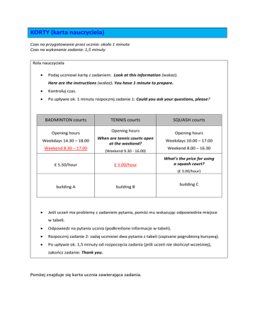 KORTY (karta nauczyciela) Czas na przygotowanie przez ucznia: około 1 minuta Czas na wykonanie zadania: 1,5 minuty Rola nauczyciela Podaj uczniowi kartę z zadaniem: Look at this information (wskaż). Here are the instructions (wskaż). You have 1 minute to prepare. Kontroluj czas. Po upływie ok. 1 minuty rozpocznij zadanie 1: Could you ask your questions, please? BADMINTON courts TENNIS courts Opening hours Opening hours Weekdays 14.30 – 18.00 SQUASH courts When are tennis courts open at the weekend? Weekend 8.30 – 17.00 £ 5.50/hour (Weekend 9.30 - 16.00) £ 5.00/hour Opening hours Weekdays 10.00 – 17.00 Weekend 8.00 – 16.30 What’s the price for using a squash court? (£ 3.00/hour) building A building B building C Jeśli uczeń ma problemy z zadaniem pytania, pomóż mu wskazując odpowiednie miejsce w tabeli. Odpowiedz na pytania ucznia (podkreślone informacje w tabeli). Rozpocznij zadanie 2: zadaj uczniowi dwa pytania z tabeli (zapisane pogrubioną kursywą). Po upływie ok. 1,5 minuty od rozpoczęcia zadania (jeśli uczeń nie skończył wcześniej), zakończ zadanie: Thank you. Poniżej znajduje się karta ucznia zawierająca zadania. KORTY (karta ucznia) Masz 1 minutę na przygotowanie się do tego zadania. Zapoznaj się z informacjami podanymi w poniższej tabelce. BADMINTON courts TENNIS courts SQUASH courts Opening hours Opening hours Opening hours Weekdays 14.30 – 18.00 Weekdays 12.30 – 17.00 Weekdays 10.00 – 17.00 Weekend (a) ? Weekend 9.30 - 16.00 Weekend 8.00 – 16.30 £ 5.50/hour (b) ? £ 3.00/hour building A building B building C Zadanie 1. Zadaj nauczycielowi dwa pytania o brakujące informacje oznaczone w tabeli znakami zapytania (?). Zapytaj o: (a) brakujące godziny otwarcia (b) brakującą cenę wynajęcia kortu Zadanie 2. Korzystając z informacji w tabeli, odpowiedz na dwa pytania, które zada Ci nauczyciel.