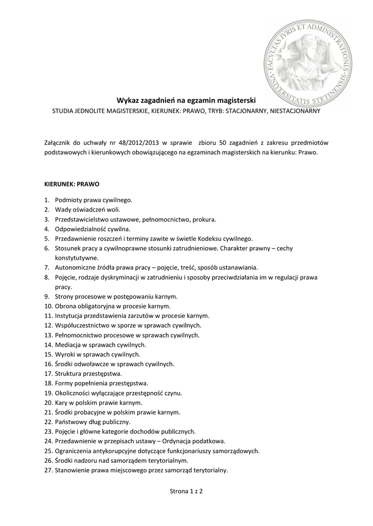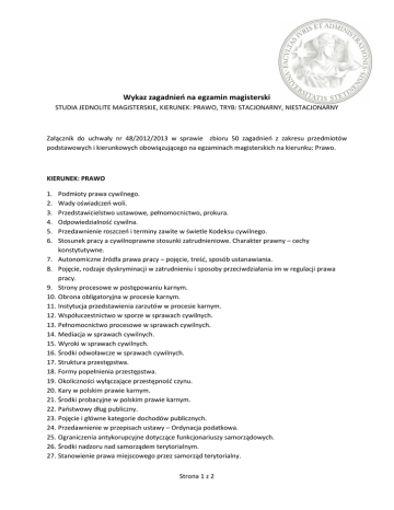 Wykaz zagadnień na egzamin magisterski STUDIA JEDNOLITE MAGISTERSKIE, KIERUNEK: PRAWO, TRYB: STACJONARNY, NIESTACJONARNY Załącznik do uchwały nr 48/2012/2013 w sprawie zbioru 50 zagadnień z zakresu przedmiotów podstawowych i kierunkowych obowiązującego na egzaminach magisterskich na kierunku: Prawo. KIERUNEK: PRAWO 1. 2. 3. 4. 5. 6. Podmioty prawa cywilnego. Wady oświadczeń woli. Przedstawicielstwo ustawowe, pełnomocnictwo, prokura. Odpowiedzialność cywilna. Przedawnienie roszczeń i terminy zawite w świetle Kodeksu cywilnego. Stosunek pracy a cywilnoprawne stosunki zatrudnieniowe. Charakter prawny – cechy konstytutywne. 7. Autonomiczne źródła prawa pracy – pojęcie, treść, sposób ustanawiania. 8. Pojęcie, rodzaje dyskryminacji w zatrudnieniu i sposoby przeciwdziałania im w regulacji prawa pracy. 9. Strony procesowe w postępowaniu karnym. 10. Obrona obligatoryjna w procesie karnym. 11. Instytucja przedstawienia zarzutów w procesie karnym. 12. Współuczestnictwo w sporze w sprawach cywilnych. 13. Pełnomocnictwo procesowe w sprawach cywilnych. 14. Mediacja w sprawach cywilnych. 15. Wyroki w sprawach cywilnych. 16. Środki odwoławcze w sprawach cywilnych. 17. Struktura przestępstwa. 18. Formy popełnienia przestępstwa. 19. Okoliczności wyłączające przestępność czynu. 20. Kary w polskim prawie karnym. 21. Środki probacyjne w polskim prawie karnym. 22. Państwowy dług publiczny. 23. Pojęcie i główne kategorie dochodów publicznych. 24. Przedawnienie w przepisach ustawy – Ordynacja podatkowa. 25. Ograniczenia antykorupcyjne dotyczące funkcjonariuszy samorządowych. 26. Środki nadzoru nad samorządem terytorialnym. 27. Stanowienie prawa miejscowego przez samorząd terytorialny. Strona 1 z 2 28. Prawne formy działania administracji publicznej. 29. Podmioty realizujące zadania administracji publicznej. 30. Podział terytorialny państwa dla potrzeb administracji publicznej. 31. Uznanie administracyjne. 32. Decyzje i postanowienia w ogólnym postępowaniu administracyjnym. 33. Zasady odpowiedzialności za szkodę w środowisku. 34. Typy zadań administracji publicznej w ochronie środowiska. 35. System źródeł prawa według Konstytucji Rzeczypospolitej Polskiej. 36. Parlament w RP (struktura, organizacja, funkcje i tryb działania). 37. Pozycja ustrojowa i kompetencje Prezydenta w Konstytucji Rzeczypospolitej Polskiej z 2 kwietnia 1997 r. 38. Karta Praw Podstawowych Unii Europejskiej. 39. Zasada subsydiarności w działaniu Unii Europejskiej. 40. Charakter prawny Unii Europejskiej. 41. Źródła prawa międzynarodowego publicznego. 42. Wolność gospodarcza. 43. Społeczna gospodarka rynkowa. 44. System prawnej ochrony konkurencji w Polsce. 45. Prawo a inne normy społeczne (moralne, zwyczajowe, religijne, organizacji społecznych). 46. System prawny i porządek prawny. 47. Przestrzeganie prawa a stosowanie prawa. 48. Zasady redagowania tekstów prawnych. 49. Wykładnia prawa i wnioskowanie prawnicze. 50. Cechy charakterystyczne prawa zwyczajowego w średniowiecznej Europie Strona 2 z 2