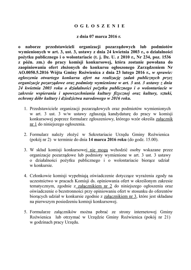 O G Ł O S Z E N I E z dnia 07 marca 2016 r. o naborze przedstawicieli organizacji pozarządowych lub podmiotów wymienionych w art. 3, ust. 3, ustawy z dnia 24 kwietnia 2003 r., o działalności pożytku publicznego i o wolontariacie (t. j. Dz. U. z 2010 r., Nr 234, poz. 1536 z późn. zm.) do pracy komisji konkursowej, która zostanie powołana do zaopiniowania ofert złożonych do konkursu ogłoszonego Zarządzeniem Nr AO.0050.5.2016 Wójta Gminy Roźwienica z dnia 23 lutego 2016 r., w sprawie: ogłoszenia otwartego konkursu ofert na realizację zadań publicznych przez organizacje pozarządowe oraz podmioty wymienione w art. 3 ust. 3 ustawy z dnia 24 kwietnia 2003 roku o działalności pożytku publicznego i o wolontariacie w zakresie wspierania i upowszechniania kultury fizycznej oraz kultury, sztuki, ochrony dóbr kultury i dziedzictwa narodowego w 2016 roku. 1. Przedstawiciele organizacji pozarządowych oraz podmiotów wymienionych w art. 3 ust. 3 w/w ustawy zgłaszają kandydaturę do pracy w komisji konkursowej poprzez formularz zgłoszeniowy, którego wzór określa załącznik nr 1 do niniejszego ogłoszenia. 2. Formularz należy złożyć w Sekretariacie Urzędu Gminy Roźwienica (pokój nr 2) w terminie do dnia 14 marca 2016 roku (do godz. 15.00). 3. W skład komisji konkursowej nie mogą wchodzić osoby wskazane przez organizacje pozarządowe lub podmioty wymienione w art. 3 ust. 3 ustawy o działalności pożytku publicznego i o wolontariacie biorące udział w konkursie. 4. Członkowie komisji wypełniają oświadczenie dotyczące wyrażenia zgody na uczestnictwo w pracach Komisji ds. opiniowania ofert w określonym zakresie tematycznym, zgodnie z załącznikiem nr 2 do niniejszego ogłoszenia oraz oświadczenie o bezstronności przy opiniowaniu ofert w stosunku do oferentów biorących udział w konkursie zgodnie z załącznikiem nr 3, które jest składane na pierwszym posiedzeniu komisji konkursowej. 5. Formularze załączników można pobrać ze strony internetowej Gminy Roźwienica lub otrzymać w Urzędzie Gminy Roźwienica (pokój nr 21) w godzinach pracy Urzędu. Załącznik nr 1 do Ogłoszenia z dnia 07.03.2016r. Formularz zgłoszeniowy kandydata do prac w komisji konkursowej powołanej przez Wójta Gminy Roźwienica do opiniowania ofert złożonych w otwartym konkursie ofert na realizację zadań publicznych Informacje o kandydacie 1.Imię i nazwisko kandydata na członka komisji konkursowej: 2.Data urodzenia (dd/mm/rrrr): 3.Adres kontaktowy kandydata: Miejscowość, nr domu/lokalu: Kod pocztowy: Telefon/fax: Miejscowość: Adres e-mail: 4. Opis doświadczenia kandydata na członka komisji w zakresie działalności organizacji/podmiotów wymienionych w art.3 ust.3 ustawy o działalności pożytku publicznego i o wolontariacie: (Kandydat musi posiadać co najmniej 3-letnie doświadczenie w zakresie działalności na rzecz organizacji pozarządowych lub podmiotów wymienionych w art. 3 ust. 3 ustawy o działalności pożytku publicznego i o wolontariacie. Należy tu wpisać datę rozpoczęcia w/w działalności i krótki opis). 5.Kandydat zgłasza udział w pracach komisji konkursowej w sferach zadań publicznych (zgodnie z art. 4 ust.1 ustawy). Proszę zaznaczyć właściwy(e) punkt(y) wstawiając „x”: Pomoc społeczna, w tym pomoc rodzinom i osobom w trudnej sytuacji życiowej oraz wyrównywanie szans tych rodzin i osób Działalność na rzecz integracji i reintegracji zawodowej i społecznej osób zagrożonych wykluczeniem społecznym Działalność charytatywna Podtrzymywanie i upowszechnianie tradycji narodowej, pielęgnowanie polskości oraz rozwoju świadomości narodowej, obywatelskiej i kulturowej Działalność na rzecz mniejszości narodowych i etnicznych oraz języka regionalnego Ochrona i promocja zdrowia Działalność na rzecz osób niepełnosprawnych Promocja zatrudnienia i aktywacji zawodowej osób pozostających bez pracy i zagrożonych zwolnieniem z pracy Działalność na rzecz równych praw kobiet i mężczyzn Działalność na rzecz osób w wieku emerytalnym Działalność wspomagająca rozwój gospodarczy, w tm rozwój przedsiębiorczości Działalność wspomagająca rozwój techniki, wynalazczości i innowacyjności oraz rozpowszechnianie i wdrażanie nowych rozwiązań technicznych w praktyce gospodarczej Działalność wspomagająca rozwój wspólnot i społeczności lokalnych Nauka, szkolnictwo wyższe, edukacja, oświata i wychowanie Wypoczynek dzieci i młodzieży Kultura, sztuka, ochrona dóbr kultury i dziedzictwa narodowego Wspieranie i upowszechnianie kultury fizycznej Ekologia i ochrona zwierząt oraz ochrona dziedzictwa przyrodniczego Turystyka i krajoznawstwo Porządek i bezpieczeństwo publiczne Obronność państwa i działalność Sił Zbrojnych RP Upowszechnianie i ochrona wolności i praw człowieka oraz swobód obywatelskich, a także działania wspomagające rozwój demokracji Ratownictwo i ochrona ludności Pomoc ofiarom katastrof, klęsk żywiołowych, konfliktów zbrojnych i wojen w kraju i za granicą Upowszechnianie i ochrona praw konsumentów Działalność na rzecz integracji europejskiej oraz rozwijania kontaktów i współpracy między społeczeństwami Promocja i organizacja wolontariatu Pomoc Polonii i Polakom za granicą Działalność na rzecz kombatantów i osób represjonowanych Promocja Rzeczypospolitej Polskiej za granicą Działalność na rzecz rodziny, macierzyństwa, rodzicielstwa, upowszechniania i ochrony praw dziecka Przeciwdziałanie uzależnieniom i patologiom społecznym Działalność na rzecz organizacji pozarządowych oraz podmiotów wymienionych w art.3 ust.3, w zakresie określonym w pkt 1-32 Oświadczam że: 1. Jestem obywatelem RP i korzystam z pełni praw publicznych. 2. Deklaruję o prawdziwości podanych wyżej danych i zgodnie z ustawą z dnia 29.08.1997r. o ochronie danych osobowych (j. t. Dz. U. z 2002r., Nr 101, poz.926 z póżn zm.) wyrażam zgodę na przetwarzanie moich dan