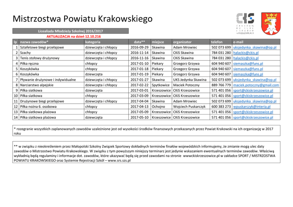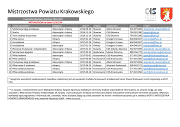 Mistrzostwa Powiatu Krakowskiego lp 1 2 3 4 5 6 7 8 9 10 11 12 13 14 Licealiada Młodzieży Szkolnej 2016/2017 AKTUALIZACJA na dzień 12.10.216 nazwa zawodów* kategoria Sztafetowe biegi przełajowe dziewczęta i chłopcy Szachy dziewczęta i chłopcy Tenis stołowy drużynowy dziewczęta i chłopcy Piłka ręczna chłopcy Koszykówka chłopcy Koszykówka dziewczęta Pływanie drużynowe i indywidualne dziewczęta i chłopcy Narciarstwo alpejskie dziewczęta i chłopcy Piłka siatkowa dziewczęta Piłka siatkowa chłopcy Drużynowe biegi przełajowe dziewczęta i chłopcy Piłka nożna 6. osobowa chłopcy Piłka siatkowa plażowa chłopcy Piłka siatkowa plażowa dziewczęta data** 2016-09-29 2016-11-14 2016-11-16 2017-01-10 2017-01-18 2017-01-19 2017-01-27 2017-02-22 2017-03-01 2017-03-09 2017-04-04 2017-04-13 2017-05-09 2017-05-10 miejsce Skawina Skawina Skawina Piekary Piekary Piekary Skawina Spytkowice Krzeszowice Krzeszowice Skawina Ochojno Krzeszowice Krzeszowice organizator Adam Mrowiec CKiS Skawina CKiS Skawina Grzegorz Grzywa Grzegorz Grzywa Grzegorz Grzywa UKS Jedynka Skawina Maciek Potoczny CKiS Krzeszowice CKiS Krzeszowice Adam Mrowiec Wojciech Puskarczyk CKiS Krzeszowice CKiS Krzeszowice telefon 502 073 699 784 031 280 784 031 280 604 940 607 604 940 607 604 940 607 502 073 699 889 766 779 571 401 056 571 401 056 502 073 699 600 383 273 571 401 056 571 401 056 e-mail [email protected] [email protected] [email protected] [email protected] [email protected] [email protected] [email protected] [email protected] [email protected] [email protected] [email protected] [email protected] [email protected] [email protected] * rozegranie wszystkich zaplanowanych zawodów uzależnione jest od wysokości środków finansowych przekazanych przez Powiat Krakowski na ich organizację w 2017 roku ** w związku z nieokreśleniem przez Małopolski Szkolny Związek Sportowy dokładnych terminów finałów wojewódzkich informujemy, że zmianie mogą ulec daty zawodów o Mistrzostwo Powiatu Krakowskiego. W związku z tym powyższym niniejszy terminarz jest jedynie wskazaniem ewentualnych terminów zawodów. Właściwą wykładnią będą regulaminy i informacje dot. zawodów, które ukazywać będą się przed zawodami na stronie wwwckiskrzeszowice.pl w zakładce SPORT / MISTRZOSTWA POWIATU KRAKOWSKIEGO oraz Systemie Rejestracji Szkół – www.srs.szs.pl