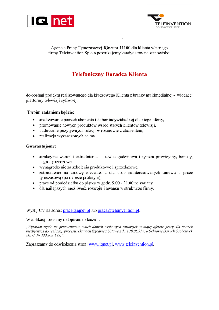 . Agencja Pracy Tymczasowej IQnet nr 11100 dla klienta własnego firmy Teleinvention Sp.o.o poszukujemy kandydatów na stanowisko: Telefoniczny Doradca Klienta do obsługi projektu realizowanego dla kluczowego Klienta z branży multimedialnej - wiodącej platformy telewizji cyfrowej. Twoim zadaniem będzie: analizowanie potrzeb abonenta i dobór indywidualnej dla niego oferty, promowanie nowych produktów wśród stałych klientów telewizji, budowanie pozytywnych relacji w rozmowie z abonentem, realizacja wyznaczonych celów. Gwarantujemy: atrakcyjne warunki zatrudnienia – stawka godzinowa i system prowizyjny, bonusy, nagrody rzeczowe, wynagrodzenie za szkolenia produktowe i sprzedażowe, zatrudnienie na umowę zlecenie, a dla osób zainteresowanych umowa o pracę tymczasową (po okresie próbnym), pracę od poniedziałku do piątku w godz. 9.00 - 21.00 na zmiany dla najlepszych możliwość rozwoju i awansu w strukturze firmy. Wyślij CV na adres: [email protected] lub [email protected]. W aplikacji prosimy o dopisanie klauzuli: „Wyrażam zgodę na przetwarzanie moich danych osobowych zawartych w mojej ofercie pracy dla potrzeb niezbędnych do realizacji procesu rekrutacji (zgodnie z Ustawą z dnia 29.08.97 r. o Ochronie Danych Osobowych Dz. U. Nr 133 poz. 883)". Zapraszamy do odwiedzenia stron: www.iqnet.pl, www.teleinvention.pl,