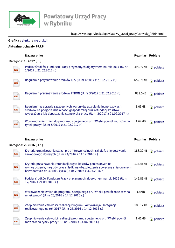 http://www.pup-rybnik.pl/powiatowy_urzad_pracy/uchwaly_PRRP.html Grafika : drukuj / nie drukuj Aktualne uchwały PRRP Nazwa pliku Rozmiar Pobierz Kategoria: 1. 2017 [ 5 ] Podział środków Funduszu Pracy przyznanych algorytmem na rok 2017 (U. nr 1/2017 z 21.02.2017 r.) 492.72KB pobierz Regulamin przyznawania środków KFS (U. nr 4/2017 z 21.02.2017 r.) 652.78KB pobierz Regulamin przyznawania środków PFRON (U. nr 3/2017 z 21.02.2017 r.) 882.5KB pobierz Regulamin w sprawie szczególnych warunków udzielania jednorazowych środków na podjęcie działalności gospodarczej oraz refundacji kosztów wyposażenia lub doposażenia stanowiska pracy (U. nr 2/2017 z 21.02.2017 r.) 1.03MB pobierz Wprowadzenie zmian do programu specjalnego pn. "Wielki powrót rodziców na rynek pracy" (U. nr 5/2017 z 21.02.2017 r.) 1.64MB pobierz Nazwa pliku Rozmiar Pobierz Kategoria: 2. 2016 [ 12 ] Kryteria organizowania staży, prac interwencyjnych, szkoleń, przygotowania zawodowego dorosłych (U. nr 24/2016 z 14.12.2016 r.) 188.32KB pobierz Kryteria przyznawania refundacji części kosztów poniesionych na wynagrodzenia, nagrody oraz składki na ubezpieczenia społeczne skierowanych bezrobotnych do 30 roku życia (U. nr 2/2016 z 4.03.2016 r.) 114.46KB pobierz Podział środków Funduszu Pracy przyznanych algorytmem na rok 2016 (U. nr 12/2016 z 21.09.2016 r.) 149.89KB pobierz 1.4MB pobierz 186.12KB pobierz 1.41MB pobierz Wprowadzenie zmian do programu specjalnego pn. "Wielki powrót rodziców na rynek pracy" (U. nr 25/2016 z 14.12.2016 r.) Zaopiniowanie celowości realizacji Programu Aktywizacja i Integracja realizowanego na rok 2017 (U. nr 26/2016 z 14.12.2016 r.) Zaopiniowanie celowości realizacji programu specjalnego pn. "Wielki powrót rodziców na rynek pracy" (U. nr 9/2016 z 14.06.2016 r.) Zaopiniowanie wniosku Gimnazjum nr 5 im Władysława Webera w Rybniku dot. 413.22KB sfinansowania kosztów kształcenia ustawicznego w ramach KFS (U. nr 13/2016 z 21.09.2016 r.) pobierz Zaopiniowanie wniosku IV LO im. Mikołaja Kopernika w Rybniku dot. sfinansowania kosztów kształcenia ustawicznego w ramach KFS (U. nr 14/2016 z 21.09.2016 r.) 54.15KB pobierz Zaopiniowanie wniosku Przedszkola z Oddziałami Integracyjnymi nr 39 w Rybniku dot. sfinansowania kosztów kształcenia ustawicznego w ramach KFS (U. nr 4/2016 z 4.03.2016 r.) 48.24KB pobierz Zaopiniowanie wniosku Specjalnego Zespołu Szkolno-Przedszkolnego w Rybniku dot. sfinansowania kosztów kształcenia ustawicznego w ramach KFS (U. nr 5/2016 z 4.03.2016 r.) 50.8KB pobierz Zaopiniowanie wniosku Zespołu Szkół Ekonomiczno-Usługowych w Rybniku dot. uruchomienia nowego kierunku kształcenia (U. nr 27/2016 z 14.12.2016 r.) 36.12KB pobierz Zaopiniowanie wniosku ZS nr 6 w Rybniku - Zasadniczej Szkoły Zawodowej Specjalnej dot. uruchomienia nowego kierunku kształcenia (U. nr 28/2016 z 14.12.2016 r.) 35.65KB pobierz Nazwa pliku Rozmiar Pobierz Kategoria: 3. 2015 [ 12 ] Regulamin przyznawania środków PFRON (U. nr 3/2015 z 27.02.2015 r.) 249.99KB pobierz 1.2MB pobierz Zaopiniowanie celowości realizacji Programu Aktywizacja i Integracja realizowanego na 2016 r. (U. nr 22/2015 z 15.12.2015 r.) 512.37KB pobierz Zaopiniowanie celowości realizacji Programu Aktywizacja i Integracja realizowanego przez PUP Rybnik (U. nr 2/2015 z 27.03.2015 r.) 262.31KB pobierz Zaopiniowanie wniosku RCEZ-CKUoP dot. uruchomienia nowego kierunku kształcenia (U. nr 5/2015 z 27.03.2015 r.) 1.05MB pobierz Zaopiniowanie wniosku Szkoły Policealnej dla Dorosłych nr 6 w RCEZ dot. utworzenia nowego kierunku kształcenia (U. nr 21/2015 z 15.12.2015 r.) 409.58KB pobierz Zaopiniowanie wniosku Zespołu Szkół Ekonomiczno-Usługowych w Rybniku dot. utworzenia nowego kierunku kształcenia (U. nr 8/2015 z 27.03.2015 r.) 52.98KB pobierz Zaopiniowanie wniosku ZS nr 5 im. Józefa Rymera w Rybniku dot. uruchomienia nowego kierunku kształcenia (U. nr 6/2015 z 27.03.2015 r.) 50.58KB pobierz Zaopiniowanie wniosku ZS w Czerwionce-Leszczynach dot. utworzenia nowego kierunku kształcenia (U. nr 10/2015 z 27.03.2015 r.) 49.55KB pobierz Regulamin w sprawie szczegółowych warunków udzielania jednorazowych środków na podjęcie działalności gospodarczej oraz refundacji kosztów wyposażenia lub doposażenia stanowiska pracy (U. nr 17/2015 z 23.09.2015 r.) Zaopiniowanie wniosku ZST w Rybniku dot. utworzenia nowego kierunku kształcenia (U. nr 9/2015 z 27.03.2015 r.) 60.97KB pobierz Zaopiniowanie wniosku ZST w Rybniku dot. utworzenia nowych kierunków kształcenia (U. nr 20/2015 z 15.12.2015 r.) 397.03KB pobierz Zaopiniowanie wniosku ZSZ Izby Rzemieślniczej w Rybniku dot. uruchomienia nowych kierunków kształcenia (U. nr 7/2015 z 27.03.2015 r.) 74.91KB pobierz Nazwa pliku Rozmiar Pobierz Kategoria: 4. 2014 [ 2 ] Szczegółowy tryb dofinansowania z Funduszu Pracy kosztów studiów podyplomowych (U. nr 2/2014 z 10.03.2014 r.) 494.35KB pobierz Zaopiniowanie kierunków kształcenia w Zespole Szkół Mechaniczno-Elektrycznych im. Tadeusza Kościuszki w Rybniku (U. nr 5/2014 z 10.08.2014 r.) 26.36KB pobierz Nazwa pliku Rozmiar Pobierz Kategoria: 5. 2013 [ 2 ] Zaopiniowanie kierunków kształcenia w rybnickich szkołach (U. nr 2/2013 z 16.04.2013 r.) Zaopiniowanie kierunków kształcenia w Zespole Szkół w Czerwionce-Leszczynach (U. nr 3/2013 z 16.04.2013 r.) 2.3MB pobierz 344.92KB pobierz