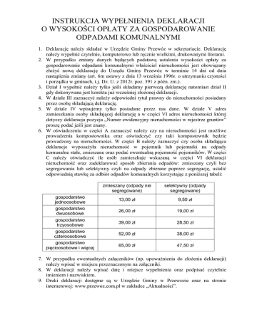 INSTRUKCJA WYPEŁNIENIA DEKLARACJI O WYSOKOŚCI OPŁATY ZA GOSPODAROWANIE ODPADAMI KOMUNALNYMI 1. Deklarację należy składać w Urzędzie Gminy Przewóz w sekretariacie. Deklarację należy wypełnić czytelnie, komputerowo lub ręcznie wielkimi, drukowanymi literami. 2. W przypadku zmiany danych będących podstawą ustalenia wysokości opłaty za gospodarowanie odpadami komunalnymi właściciel nieruchomości jest obowiązany złożyć nową deklarację do Urzędu Gminy Przewóz w terminie 14 dni od dnia nastąpienia zmiany (art. 6m ustawy z dnia 13 września 1996r. o utrzymaniu czystości i porządku w gminach, t.j. Dz. U. z 2012r. poz. 391 z późn. zm.). 3. Dział I wypełnić należy tylko jeśli składamy pierwszą deklarację natomiast dział II gdy dokonywana jest korekta już wcześniej złożonej deklaracji. 4. W dziale III zaznaczyć należy odpowiedni tytuł prawny do nieruchomości posiadany przez osobę składającą deklarację. 5. W dziale IV wpisujemy tylko posiadane przez nas dane. W dziale V adres zamieszkania osoby składającej deklarację a w części VI adres nieruchomości której dotyczy deklaracja pozycja „Numer ewidencyjny nieruchomości w rejestrze gruntów” proszę podać jeśli jest znany. 6. W oświadczeniu w części A zaznaczyć należy czy na nieruchomości jest możliwe prowadzenia kompostownika oraz oświadczyć czy taki kompostownik będzie prowadzony na nieruchomości. W części B należy zaznaczyć czy osoba składająca deklaracje wyposażyła nieruchomość w pojemnik lub pojemniki na odpady komunalne stałe, zmieszane oraz podać ewentualną pojemność pojemników. W części C należy oświadczyć ile osób zamieszkuje wskazaną w części VI deklaracji nieruchomość oraz zadeklarować sposób zbierania odpadów: zmieszany czyli bez segregowania lub selektywny czyli na odpady zbierane poprzez segregację, ustalić odpowiednią stawkę za odbiór odpadów komunalnych korzystając z poniższej tabeli: gospodarstwo jednoosobowe gospodarstwo dwuosobowe gospodarstwo trzyosobowe gospodarstwo czteroosobowe gospodarstwo pięcioosobowe i więcej zmieszany (odpady nie segregowane) selektywny (odpady segregowane) 13,00 zł 9,50 zł 26,00 zł 19,00 zł 39,00 zł 28,50 zł 52,00 zł 38,00 zł 65,00 zł 47,50 zł 7. W przypadku ewentualnych załączników (np. upoważnienia do złożenia deklaracji) należy wpisać w miejscu przeznaczonym na załączniki. 8. W deklaracji należy wpisać datę i miejsce wypełnienia oraz podpisać czytelnie imieniem i nazwiskiem. 9. Druki deklaracji dostępne są w Urzędzie Gminy w Przewozie oraz na stronie internetowej: www.przewoz.com.pl w zakładce „Aktualności”.