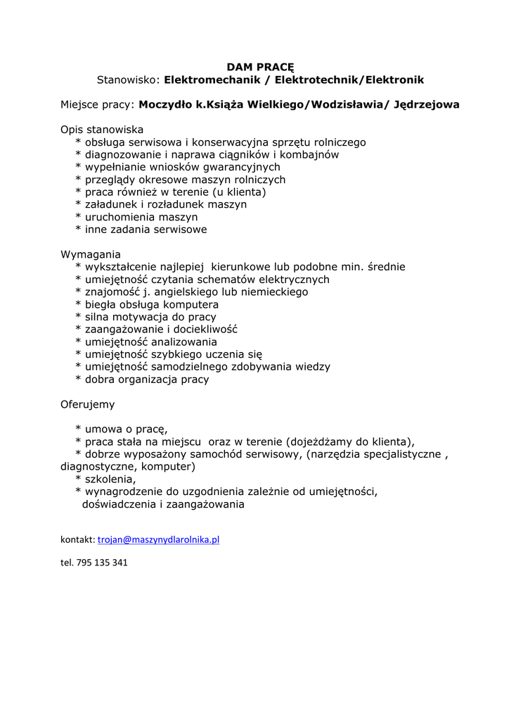 DAM PRACĘ Stanowisko: Elektromechanik / Elektrotechnik/Elektronik Miejsce pracy: Moczydło k.Książa Wielkiego/Wodzisławia/ Jędrzejowa Opis stanowiska * obsługa serwisowa i konserwacyjna sprzętu rolniczego * diagnozowanie i naprawa ciągników i kombajnów * wypełnianie wniosków gwarancyjnych * przeglądy okresowe maszyn rolniczych * praca również w terenie (u klienta) * załadunek i rozładunek maszyn * uruchomienia maszyn * inne zadania serwisowe Wymagania * wykształcenie najlepiej kierunkowe lub podobne min. średnie * umiejętność czytania schematów elektrycznych * znajomość j. angielskiego lub niemieckiego * biegła obsługa komputera * silna motywacja do pracy * zaangażowanie i dociekliwość * umiejętność analizowania * umiejętność szybkiego uczenia się * umiejętność samodzielnego zdobywania wiedzy * dobra organizacja pracy Oferujemy * umowa o pracę, * praca stała na miejscu oraz w terenie (dojeżdżamy do klienta), * dobrze wyposażony samochód serwisowy, (narzędzia specjalistyczne , diagnostyczne, komputer) * szkolenia, * wynagrodzenie do uzgodnienia zależnie od umiejętności, doświadczenia i zaangażowania kontakt: [email protected] tel. 795 135 341