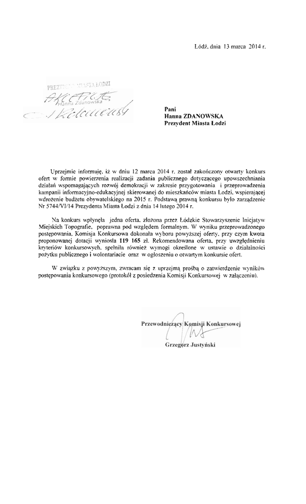 Lod?.. dnia l 3 marca 20 14 r. Pani t h n n a ZDANOWSKA Preqdent Miasta Lodzi Uprzejmic inf~rxnu~iq, i z W dniu 12 nlarca 2014 r. zostal zakoriczony otwarty konkurs o fert M' form ie powierzenia realizlacj E zadania publicznego dot>czqcego upowszechniania dzialan ~vspornagajqcychror.iir~jdemokracji w 7,akresie przygotowania i przepro~vadzenia kampanii infomacyjno-edukacyjnej skierowanqi do mieszkanc6w miastn Lodzi. uspierajqcej ~vdroieniebudietu ohywatelskiego na 20 15 r. Podstawa prawnq konkursu by10 zasqdzenic Nr 574JN1114 Psesydenta Miasfa I,odzi z dnia 14 lutego 2014 r. Na konkurs m p l y n ~ l n jedna oferta, zlo7ona przez F,~dzkie Stowarzyszenie Inicjatyv Miejskjch Topagrafie. poprawna pod wzglqdetn fomalnym. W v n i k u przeprowadzonego postqpowania. Komisja Konkursowa dokonafa i~?.borupowy2szej oferty. przy czym kwota proponowmqi dotaqji vniosta 119 165 24. Rekomendowana oferta. p r q uwzglednieniu k ~ t e r i 6 wkonkurso*~ch. spelnita r6wniek wyrnogi okreSlone w ustawie o dzialalnosci p o j ~ k upublicznego i wolontariacje oraz W ogloszeniu o otwartyrn konkursie ofert. IV zwiqzku z pomyfizyrn, zwracam sic s. uprzejmq proibq o zatwicrdzenie uynik6\+ postqpowania konkursowego (protok61 z posiedzenia Komisj i Kankurso\vej 1% 7,alqczeniu). Protoka z posiedzenia Komisji Konkurso~vejpowolanej na podstawie zarzadzenia Nr 5744NIJ14 Prezgdenta Miasta Lodzi z dnia 14 lutego 2014 r. W dniu l 2 tnarca 20 1 4 K. odhyIo sic posiedzenie Kornisji Konkursoufei zl skladzie: I .Cirzugorz ~uskyliski.Dyrekror Biura ds. Partycypacji Spokcnnej .........- Przc~vodniczqcy 3. Maciqi Nicdzielski. Wydzial Edu kacji ...........................................- C~lnnekkomisji 5 . Jacek Kacprowicz. Riuro ds Partycypac-ji Spaleczne-i ........................- Czlonek kornisji 6. Marlcnn Kan~iriska.Biuro Informac*jii Komuni kacji Spoiecznej ...........- Czfonek kornisji 7. Przedsta~~iciel olganiz:~c~ji pozarzqdnwqi. nieubecny ..........................- Czlonek kornis-ji Porzqrlek pnsi~dzrnia: 1 . Ro/poczecie posiedzenia Kornisji Konkursonrej pmez Przewod~~iczqccgo i przedstawienie podstan> prawnqi konkursu oraz zosad rozpatryvania ofert. 3. Przedstawienie wyn i k6n wstqpnej oceny formalnej o fen dokonancj przez upowainionych pracownik6w. 3. Dokonanie ostatecznei oceny formalncj przez czlankdlf-komisji konkursowj i przyjccie ofert do rozpatrzen ia mcrt toryc~negu. 4, Analiza meptoryczna ofert zgloszsr~ychdn konkutsu. 5. Dokananie oceny mcrytorycu~cjofe1-t i ustalenie zk~nikriwkonkursu. 6. Przyjqcie ofeerty reko~nendowanejPrezydentoui Miasta Lodzi do zatwierdzenia iwaz z okr&lcniem zakrcsu realimwanego zadania publicznego. Ustalcnis: Ptjl.edszauiony porzqdek posiedzenia zostal zrealizowany. Jedyna aferta, zloiona do ac~vartegokonkursu dert przez Lbdzklc S~o~iarzysrenie Inicjatyw Miejskich Topogsafie zostala uznana 7 2 wa3na pod tvzglqdcrn formaln~mi. po anal izie rne~toryc7nej.poddana ocenie rneptor!.czne!. Ol'erra tn uzyskala Sredniq ocenq 18.1 7 pkt i zostala jednornyClnie rekomcndowana Prezydentowi Miasta Lodsi do zatwierdzenia. Podpiriy cz!onk6u: Kornisji: A