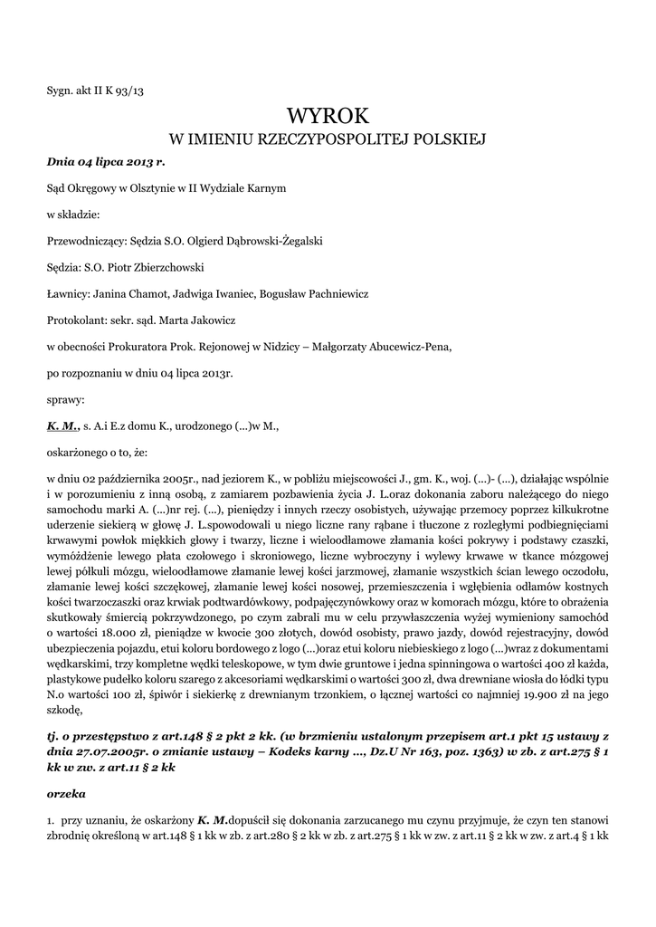 Sygn. akt II K 93/13 WYROK W IMIENIU RZECZYPOSPOLITEJ POLSKIEJ Dnia 04 lipca 2013 r. Sąd Okręgowy w Olsztynie w II Wydziale Karnym w składzie: Przewodniczący: Sędzia S.O. Olgierd Dąbrowski-Żegalski Sędzia: S.O. Piotr Zbierzchowski Ławnicy: Janina Chamot, Jadwiga Iwaniec, Bogusław Pachniewicz Protokolant: sekr. sąd. Marta Jakowicz w obecności Prokuratora Prok. Rejonowej w Nidzicy – Małgorzaty Abucewicz-Pena, po rozpoznaniu w dniu 04 lipca 2013r. sprawy: K. M., s. A.i E.z domu K., urodzonego (...)w M., oskarżonego o to, że: w dniu 02 października 2005r., nad jeziorem K., w pobliżu miejscowości J., gm. K., woj. (...)- (...), działając wspólnie i w porozumieniu z inną osobą, z zamiarem pozbawienia życia J. L.oraz dokonania zaboru należącego do niego samochodu marki A. (...)nr rej. (...), pieniędzy i innych rzeczy osobistych, używając przemocy poprzez kilkukrotne uderzenie siekierą w głowę J. L.spowodowali u niego liczne rany rąbane i tłuczone z rozległymi podbiegnięciami krwawymi powłok miękkich głowy i twarzy, liczne i wieloodłamowe złamania kości pokrywy i podstawy czaszki, wymóżdżenie lewego płata czołowego i skroniowego, liczne wybroczyny i wylewy krwawe w tkance mózgowej lewej półkuli mózgu, wieloodłamowe złamanie lewej kości jarzmowej, złamanie wszystkich ścian lewego oczodołu, złamanie lewej kości szczękowej, złamanie lewej kości nosowej, przemieszczenia i wgłębienia odłamów kostnych kości twarzoczaszki oraz krwiak podtwardówkowy, podpajęczynówkowy oraz w komorach mózgu, które to obrażenia skutkowały śmiercią pokrzywdzonego, po czym zabrali mu w celu przywłaszczenia wyżej wymieniony samochód o wartości 18.000 zł, pieniądze w kwocie 300 złotych, dowód osobisty, prawo jazdy, dowód rejestracyjny, dowód ubezpieczenia pojazdu, etui koloru bordowego z logo (...)oraz etui koloru niebieskiego z logo (...)wraz z dokumentami wędkarskimi, trzy kompletne wędki teleskopowe, w tym dwie gruntowe i jedna spinningowa o wartości 400 zł każda, plastykowe pudełko koloru szarego z akcesoriami wędkarskimi o wartości 300 zł, dwa drewniane wiosła do łódki typu N.o wartości 100 zł, śpiwór i siekierkę z drewnianym trzonkiem, o łącznej wartości co najmniej 19.900 zł na jego szkodę, tj. o przestępstwo z art.148 § 2 pkt 2 kk. (w brzmieniu ustalonym przepisem art.1 pkt 15 ustawy z dnia 27.07.2005r. o zmianie ustawy – Kodeks karny …, Dz.U Nr 163, poz. 1363) w zb. z art.275 § 1 kk w zw. z art.11 § 2 kk orzeka 1. przy uznaniu, że oskarżony K. M.dopuścił się dokonania zarzucanego mu czynu przyjmuje, że czyn ten stanowi zbrodnię określoną w art.148 § 1 kk w zb. z art.280 § 2 kk w zb. z art.275 § 1 kk w zw. z art.11 § 2 kk w zw. z art.4 § 1 kk i za to na tej podstawie skazuje go, a na podstawie art.148 § 1 kk w zw. z art.11 § 3 kk wymierza mu karę dożywotniego pozbawienia wolności , 2. na podstawie art.63 § 1 kk na poczet orzeczonej kary pozbawienia wolności zalicza K. M.okres zatrzymania i tymczasowego aresztowania od dnia 09 października 2005r. do dnia 22 grudnia 2005r. i od 31 grudnia 2008r. do dnia 15 kwietnia 2013r., 3. na podstawie art.29 ust.1 ustawy Prawo o adwokaturze i § 14 ust. 1 pkt 5 rozporządzenia Ministra Sprawiedliwości z dnia 28 września 2002 r. w sprawie opłat za czynności adwokackie oraz ponoszenia przez Skarb Państwa kosztów nieopłaconej pomocy prawnej udzielonej z urzędu (Dz. U. Nr 163, poz. 1348 z p. zm.) zasądza od Skarbu Państwa na rzecz adw. L. S. kwotę 738 złotych, w tym 23% VAT w kwocie 138 złotych tytułem nieuiszczonych opłat za obronę oskarżonego wykonywaną z urzędu w postępowaniu sądowym, 4. na podstawie art. 624 § 1 kpk zwalnia oskarżonego w całości od zapłaty na rzecz Skarbu Państwa kosztów sądowych. Sygn. akt: II K 93/13 UZASADNIENIE Sąd Najwyższy wyrokiem z dnia 11 kwietnia 2013 r. (sygn. akt III KO (...)) wznowił postępowanie zakończone wyrokiem Sądu Apelacyjnego w B.z dnia 25 kwietnia 2007 r. (sygn. akt II AKa (...)) i uchylił ów wyrok w stosunku do K. M.oraz częściowo nim zmieniony wyrok Sądu Okręgowego w O.z dnia 15 listopada 2006 r. (sygn. akt II K (...)) w części dotyczącej kwalifikacji prawnej czynu z art. 148 § 2 pkt 2 k.k. w zb. z art. 275 § 1 k.k. w zw. z art. 11 § 2 k.k. oraz wymierzonej skazanemu za ten czyn kary i przekazał w tym zakresie sprawę do ponownego rozpoznania Sądowi Okręgowemu w O.. Mając na uwadze, iż Sąd Najwyższy dokonał uchylenia wyroku Sądu Okręgowego w O.jedynie co do kwalifikacji prawnej czynu i kary za ten czyn wymierzonej, zaś w pozostałym zakresie wyrok ten uprawomocnił się, zbędne stało się przytaczanie w przedmiotowym uzasadnieniu ustalonego już prawomocnie stanu faktycznego w sprawie oraz przytaczanie dokonanej już oceny dowodów, na podstawie których ów stan faktyczny został ustalony – bo niewątpliwie mając na uwadze zakres uchylenia wyroku Sądu Apelacyjnego i w B.i Sądu Okręgowego w O.z dnia 15.11.2006 r., czynienie nowych ustaleń jest niedopuszczalne (co do stanu faktycznego i analizy dowodów zob. wyrok Sądu Okręgowego z dnia 15 listopada 2006 r. wraz z uzasadnieniem, k. 1451-1454, 1501-1515). Ograniczając zatem rozważania co do kwalifikacji prawnej czynu oskarżonego oraz wymiaru kary w pierwszej kolejności należy odnieść się do wyroku Trybunału Konstytucyjnego z dnia 16 kwietnia 2009 r. wydanego w sprawie P 11/08 (Dz. U. z 2009 r., Nr 63, poz. 49), a na kanwie którego to wyroku Sąd Najwyższy uchylił wskazane orzeczenia. Mocą przedmiotowego wyroku Trybunału stwierdzono niezgodność przepisu art. 1 pkt 15 ustawy z dnia 27 lipca 2005 r. o zmianie ustawy – Kodeks karny, ustawy - Kodeks postępowania karnego i ustawy - Kodeks karny wykonawczy (Dz. U. Nr 163, poz. 1363) z art. 118 ust. 1 i art. 119 ust. 1 i 2 Konstytucji Rzeczypospolitej Polskiej przez to, że wskazany przepis został uchwalony przez Sejm bez dochow