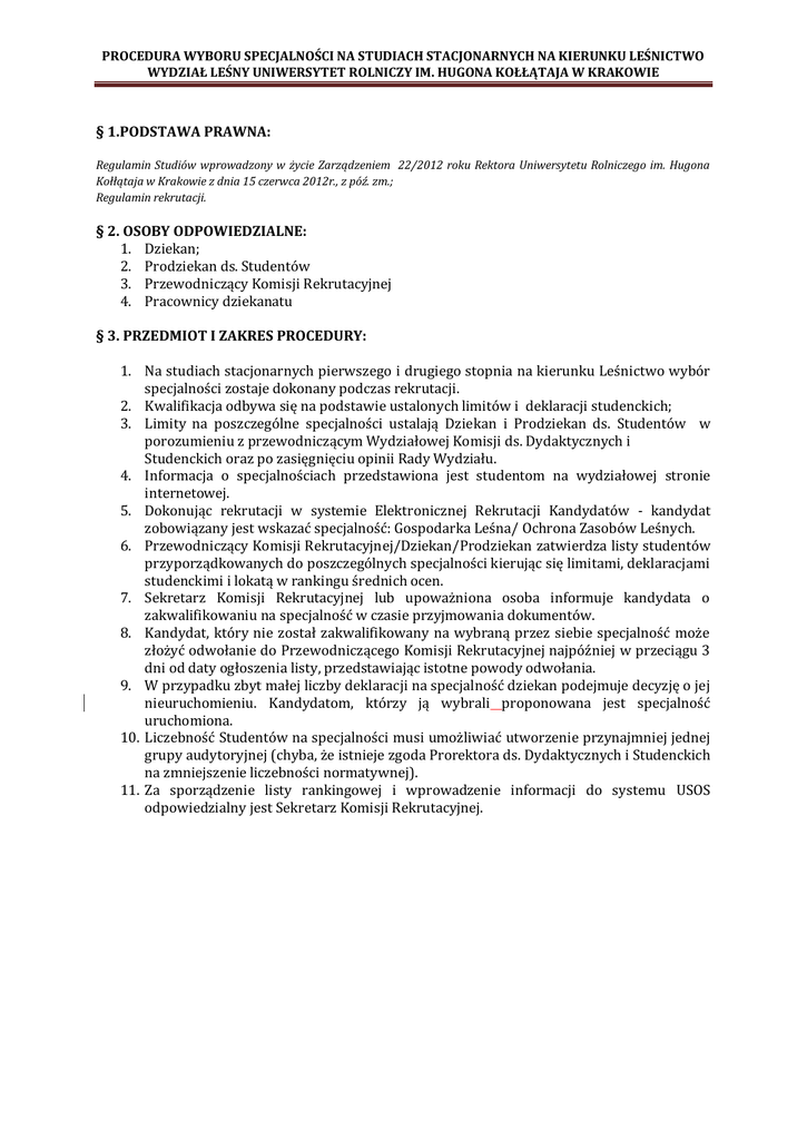 PROCEDURA WYBORU SPECJALNOŚCI NA STUDIACH STACJONARNYCH NA KIERUNKU LEŚNICTWO WYDZIAŁ LEŚNY UNIWERSYTET ROLNICZY IM. HUGONA KOŁŁĄTAJA W KRAKOWIE § 1.PODSTAWA PRAWNA: Regulamin Studiów wprowadzony w życie Zarządzeniem 22/2012 roku Rektora Uniwersytetu Rolniczego im. Hugona Kołłątaja w Krakowie z dnia 15 czerwca 2012r., z póź. zm.; Regulamin rekrutacji. § 2. OSOBY ODPOWIEDZIALNE: 1. Dziekan; 2. Prodziekan ds. Studentów 3. Przewodniczący Komisji Rekrutacyjnej 4. Pracownicy dziekanatu § 3. PRZEDMIOT I ZAKRES PROCEDURY: 1. Na studiach stacjonarnych pierwszego i drugiego stopnia na kierunku Leśnictwo wybór specjalności zostaje dokonany podczas rekrutacji. 2. Kwalifikacja odbywa się na podstawie ustalonych limitów i deklaracji studenckich; 3. Limity na poszczególne specjalności ustalają Dziekan i Prodziekan ds. Studentów w porozumieniu z przewodniczącym Wydziałowej Komisji ds. Dydaktycznych i Studenckich oraz po zasięgnięciu opinii Rady Wydziału. 4. Informacja o specjalnościach przedstawiona jest studentom na wydziałowej stronie internetowej. 5. Dokonując rekrutacji w systemie Elektronicznej Rekrutacji Kandydatów - kandydat zobowiązany jest wskazać specjalność: Gospodarka Leśna/ Ochrona Zasobów Leśnych. 6. Przewodniczący Komisji Rekrutacyjnej/Dziekan/Prodziekan zatwierdza listy studentów przyporządkowanych do poszczególnych specjalności kierując się limitami, deklaracjami studenckimi i lokatą w rankingu średnich ocen. 7. Sekretarz Komisji Rekrutacyjnej lub upoważniona osoba informuje kandydata o zakwalifikowaniu na specjalność w czasie przyjmowania dokumentów. 8. Kandydat, który nie został zakwalifikowany na wybraną przez siebie specjalność może złożyć odwołanie do Przewodniczącego Komisji Rekrutacyjnej najpóźniej w przeciągu 3 dni od daty ogłoszenia listy, przedstawiając istotne powody odwołania. 9. W przypadku zbyt małej liczby deklaracji na specjalność dziekan podejmuje decyzję o jej nieuruchomieniu. Kandydatom, którzy ją wybrali proponowana jest specjalność uruchomiona. 10. Liczebność Studentów na specjalności musi umożliwiać utworzenie przynajmniej jednej grupy audytoryjnej (chyba, że istnieje zgoda Prorektora ds. Dydaktycznych i Studenckich na zmniejszenie liczebności normatywnej). 11. Za sporządzenie listy rankingowej i wprowadzenie informacji do systemu USOS odpowiedzialny jest Sekretarz Komisji Rekrutacyjnej.