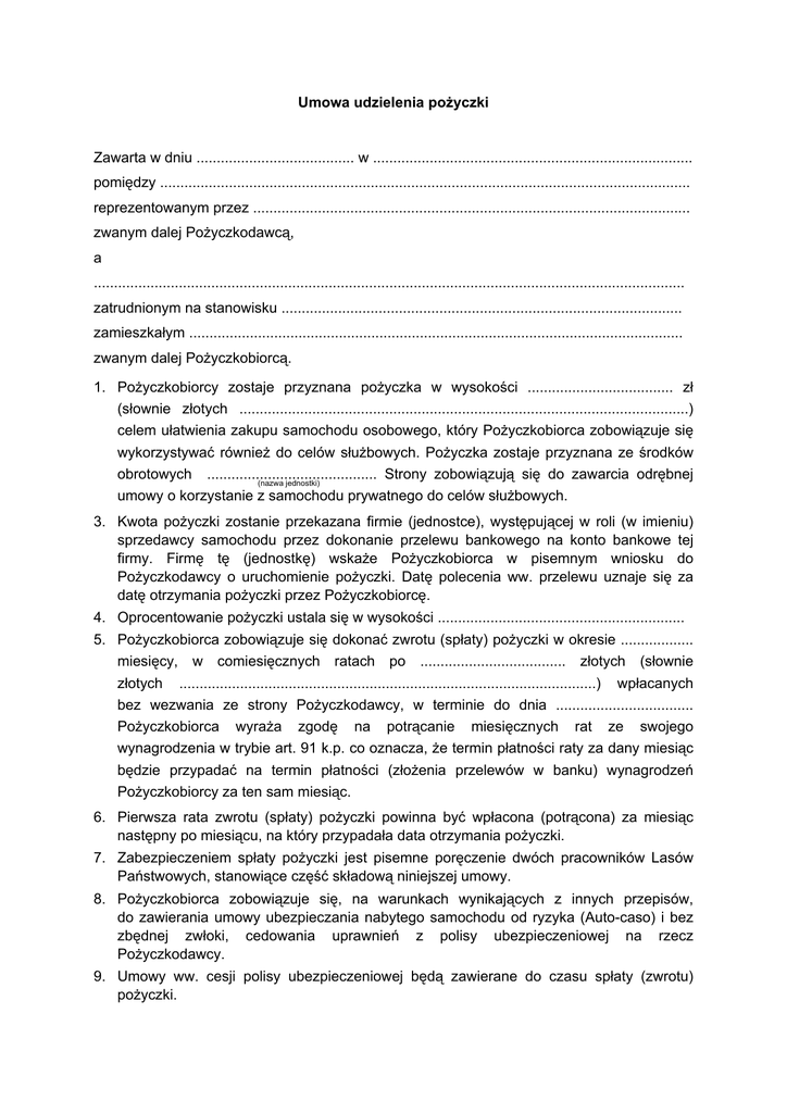 Umowa udzielenia pożyczki Zawarta w dniu ....................................... w ............................................................................... pomiędzy ................................................................................................................................... reprezentowanym przez ............................................................................................................ zwanym dalej Pożyczkodawcą, a .................................................................................................................................................. zatrudnionym na stanowisku ................................................................................................... zamieszkałym .......................................................................................................................... zwanym dalej Pożyczkobiorcą. 1. Pożyczkobiorcy zostaje przyznana pożyczka w wysokości .................................... zł (słownie złotych ...............................................................................................................) celem ułatwienia zakupu samochodu osobowego, który Pożyczkobiorca zobowiązuje się wykorzystywać również do celów służbowych. Pożyczka zostaje przyznana ze środków obrotowych .......................................... Strony zobowiązują się do zawarcia odrębnej (nazwa jednostki) umowy o korzystanie z samochodu prywatnego do celów służbowych. 3. Kwota pożyczki zostanie przekazana firmie (jednostce), występującej w roli (w imieniu) sprzedawcy samochodu przez dokonanie przelewu bankowego na konto bankowe tej firmy. Firmę tę (jednostkę) wskaże Pożyczkobiorca w pisemnym wniosku do Pożyczkodawcy o uruchomienie pożyczki. Datę polecenia ww. przelewu uznaje się za datę otrzymania pożyczki przez Pożyczkobiorcę. 4. Oprocentowanie pożyczki ustala się w wysokości ............................................................. 5. Pożyczkobiorca zobowiązuje się dokonać zwrotu (spłaty) pożyczki w okresie .................. miesięcy, w comiesięcznych ratach po .................................... złotych (słownie złotych .......................................................................................................) wpłacanych bez wezwania ze strony Pożyczkodawcy, w terminie do dnia .................................. Pożyczkobiorca wyraża zgodę na potrącanie miesięcznych rat ze swojego wynagrodzenia w trybie art. 91 k.p. co oznacza, że termin płatności raty za dany miesiąc będzie przypadać na termin płatności (złożenia przelewów w banku) wynagrodzeń Pożyczkobiorcy za ten sam miesiąc. 6. Pierwsza rata zwrotu (spłaty) pożyczki powinna być wpłacona (potrącona) za miesiąc następny po miesiącu, na który przypadała data otrzymania pożyczki. 7. Zabezpieczeniem spłaty pożyczki jest pisemne poręczenie dwóch pracowników Lasów Państwowych, stanowiące część składową niniejszej umowy. 8. Pożyczkobiorca zobowiązuje się, na warunkach wynikających z innych przepisów, do zawierania umowy ubezpieczania nabytego samochodu od ryzyka (Auto-caso) i bez zbędnej zwłoki, cedowania uprawnień z polisy ubezpieczeniowej na rzecz Pożyczkodawcy. 9. Umowy ww. cesji polisy ubezpieczeniowej będą zawierane do czasu spłaty (zwrotu) pożyczki. 2 10. Nie spłacona część pożyczki staje się natychmiast wymagalna w przypadku: a) używania samochodu niezgodnie z ww. umową na korzystanie z samochodu prywatnego w celach służbowych; b) cofnięcia zgody Pożyczkobiorcy na potrącanie rat pożyczki z jego wynagrodzeń; c) odpłatnego lub nieodpłatnego zbycia samochodu zakupionego z udziałem środków pożyczki bez zgody Pożyczkodawcy; d) użycia środków pożyczki na inne cele niż została ona udzielona; e) rozwiązania z Pożyczkobiorcą umowy o pracę z jego winy lub rozwiązania umowy o pracę przez Pożyczkobiorcę; f) niedotrzymania istotnych warunków umowy, dotyczących cesji polisy ubezpieczeniowej (Auto-caso) oraz obowiązku przedłożenia kopii dokumentu zakupu samochodu oraz oryginałów polis ubezpieczeniowych wraz z umowami ich cesji na rzecz Pożyczkodawcy; g) zalegania przez Pożyczkobiorcę (po ustaniu z nim stosunku pracy za porozumieniem stron lub po ustawowym wypowiedzeniu pracy przez Pożyczkodawcę) ze spłatą dwóch kolejnych rat zwrotu pożyczki –z chwilą upływu terminu spłaty drugiej z tych rat, przy czym przyjmuje się, że po ustaniu stosunku pracy Pożyczkobiorcy z Pożyczkodawcą terminy spłat (zwrotu) pożyczki przypadają na daty, ustalone według reguł sprzed ustania tego stosunku pracy. 11. Niezwłocznie po dokonaniu zakupu samochodu, jednak nie później niż w dniu otrzymania samochodu, Pożyczkobiorca zobowiązuje się do przedłożenia Pożyczkodawcy dokumentu, stwierdzającego dokonanie zakupu samochodu, a także oryginału polisy ubezpieczeniowej wraz z umową jej cesji na rzecz Pożyczkodawcy. 12. W przypadku: a) stwierdzenia przez Pożyczkodawcę, że udzielona pożyczka została przeznaczona na inne cele niż zakup samochodu osobowego; b) rozwiązania umowy o pracę z Pożyczkobiorcą przez Pożyczkodawcę z winy Pożyczkobiorcy lub rozwiązania stosunku pracy przez Pożyczkobiorcę; c) uchylenia się Pożyczkobiorcy od cesji uprawnień z polisy ubezpieczeniowej Autocaso na rzecz Pożyczkodawcy; d) nie wywiązania się Pożyczkobiorcy z obowiązków, o których mowa w punkcie 11, Pożyczkodawca, niezależnie od uznania nie spłaconej części pożyczki za natychmiast wymagalną, obciąży Pożyczkobiorcę odsetkami ustawowymi, biorąc pod uwagę kwotę zadłużenia Pożyczkobiorcy w poszczególnych interwałach czasowych. 13. Wszelkie opłaty i obciążenia, wynikające z tytułu udzielenia pożyczki leżą po stronie Pożyczkobiorcy. 14. W sprawach nieuregulowanych niniejszą umową mają zastosowanie przepisy kodeksu cywilnego; spory, jakie mogą pojawić