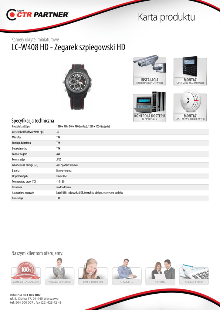 Kamery ukryte, miniaturowe LC-W408 HD - Zegarek szpiegowski HD INSTALACJA KAMER PRZEMYSŁOWYCH KONTROLA DOSTĘPU I CZASU PRACY Specyfikacja techniczna Rozdzielczość [px] 1280 x 960, 640 x 480 (wideo), 1280 x 1024 (zdjęcia) Częstotliwość odświeżania [fps] 30 Mikrofon TAK Funkcja dyktafonu TAK Detekcja ruchu TAK Format nagrań AVI Format zdjęć JPEG Wbudowana pamięć [GB] 4 (12 godzin filmów) Bateria litowo-jonowa Eksport danych złącze USB Temperatura pracy [°C] -10 - 60 Obudowa wodoodporna Akcesoria w zestawie kabel USB, ładowarka USB, instrukcja obsługi, estetyczne pudełko Gwarancja TAK MONTAŻ SYSTEMÓW ALARMOWYCH MONTAŻ SYSTEMÓW P.POŻAROWYCH Naszym klientom oferujemy: GWARANCJA SATYSFAKCJI PROGRAM PARTNERSKI POMOC TECHNICZNA SERWIS CCTV SZKOLENIA GENERATOR OFERT