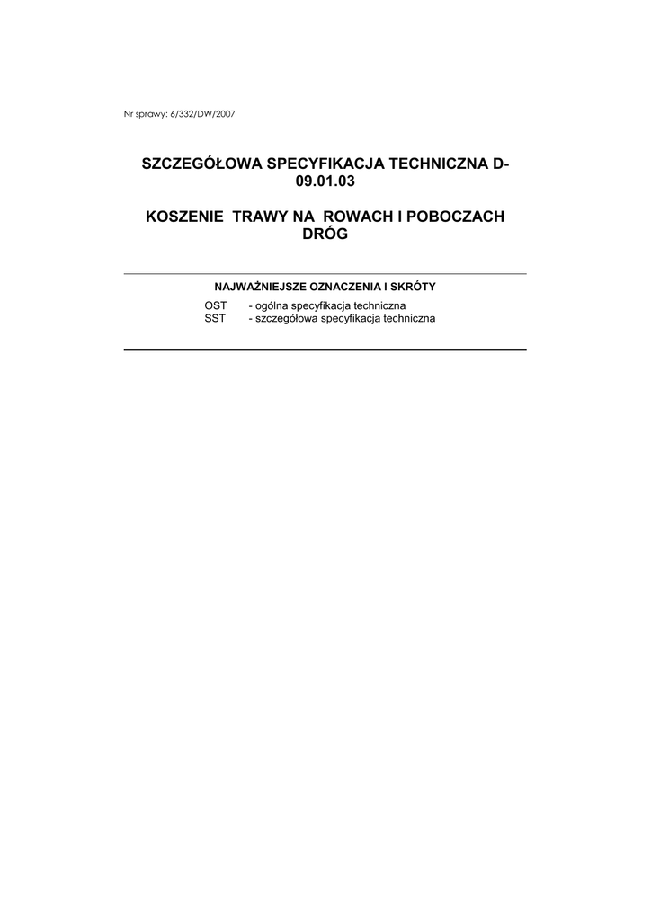Nr sprawy: 6/332/DW/2007 SZCZEGÓŁOWA SPECYFIKACJA TECHNICZNA D09.01.03 KOSZENIE TRAWY NA ROWACH I POBOCZACH DRÓG NAJWAŻNIEJSZE OZNACZENIA I SKRÓTY OST SST - ogólna specyfikacja techniczna - szczegółowa specyfikacja techniczna 1. WSTĘP 1.1. Przedmiot SST Przedmiotem niniejszej szczegółowej specyfikacji technicznej (SST) są wymagania dotyczące wykonania i odbioru robót związanych z koszeniem trawy na rowach i poboczach dróg w Gminie Mszana. 1.2. Zakres stosowania SST Szczegółowa specyfikacja techniczna (SST) stanowi dokument przetargowy i kontraktowy przy zlecaniu i realizacji robót na drogach gminnych. 1.3. Zakres robót objętych SST Ustalenia zawarte w niniejszej specyfikacji dotyczą zasad prowadzenia robót związanych z: - robotami przygotowawczymi, - koszeniem traw w pasie drogowym kosiarkami , - wycięciem trawy w miejscach niedostępnych, 1.4. Określenia podstawowe 1.4.1. Standard utrzymania drogi - zespół wymagań określający poziom bieżącego utrzymania drogi i jej wyposażenia w zależności od funkcji i obciążenia ruchem. 1.4.2. Jednoroczne samosiewy - rośliny rozmnożone samoczynnie z nasion drzew i krzewów w miejscach niepożądanych. 1.4.3. Chwasty - rośliny niepożądane, występujące wśród upraw roślin (w tym wypadku - traw), hamujące ich rozwój i jakość. 1.4.4. Pozostałe określenia podstawowe są zgodne z obowiązującymi, odpowiednimi polskimi normami i z definicjami podanymi w OST D-M-00.00.00 „Wymagania ogólne” pkt 1.4. 1.5. Ogólne wymagania dotyczące robót Ogólne wymagania dotyczące robót podano w OST D-M-00.00.00 „Wymagania ogólne” pkt 1.5. 2. SPRZĘT 2.1. Ogólne wymagania dotyczące sprzętu Ogólne wymagania dotyczące sprzętu podano w OST D-M-00.00.00 „Wymagania ogólne” pkt 2. 2.2. Sprzęt do koszenia trawy i niszczenia chwastów Wykonawca przystępujący do koszenia trawy i niszczenia chwastów powinien wykazać się możliwością korzystania z następującego sprzętu: - kosiarki ciągnikowej, do koszenia na skarpach i poboczach, kosiarki żyłkowej, spalinowej lub elektrycznej, do koszenia w miejscach niedostępnych, takich jak: pod barierami, przy ogrodzeniach, znakach, pachołkach oraz innych urządzeniach drogowych, 3. TRANSPORT 3.1. Ogólne wymagania dotyczące transportu Ogólne wymagania dotyczące transportu podano w OST D-M-00.00.00 „Wymagania ogólne” pkt 3. 3.2. Środki transportu Do przewozu skoszonej trawy, chwastów i zanieczyszczeń można użyć dowolnego sprzętu transportowego. 4. WYKONANIE ROBÓT 4.1. Ogólne zasady wykonania robót Ogólne zasady wykonania „Wymagania ogólne” pkt 4. robót podano w OST D-M-00.00.00 4.2. Koszenie traw i chwastów Koszenie traw i chwastów na pasach drogowych powinno być wykonywane trzykrotnie, pierwsze w okresie wiosennym, drugie – letnim, trzecie - jesiennym. Rozpoczęcie i zakończenie pierwszego koszenia traw i chwastów powinno być wykonane w takim okresie, aby nie dopuścić do wysypu nasion chwastów w wyniku ich przekwitnięcia. Najbardziej miarodajnym okresem pierwszego koszenia traw jest okres drugiej połowy maja, przy czym termin rozpoczęcia koszenia powinien być uzgodniony z Inspektorem Urzędu Gminy w Mszanie. Drugie koszenie traw i chwastów powinno być wykonane w terminie do końca sierpnia, w zależności od takich czynników, jak: - charakteru drogi, - standardu utrzymania danej drogi, - natężenia ruchu, - występowania obszarów zabudowanych, - występowania parkingów, - istnienia pomników przyrody, itp. Inspektor może zwiększyć częstotliwość koszenia traw na pasach drogowych lub określonych fragmentach drogi. W pierwszej kolejności powinny być koszone trawy i chwasty na koronie drogi, a w szczególności występujące na: - pasach dzielących, - wysepkach i trawnikach, - poboczach, pod barierami, oraz w miejscach mających zasadniczy wpływ na wizualny wygląd drogi. W drugiej kolejności powinny być koszone skarpy rowów. Kolejność koszenia Wykonawca powinien uzgodnić z Inżynierem. Wysokość trawy po skoszeniu powinna być nie większa niż 5 cm. Należy zwracać uwagę, aby trawa i chwasty nie powodowały ograniczeń widoczności i nie zasłaniały urządzeń drogowych (np. barier, znaków) co może stworzyć zagrożenia dla ruchu drogowego lub utrudnić drożność rowów odwadniających. 2 Przewidywana ilość koszeń wynosi 90.000 m jednorazowego cyklu koszeń. 4.4. Wycięcie traw w miejscach niedostępnych Wycięcie traw i chwastów w miejscach niedostępnych i częściowo obsadzonych wykonuje się kosiarkami żyłkowymi równolegle z głównym koszeniem. Dopuszcza się koszenie w tych miejscach traw, chwastów i jednorocznych samosiewów kosą. 4.5. Usunięcie skoszonej trawy i chwastów Ponieważ trawy rosnące w pasie drogowym, zawierają szkodliwe substancje (głównie ołów), zawarte w spalinach samochodowych i spływach deszczowych z jezdni, należy: - zabraniać wypasu bydła w pasie drogowym oraz używania siana jako paszy dla bydła, - skoszone trawy zgrabić, zebrać w stosy i usunąć na wysypisko, względnie kompostować łącznie z „czystymi” odpadkami roślinnymi przez kilka miesięcy przed ich użyciem do nawożenia przy robotach pielęgnacyjnych zieleni. Sposób usunięcia wzgl. miejsce wywozu trawy i chwastów powinny być zaakceptowane przez Inspektora. 5. KONTROLA JAKOŚCI ROBÓT 5.1. Ogólne zasady kontroli jakości robót Ogólne zasady kontroli jakości robót podano w OST D-M-00.00.00 „Wymagania ogólne” pkt 5. 5.2. Kontrola w czasie wykonywania robót W czasie wykonywania robót należy przeprowadzać ciągłą kontrolę poprawności koszenia trawy i niszczenia chwastów, zgodnie z wymaganiami pktu 5, w tym w szczególności: - usunięcia wszystkich obcych zanieczyszczeń z miejsc pracy kosiarek, - dopilnowania terminu pierwszego koszenia traw i chwastów, aby nie nastąpił wysyp dojrzałych nasion chwastów, - skontrolowania dopuszczalnej wysokości traw