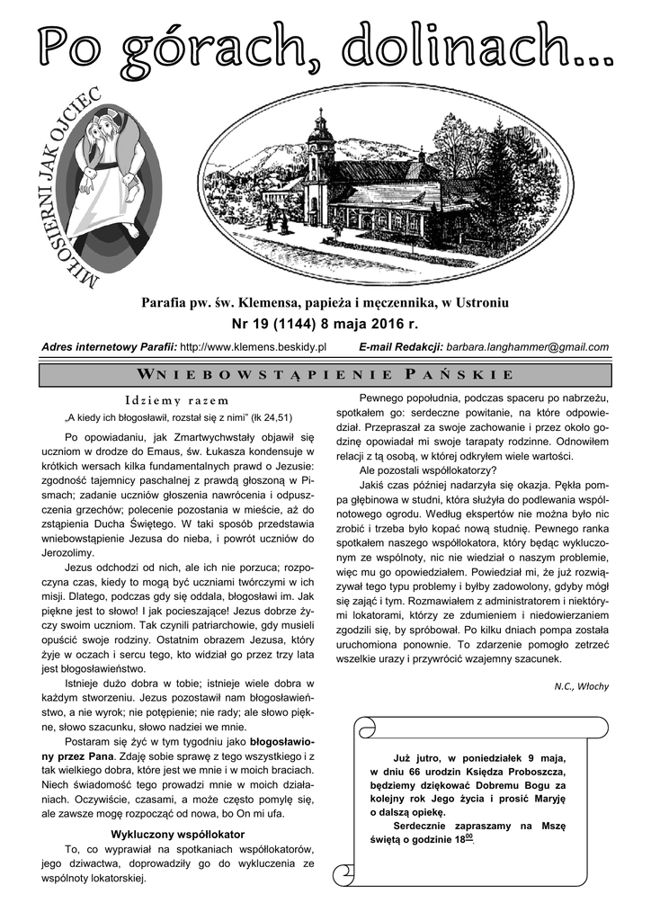 Parafia pw. św. Klemensa, papieża i męczennika, w Ustroniu Nr 19 (1144) 8 maja 2016 r. Adres internetowy Parafii: http://www.klemens.beskidy.pl WN E-mail Redakcji: [email protected] I E B O W S T Ą P I E N I E Idziemy razem „A kiedy ich błogosławił, rozstał się z nimi” (łk 24,51) Po opowiadaniu, jak Zmartwychwstały objawił się uczniom w drodze do Emaus, św. Łukasza kondensuje w krótkich wersach kilka fundamentalnych prawd o Jezusie: zgodność tajemnicy paschalnej z prawdą głoszoną w Pismach; zadanie uczniów głoszenia nawrócenia i odpuszczenia grzechów; polecenie pozostania w mieście, aż do zstąpienia Ducha Świętego. W taki sposób przedstawia wniebowstąpienie Jezusa do nieba, i powrót uczniów do Jerozolimy. Jezus odchodzi od nich, ale ich nie porzuca; rozpoczyna czas, kiedy to mogą być uczniami twórczymi w ich misji. Dlatego, podczas gdy się oddala, błogosławi im. Jak piękne jest to słowo! I jak pocieszające! Jezus dobrze życzy swoim uczniom. Tak czynili patriarchowie, gdy musieli opuścić swoje rodziny. Ostatnim obrazem Jezusa, który żyje w oczach i sercu tego, kto widział go przez trzy lata jest błogosławieństwo. Istnieje dużo dobra w tobie; istnieje wiele dobra w każdym stworzeniu. Jezus pozostawił nam błogosławieństwo, a nie wyrok; nie potępienie; nie rady; ale słowo piękne, słowo szacunku, słowo nadziei we mnie. Postaram się żyć w tym tygodniu jako błogosławiony przez Pana. Zdaję sobie sprawę z tego wszystkiego i z tak wielkiego dobra, które jest we mnie i w moich braciach. Niech świadomość tego prowadzi mnie w moich działaniach. Oczywiście, czasami, a może często pomylę się, ale zawsze mogę rozpocząć od nowa, bo On mi ufa. Wykluczony współlokator To, co wyprawiał na spotkaniach współlokatorów, jego dziwactwa, doprowadziły go do wykluczenia ze lokatorskiej. 8wspólnoty maja 2016 r. PO GÓRACH, P A Ń S K I E Pewnego popołudnia, podczas spaceru po nabrzeżu, spotkałem go: serdeczne powitanie, na które odpowiedział. Przepraszał za swoje zachowanie i przez około godzinę opowiadał mi swoje tarapaty rodzinne. Odnowiłem relacji z tą osobą, w której odkryłem wiele wartości. Ale pozostali współlokatorzy? Jakiś czas później nadarzyła się okazja. Pękła pompa głębinowa w studni, która służyła do podlewania wspólnotowego ogrodu. Według ekspertów nie można było nic zrobić i trzeba było kopać nową studnię. Pewnego ranka spotkałem naszego współlokatora, który będąc wykluczonym ze wspólnoty, nic nie wiedział o naszym problemie, więc mu go opowiedziałem. Powiedział mi, że już rozwiązywał tego typu problemy i byłby zadowolony, gdyby mógł się zająć i tym. Rozmawiałem z administratorem i niektórymi lokatorami, którzy ze zdumieniem i niedowierzaniem zgodzili się, by spróbował. Po kilku dniach pompa została uruchomiona ponownie. To zdarzenie pomogło zetrzeć wszelkie urazy i przywrócić wzajemny szacunek. N.C., Włochy Już jutro, w poniedziałek 9 maja, w dniu 66 urodzin Księdza Proboszcza, będziemy dziękować Dobremu Bogu za kolejny rok Jego życia i prosić Maryję o dalszą opiekę. Serdecznie zapraszamy na Mszę świętą o godzinie 1800. DOLINACH... 1 Mój fragment z Dzienniczka św. Faustyny Pan wśród radości wstępuje do nieba (Ps 47) „Po swoim zmartwychwstaniu Jezus ukazał się Jedenastu i powiedział do nich: Idźcie na cały świat i głoście Ewangelię wszelkiemu stworzeniu! Kto uwierzy i przyjmie chrzest, będzie zbawiony; a kto nie uwierzy, będzie potępiony. Tym zaś, którzy uwierzą, te znaki towarzyszyć będą: w imię Moje złe duchy będą wyrzucać, nowymi językami mówić będą; węże brać będą do rąk, i jeśli co zatrutego wypili nie będzie im szkodzić. Na chorych ręce kłaść będą, i ci odzyskają zdrowie. Po rozmowie z nimi Pan Jezus został wzięty do nieba i zasiadł po prawicy Boga. Oni zaś poszli i głosili Ewangelię wszędzie, a Pan współdziałał z nimi i potwierdził naukę znakami, które jej towarzyszyły” (Mk 16,15-20). Ewangelia kończy się nakazem i posłaniem uczniów. Uczniowie – już ożywieni przez doświadczenie Zmartwychwstałego – mają być kontynuatorami dzieła zapoczątkowanego przez Pana, to znaczy dać poznać światu Boży plan zbawienia i go realizować. Misja uczniów i pierwszych wspólnot chrześcijańskich polegała na wprowadzeniu w czyn tego, czego nauczyli się od Jezusa, aby przez swoje świadectwo przyciągnąć do Niego innych, którzy byliby zdolni do przyjęcia radykalności chrześcijańskiego projektu i życia. To świadectwo pierwszych chrześcijan zachęca nas nadal do wzięcia na siebie odpowiedzialności i zobowiązań misyjnych, jakie przyjęliśmy w czasie chrztu świętego. Nie możemy pozostać spokojni oraz milczeć wobec biedy i niesprawiedliwości, jakie dzieją się dookoła nas. W Ewangelii i w Listach św. Pawła otrzymujemy prawdziwe lekcje chrześcijańskiego proroctwa i zaangażowania, co nie jest zadaniem łatwym do wykonania. Przeciwnie, przynosi w konsekwencji przeciwności, konflikty, a czasami nawet prześladowania. Pozwólmy, zatem, aby nasza wiara z Zmartwychwstałego Chrystusa odnawiała się każdego dnia poprzez nowe wyzwania, jakie stawia przed nami rzeczywistość. Zachęcam do częstej adoracji Pana Jezusa w Hostii utajonego. Tam, przy Nim można znaleźć siły i pokój serca. Wszystkim niech Bóg błogosławi. Wasz brat Franciszek KWIATKI PAPIEŻA FRANCISZKA Czy wiecie, że?... Papież Franciszek napisał : „Pan nas pociesza. Wszyscy mamy pocieszać naszych braci, dając świadectwo, że tylko Bóg może wyeliminować przyczyny dramatów”. 8 maja 2016 r. Każdy z nas ma jakieś swoje osobiste doświadczenie Boga, może opowiedzieć o tym, jak Bóg wkroczył w jego życie. Takie doświadczenie Boga mieli też św. s. Faustyna Kowalska i jej spowiednik błogosławiony ks. Michał Sopoćko. Oboje na polecenie Jezus