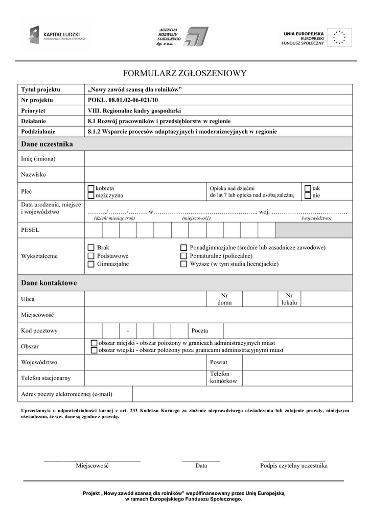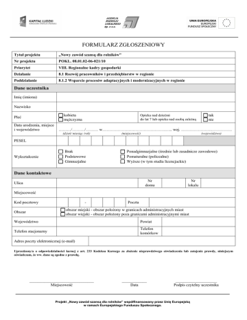 FORMULARZ ZGŁOSZENIOWY Tytuł projektu „Nowy zawód szansą dla rolników” Nr projektu POKL. 08.01.02-06-021/10 Priorytet VIII. Regionalne kadry gospodarki Działanie 8.1 Rozwój pracowników i przedsiębiorstw w regionie Poddziałanie 8.1.2 Wsparcie procesów adaptacyjnych i modernizacyjnych w regionie Dane uczestnika Imię (imiona) Nazwisko kobieta mężczyzna Płeć Data urodzenia, miejsce i województwo Opieka nad dziećmi do lat 7 lub opieka nad osobą zależną tak nie ………/………/……… w……………………………………….….. woj. ………………….…………… (dzień/ miesiąc /rok) (miejscowość) (województwo) PESEL Wykształcenie Brak Podstawowe Gimnazjalne Ponadgimnazjalne (średnie lub zasadnicze zawodowe) Pomaturalne (policealne) Wyższe (w tym studia licencjackie) Dane kontaktowe Nr domu Ulica Nr lokalu Miejscowość Kod pocztowy - Poczta obszar miejski - obszar położony w granicach administracyjnych miast obszar wiejski - obszar położony poza granicami administracyjnymi miast Obszar Województwo Powiat Telefon stacjonarny Telefon komórkow y Adres poczty elektronicznej (e-mail) Uprzedzony/a o odpowiedzialności karnej z art. 233 Kodeksu Karnego za złożenie nieprawdziwego oświadczenia lub zatajenie prawdy, niniejszym oświadczam, że ww. dane są zgodne z prawdą. _______________________________ Miejscowość ____________ Data ____________________ Podpis czytelny uczestnika Projekt „Nowy zawód szansą dla rolników” współfinansowany przez Unię Europejską w ramach Europejskiego Funduszu Społecznego. Oświadczenie o kwalifikowaniu się uczestnika do projektu Oświadczam, że (zaznaczyć właściwe kwadraty): Jestem rolnikiem - prowadzę osobiście i na własny rachunek działalność rolniczą w pozostającym tak w moim posiadaniu gospodarstwie rolnym nie Jestem domownikiem - pozostaję z rolnikiem we wspólnym gospodarstwie domowym i stale pracuję w tym gospodarstwie rolnym i nie jestem związany(a) z rolnikiem stosunkiem pracy tak nie Jestem ubezpieczony(a) w Kasie Rolniczego Ubezpieczenia Społecznego (KRUS) tak nie Jestem mieszkańcem gminy wiejskiej/ miejsko – wiejskiej/ miasta do 25 tys. mieszkańców tak nie Zamieszkuję teren województwa lubelskiego tak nie Zamierzam podjąć zatrudnienie w obszarach niezwiązanych z działalnością rolniczą lub pozarolniczą działalność gospodarczą tak nie Deklaruję chęć uczestnictwa w bezpłatnym kursie w ramach projektu (jeden do wyboru): Nazwa kursu Kierowca samochodu osobowego (60 godz.) Florysta (120 godz.) Kosmetyczka (120 godz.) Przedstawiciel handlowy (120 godz.) Sekretarka (120 godz.) Sprzedawca (120 godz.) Magazynier (120 godz.) Asystent ds. księgowości (120 godz.) Opiekun osób starszych (120 godz.) Operator koparko-ładowarki (202 godz.) Ponadto zobowiązuję się do wzięcia udziału w indywidualnym doradztwie zawodowym (6 godz.) oraz w warsztatach z poruszania się po rynku pracy (6 godz.) Ponadto oświadczam, że: − Zapoznałem(łam) się z zasadami udziału oraz regulaminem w/w projektu i wyrażam zgodę na uczestnictwo w nim, a także akceptuję warunki regulaminu, − Zgodnie z wymogami jestem uprawniony(a) do uczestnictwa w projekcie, − Zostałem(łam) poinformowany(a), że projekt jest finansowany ze środków Unii Europejskiej w ramach Europejskiego Funduszu Społecznego, − Wyrażam zgodę na udział w postępowaniu rekrutacyjnym, − Jestem świadomy(a), że złożenie dokumentów rekrutacyjnych nie jest równoznaczne z zakwalifikowaniem do udziału w projekcie, − Zostałem(łam) poinformowany(a) o możliwości udziału tylko w jednym kursie w ramach projektu. Uprzedzony(a) o odpowiedzialności karnej z art. 233 Kodeksu Karnego za złożenie nieprawdziwego oświadczenia lub zatajenie prawdy, niniejszym oświadczam, że ww. dane są zgodne z prawdą. ………………………………………………… Data i podpis czytelny uczestnika ___-_____-_________r. ……………..……………………… data wpływu formularza Podpis osoby przyjmującej formularz Projekt „Nowy zawód szansą dla rolników” współfinansowany przez Unię Europejską w ramach Europejskiego Funduszu Społecznego. OŚWIADCZENIE UCZESTNIKA PROJEKTU O WYRAŻENIU ZGODY NA PRZETWARZANIE DANYCH OSOBOWYCH W związku z przystąpieniem do Projektu „Nowy zawód szansą dla rolników” realizowanego w ramach Programu Operacyjnego Kapitał Ludzki wyrażam zgodę na przetwarzanie moich danych osobowych. Oświadczam, iż przyjmuję do wiadomości, że: 1) administratorem tak zebranych danych osobowych jest Minister Rozwoju Regionalnego pełniący funkcję Instytucji Zarządzającej dla Programu Operacyjnego Kapitał Ludzki z siedzibą w Warszawie, ul. Wspólna 2/4, 00-926 Warszawa; 2) moje dane osobowe będą przetwarzane wyłącznie w celu udzielenia wsparcia, realizacji projektu „Nowy zawód szansą dla rolników”, ewaluacji, kontroli, monitoringu i sprawozdawczości w ramach Programu Operacyjnego Kapitał Ludzki; 3) moje dane osobowe mogą zostać udostępnione innym podmiotom wyłącznie w celu udzielenia wsparcia, realizacji projektu „Nowy zawód szansą dla rolników”, ewaluacji, kontroli, monitoringu i sprawozdawczości w ramach Programu Operacyjnego Kapitał Ludzki; 4) podanie danych jest dobrowolne, aczkolwiek odmowa ich podania jest równoznaczna z brakiem możliwości udzielenia wsparcia w ramach Projektu; 5) mam prawo dostępu do treści swoich danych i ich poprawiania. ………………………............ (miejscowość i data) ......................…………………………… (czytelny podpis uczestnika projektu) Projekt „Nowy zawód szansą dla rolników” współfinansowany przez Unię Europejską w ramach Europejskiego Funduszu Społecznego.