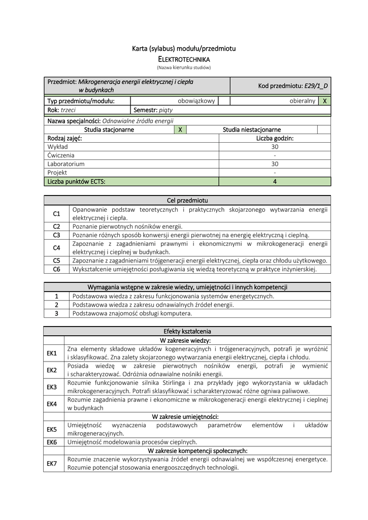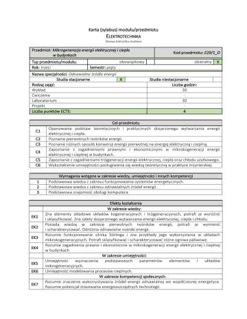Karta (sylabus) modułu/przedmiotu ELEKTROTECHNIKA (Nazwa kierunku studiów) Przedmiot: Mikrogeneracja energii elektrycznej i ciepła w budynkach Typ przedmiotu/modułu: Rok: trzeci Kod przedmiotu: E29/1_D obowiązkowy obieralny X Semestr: piąty Nazwa specjalności: Odnawialne źródła energii Studia stacjonarne X Rodzaj zajęć: Wykład Ćwiczenia Laboratorium Projekt Liczba punktów ECTS: Studia niestacjonarne Liczba godzin: 30 30 4 C5 C6 Cel przedmiotu Opanowanie podstaw teoretycznych i praktycznych skojarzonego wytwarzania energii elektrycznej i ciepła. Poznanie pierwotnych nośników energii. Poznanie różnych sposób konwersji energii pierwotnej na energię elektryczną i cieplną. Zapoznanie z zagadnieniami prawnymi i ekonomicznymi w mikrokogeneracji energii elektrycznej i cieplnej w budynkach. Zapoznanie z zagadnieniami trójgeneracji energii elektrycznej, ciepła oraz chłodu użytkowego. Wykształcenie umiejętności posługiwania się wiedzą teoretyczną w praktyce inżynierskiej. 1 2 3 Wymagania wstępne w zakresie wiedzy, umiejętności i innych kompetencji Podstawowa wiedza z zakresu funkcjonowania systemów energetycznych. Podstawowa wiedza z zakresu odnawialnych źródeł energii. Podstawowa znajomość obsługi komputera. C1 C2 C3 C4 EK1 EK2 EK3 EK4 EK5 EK6 EK7 Efekty kształcenia W zakresie wiedzy: Zna elementy składowe układów kogeneracyjnych i trójgeneracyjnych, potrafi je wyróżnić i sklasyfikować. Zna zalety skojarzonego wytwarzania energii elektrycznej, ciepła i chłodu. Posiada wiedzę w zakresie pierwotnych nośników energii, potrafi je wymienić i scharakteryzować. Odróżnia odnawialne nośniki energii. Rozumie funkcjonowanie silnika Stirlinga i zna przykłady jego wykorzystania w układach mikrokogeneracyjnych. Potrafi sklasyfikować i scharakteryzować różne ogniwa paliwowe. Rozumie zagadnienia prawne i ekonomiczne w mikrokogeneracji energii elektrycznej i cieplnej w budynkach W zakresie umiejętności: Umiejętność wyznaczenia podstawowych parametrów elementów i układów mikrogeneracyjnych. Umiejętność modelowania procesów cieplnych. W zakresie kompetencji społecznych: Rozumie znaczenie wykorzystywania źródeł energii odnawialnej we współczesnej energetyce. Rozumie potencjał stosowania energooszczędnych technologii. EK8 W1 W2 W3 W4 W5 W6 W7 W8 W9 W10 W11 W12 W13 W14 W15 Potrafi współpracować w grupie. Treści programowe przedmiotu Forma zajęć – wykłady Treści programowe: Podstawowe pojęcia mikrokogeneracji. Elementy składowe układów mikrokogeneracyjnych. Przegląd i klasyfikacja układów mikrokogeneracji. Postaci energii pierwotnej w mikrokogeneracji. Silnik Strirlinga podstawowym napędem w układach mikrokogeneracyjnych wykorzystujących biomasę i biogaz Biogazownie rolnicze Wytwarzanie energii elektrycznej i ciepła w ogniwach paliwowych Podstawowe typy ogniw paliwowych stosowanych w układach mikrokogeneracyjnych, parametry, efektywność Energia słoneczna w kogeneracji ogniw fotowoltaicznych i kolektorów cieplnych (PV + KC) Efektywność konwersji energii słonecznej w energię elektryczną i cieplną, zagadnienia ekonomiczne Zagadnienia prawne i ekonomiczne w mikrokogeneracji energii elektrycznej i cieplnej w budynkach Trójgeneracja ze źródeł odnawialnych. Energia słońca- ogniwa fotowoltaiczne Energia geotermalna- przegląd stosowanych technologii i możliwości rozwoju w Polsce. Zasoby energetyczne biomasy, ich rozmieszczenie i kierunki wykorzystania. Procesy technologiczne. Biogazownie w Polsce Suma godzin: Forma zajęć – laboratorium Treści programowe: L1 L2 L3 L4 L5 L6 L7 L8 L9 L10 L11 Szkolenie BHP Modelowanie procesów cieplnych na modelu elektrycznym RC Beukena. Wyznaczanie rozkładu temperatury w wybranych obiektach przy wykorzystaniu narzędzi modelowania numerycznego (QuickField, FEMM) Badanie układu mikrokogeneracyjnego funkcjonującego w oparciu o ogniwo paliwowe. Badanie silnika Stirlinga – budowa, zasada działania, wyznaczenie sprawności elektrycznej i cieplnej. Wyznaczenie ciepła spalania paliw stałych za pomocą kalorymetru. Badanie wymiennika ciepła. Badanie układów kogeneracyjnych wyposażonych w elektryczny generator z dodatkowym wymiennikiem ciepła. Badanie parametrów elektrycznych. Badanie układów kogeneracyjnych wyposażonych w elektryczny generator z dodatkowym wymiennikiem ciepła. Badanie parametrów cieplnych. Badanie układów kogeneracyjnych wyposażonych w elektryczny generator z dodatkowym wymiennikiem ciepła. Dobór parametrów. Wyznaczenie sprawności. Numeryczne badanie modeli układów mikrokogeneracyjnych i trójgeneracyjnych. Liczba godzin: 2 2 2 2 2 2 2 2 2 2 2 2 2 2 2 30 Liczba godzin 1 2 2 2 4 2 2 4 4 4 2 L12 Podsumowanie zajęć, zaliczenie. Suma godzin: 1 30 Narzędzia dydaktyczne 1 Wykład konwencjonalny z wykorzystaniem metod multimedialnych 2 Ćwiczenia laboratoryjne z wykorzystaniem aplikacji komputerowych 3 Ćwiczenia laboratoryjne - badanie parametrów wybranych odnawialnych źródeł energii F1 F2 F3 F4 P1 P2 Sposoby oceny Ocena formująca: Krótkie pytania sprawdzające podczas zajęć Dyskusja uzyskanych wyników Ocena przygotowania i postępów w realizacji zadań Przedłużona obserwacja Ocena podsumowująca: Egzamin z wykładu Średnia z ocen cząstkowych za wykonanie poszczególnych zadań Obciążenie pracą studenta Forma aktywności Średnia liczba godzin na realizowanie aktywności Godziny kontaktowe z wykładowcą, realizowane w formie zajęć dydaktycznych – łączna liczba 60 godzin w semestrze Godziny kontaktowe z wykładowcą realizowane w formie np. konsultacji – łączna liczba godzin w 5 semestrze Przygotowanie się do laboratorium – łączna 10 liczba godzin w semestrze Opracowanie sprawozdania z laboratorium 15 Przygotowanie do egzaminu Suma Sumaryczna liczba punktów ECTS dla przedmiotu 1 2 3 4 5 6 7 8 9 10 10 100 4 Literatura podstawowa i uzupełniająca Lewandowski W.: Proekologiczne odnawialne źródł