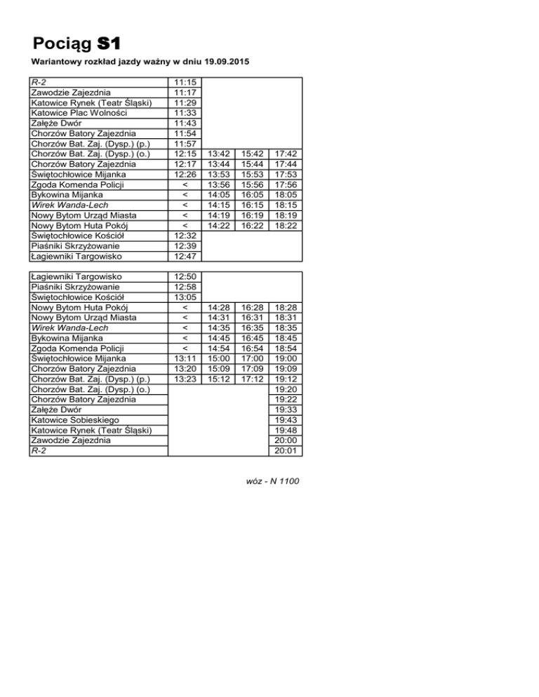 Pociąg S1 Wariantowy rozkład jazdy ważny w dniu 19.09.2015 R-2 Zawodzie Zajezdnia Katowice Rynek (Teatr Śląski) Katowice Plac Wolności Załęże Dwór Chorzów Batory Zajezdnia Chorzów Bat. Zaj. (Dysp.) (p.) Chorzów Bat. Zaj. (Dysp.) (o.) Chorzów Batory Zajezdnia Świętochłowice Mijanka Zgoda Komenda Policji Bykowina Mijanka Wirek Wanda-Lech Nowy Bytom Urząd Miasta Nowy Bytom Huta Pokój Świętochłowice Kościół Piaśniki Skrzyżowanie Łagiewniki Targowisko 11:15 11:17 11:29 11:33 11:43 11:54 11:57 12:15 12:17 12:26 < < < < < 12:32 12:39 12:47 Łagiewniki Targowisko Piaśniki Skrzyżowanie Świętochłowice Kościół Nowy Bytom Huta Pokój Nowy Bytom Urząd Miasta Wirek Wanda-Lech Bykowina Mijanka Zgoda Komenda Policji Świętochłowice Mijanka Chorzów Batory Zajezdnia Chorzów Bat. Zaj. (Dysp.) (p.) Chorzów Bat. Zaj. (Dysp.) (o.) Chorzów Batory Zajezdnia Załęże Dwór Katowice Sobieskiego Katowice Rynek (Teatr Śląski) Zawodzie Zajezdnia R-2 12:50 12:58 13:05 < < < < < 13:11 13:20 13:23 13:42 13:44 13:53 13:56 14:05 14:15 14:19 14:22 15:42 15:44 15:53 15:56 16:05 16:15 16:19 16:22 17:42 17:44 17:53 17:56 18:05 18:15 18:19 18:22 14:28 14:31 14:35 14:45 14:54 15:00 15:09 15:12 16:28 16:31 16:35 16:45 16:54 17:00 17:09 17:12 18:28 18:31 18:35 18:45 18:54 19:00 19:09 19:12 19:20 19:22 19:33 19:43 19:48 20:00 20:01 wóz - N 1100 Pociąg S2 Wariantowy rozkład jazdy ważny w dniu 19.09.2015 R-2 Zawodzie Zajezdnia Katowice Rynek (Teatr Śląski) Koszutka Słoneczna Pętla Katowice Rynek Katowice Plac Wolności Załęże Dwór Chorzów Batory Zajezdnia Chorzów Bat. Zaj. (Dysp.) (p.) 11:15 11:17 11:29 < < 11:33 11:43 11:54 11:57 12:48 12:53 12:57 13:07 13:18 13:21 14:03 14:08 14:12 14:22 14:33 14:36 15:33 15:38 15:42 15:52 16:03 16:06 16:48 16:53 16:57 17:07 17:18 17:21 18:18 18:23 18:27 18:37 18:48 18:51 Chorzów Bat. Zaj. (Dysp.) (o.) Chorzów Batory Zajezdnia Załęże Dwór Katowice Sobieskiego Katowice Rynek Koszutka Słoneczna Pętla Katowice Rynek (Teatr Śląski) Zawodzie Zajezdnia R-2 12:13 12:15 12:26 12:36 12:41 12:47 13:28 13:30 13:41 13:51 13:56 14:02 14:58 15:00 15:11 15:21 15:26 15:32 16:13 16:15 16:26 16:36 16:41 16:47 17:43 17:45 17:56 18:06 18:11 18:17 18:58 19:00 19:11 19:21 < < 19:26 19:38 19:39 wóz - 4N+4ND1 1167-1263 Pociąg S3 Wariantowy rozkład jazdy ważny w dniu 19.09.2015 R-2 Zawodzie Zajezdnia Katowice Rynek (Teatr Śląski) Koszutka Słoneczna Pętla Katowice Rynek Katowice Plac Wolności Załęże Dwór Chorzów Batory Zajezdnia Chorzów Bat. Zaj. (Dysp.) (p.) 11:15 11:17 11:29 < < 11:33 11:43 11:54 11:57 13:33 13:39 13:42 13:51 14:02 14:05 14:48 14:54 14:57 15:06 15:17 15:20 16:18 16:24 16:27 16:36 16:47 16:50 17:33 17:39 17:42 17:51 18:02 18:05 Chorzów Bat. Zaj. (Dysp.) (o.) Chorzów Batory Zajezdnia Załęże Dwór Katowice Sobieskiego Katowice Rynek Koszutka Słoneczna Pętla Katowice Rynek (Teatr Śląski) Zawodzie Zajezdnia R-2 12:58 13:00 13:11 13:19 13:23 13:29 14:13 14:15 14:26 14:34 14:38 14:44 15:43 15:45 15:56 16:04 16:08 16:14 16:58 17:00 17:11 17:19 17:23 17:29 18:28 18:30 18:41 18:49 < < 18:53 19:04 19:05 wóz - 13N 308 Pociąg S4 Wariantowy rozkład jazdy ważny w dniu 19.09.2015 ZUR Chorzów Batory Zajezdnia Załęże Dwór Katowice Sobieskiego Katowice Plac Wolności Załęże Dwór Chorzów Batory Zajezdnia ZUR 11:12 11:14 11:25 11:33 11:34 11:43 11:54 11:57 wóz - 102Na 137R Uwagi i objaśnienia: Pociąg nie przewozi pasażerów Pociąg S5 Wariantowy rozkład jazdy ważny w dniu 19.09.2015 R-2 Zawodzie Zajezdnia Katowice Rynek (Teatr Śląski) Koszutka Słoneczna Pętla Katowice Rynek Katowice Plac Wolności Załęże Dwór Chorzów Batory Zajezdnia Chorzów Bat. Zaj. (Dysp.) (p.) 11:16 11:18 11:30 < < 11:34 11:44 11:55 11:58 13:03 13:09 13:12 13:21 13:32 13:35 14:18 14:24 14:27 14:36 14:47 14:50 15:48 15:54 15:57 16:06 16:17 16:20 17:03 17:09 17:12 17:21 17:32 17:35 18:33 18:39 18:42 18:51 19:02 19:05 Chorzów Bat. Zaj. (Dysp.) (o.) Chorzów Batory Zajezdnia Załęże Dwór Katowice Sobieskiego Katowice Rynek Koszutka Słoneczna Pętla Katowice Rynek (Teatr Śląski) Zawodzie Zajezdnia R-2 12:28 12:30 12:41 12:49 12:53 12:59 13:43 13:45 13:56 14:04 14:08 14:14 15:13 15:15 15:26 15:34 15:38 15:44 16:28 16:30 16:41 16:49 16:53 16:59 17:58 18:00 18:11 18:19 18:23 18:29 19:13 19:15 19:26 19:34 < < 19:38 19:49 19:50 wóz - 105N 338 Pociąg S6 Wariantowy rozkład jazdy ważny w dniu 19.09.2015 R-4 Gliwice Zajezdnia Zabrze Plac Wolności Zaborze Pętla Ruda Klary Ruda Południowa Ruda Urząd Skarbowy Chebzie Dworcowa Chebzie Pętla (p) Chebzie Pętla (o) Lipiny Kościół Chorzów Szarlociniec Chorzów Wodociągi Chorzów Rynek Chorzów Stadion Śląski Koszutka Słoneczna Pętla (p.) Koszutka Słoneczna Pętla (o.) Katowice Rynek Katowice Plac Wolności Załęże Dwór Chorzów Batory Zajezdnia Chorzów Bat. Zaj. (Dysp.) (p.) Chorzów Bat. Zaj. (Dysp.) (o.) Chorzów Batory Zajezdnia Świętochłowice Mijanka Zgoda Komenda Policji Bykowina Mijanka Wirek Wanda-Lech Nowy Bytom Urząd Miasta Nowy Bytom Huta Pokój 09:32 09:33 09:46 09:58 10:02 10:05 10:09 10:12 10:13 10:22 10:29 10:34 10:36 10:46 10:51 11:11 11:25 11:30 11:34 11:44 11:55 11:58 12:22 12:24 12:33 12:36 12:45 12:55 12:59 13:02 14:22 14:24 14:33 14:36 14:45 14:55 14:59 15:02 16:22 16:24 16:33 16:36 16:45 16:55 16:59 17:02 18:22 18:24 18:33 18:36 18:45 18:55 18:58 19:00 Nowy Bytom Huta Pokój Nowy Bytom Urząd Miasta Wirek Wanda-Lech Bykowina Mijanka Zgoda Komenda Policji Świętochłowice Mijanka Chorzów Batory Zajezdnia Chorzów Bat. Zaj. (Dysp.) (p.) Chebzie Pętla (p) Chebzie Pętla (o) Chebzie Dworcowa Ruda Urząd Skarbowy Ruda Południowa Ruda Klary Zaborze Pętla Zabrze Plac Wolności Gliwice Zajezdnia R-4 13:08 13:11 13:15 13:25 13:34 13:39 13:48 13:51 15:08 15:11 15:15 15:25 15:34 15:39 15:48 15:51 17:08 17:11 17:15 17:25 17:34 17:39 17:48 17:51 19:00 < < < < < < < 19:05 19:10 19:12 19:15 19:19 19:22 19:26 19:38 19:51 19:52 wóz - 2*111N 373-613 Pociąg S7