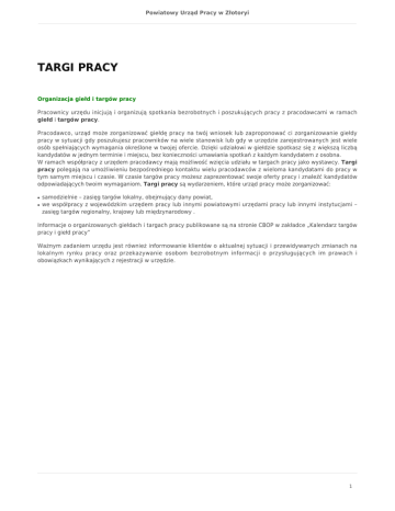 Powiatowy Urząd Pracy w Złotoryi TARGI PRACY Organizacja giełd i targów pracy Pracownicy urzędu inicjują i organizują spotkania bezrobotnych i poszukujących pracy z pracodawcami w ramach giełd i targów pracy. Pracodawco, urząd może zorganizować giełdę pracy na twój wniosek lub zaproponować ci zorganizowanie giełdy pracy w sytuacji gdy poszukujesz pracowników na wiele stanowisk lub gdy w urzędzie zarejestrowanych jest wiele osób spełniających wymagania określone w twojej ofercie. Dzięki udziałowi w giełdzie spotkasz się z większą liczbą kandydatów w jednym terminie i miejscu, bez konieczności umawiania spotkań z każdym kandydatem z osobna. W ramach współpracy z urzędem pracodawcy mają możliwość wzięcia udziału w targach pracy jako wystawcy. Targi pracy polegają na umożliwieniu bezpośredniego kontaktu wielu pracodawców z wieloma kandydatami do pracy w tym samym miejscu i czasie. W czasie targów pracy możesz zaprezentować swoje oferty pracy i znaleźć kandydatów odpowiadających twoim wymaganiom. Targi pracy są wydarzeniem, które urząd pracy może zorganizować: ● ● samodzielnie – zasięg targów lokalny, obejmujący dany powiat, we współpracy z wojewódzkim urzędem pracy lub innymi powiatowymi urzędami pracy lub innymi instytucjami – zasięg targów regionalny, krajowy lub międzynarodowy . Informacje o organizowanych giełdach i targach pracy publikowane są na stronie CBOP w zakładce „Kalendarz targów pracy i giełd pracy” Ważnym zadaniem urzędu jest również informowanie klientów o aktualnej sytuacji i przewidywanych zmianach na lokalnym rynku pracy oraz przekazywanie osobom bezrobotnym informacji o przysługujących im prawach i obowiązkach wynikających z rejestracji w urzędzie. 1 Powiatowy Urząd Pracy w Złotoryi 2