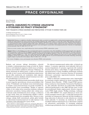 Medycyna Pracy, 2001; 52; 3; 177—183 177 PRACE ORYGINALNE Jerzy Koniarek Bohdan Dudek ZESPÓ£ ZABURZEÑ PO STRESIE URAZOWYM A STOSUNEK DO PRACY STRA¯AKÓW* POST-TRAUMATIC STRESS DISORDER AND FIREFIGHTERS’ ATTITUDE TO WARDS THEIR JOB Z Zakładu Psychologii Pracy Instytut Medycyny Pracy im. prof. J. Nofera w Łodzi Kierownik Zakładu: dr hab. B. Dudek STRESZCZENIE Strażacy, ze względu na charakter wykonywanych zadań, są narażeni na ciągły kontakt ze zdarzeniami traumatycznymi i u wielu z nich rozwija się zespół zaburzeń po stresie urazowym lub występują symptomy tego zespołu. Mimo to osoby takie zwykle dalej wykonują swoją pracę. W artykule przedstawiono, jak doświadczenia traumatyczne strażaków wpływają na ich stosunek do wykonywanej pracy. Badania przeprowadzono na reprezentatywnej próbie strażaków polskich (974 osoby). Stwierdzono, że im silniejsze objawy zaburzeń po stresie urazowym, tym mniejsze zadowolenie z pracy w straży, większa gotowość rezygnacji z niej i postrzeganie tej pracy jako wyczerpującej psychicznie i fizycznie, źle wpływającej na życie prywatne. Med. Pr. 2001; 52; 3; 177–183 Słowa kluczowe: strażacy, stres, zespół zaburzeń po stresie urazowym (PTSD), zadowolenie z pracy ABSTRACT Work in a fire-brigade is very often associated with exposure to traumatic events. Some firefighters manifest post-traumatic stress disorder (PTSD) symptoms. In spite of PTSD development, firefighters have to perform various tasks according to their responsibilities. The paper addresses the problem of the relationship between PTSD symptoms development and firefighters’ attitudes to their job. The survey covered a representative sample of Polish firefighters (n = 974). The results showed that the higher level of PTSD symptoms the lower level of work satisfaction among firefighters; and the more evident readiness to quit the job. They also indicated that the was perceived physically and mentally exhausting, and having negative impact on private life of the subjects. Med. Pr. 2001; 52; 3; 177–183 Key words: firefighters, stress, post-traumatic stress disorder (PTSD), work motivation Badania nad stresem, jakiego doświadcza człowiek w związku z wykonywaną pracą trwają od wielu lat. Stwierdzone w tych badaniach negatywne skutki stresu na funkcjonowanie pracowników (nadmierna absencja i fluktuacja, obniżona motywacja do dobrej pracy), a także na ich zdrowie sprawiły, że stres w pracy stał się przedmiotem zainteresowania nie tylko naukowców, ale i praktyków, ludzi odpowiedzialnych za sprawne działanie różnych instytucji oraz zdrowie zatrudnionych (1,2,3,4,5,6,7,8). Negatywne dla funkcjonowania pracownika skutki stresu w pracy mogą być spowodowane stresem przewlekłym i/lub ostrym. W badaniach nad skutkami stresu doświadczanego w związku z pracą koncentrowano się przede wszystkim na konsekwencjach stresu przewlekłego. Wynika to zapewne z faktu, iż ten rodzaj stresu towarzyszy każdemu rodzajowi aktywności zawodowej. Istnieją jednak takie rodzaje prac, w których ryzyko doświadczenia stresu ostrego, a zwłaszcza tej jego formy, która jest konsekwencją udziału w zdarzeniach traumatycznych jest szczególnie duże. Dotyczy to prac różnego rodzaju służb ratowniczych, policji, gdzie kontakt ze zdarzeniami traumatycznymi jest na stałe wpisany w rolę zawodową osób wykonujących te prace (9,10). *Praca wykonana w ramach programu badawczego zamawianego PBZ 010-11/1 dofinansowanego przez Komitet Badań Naukowych w latach 1997–2000. Zadanie pt. „Ocena zagrożeń zdrowotnych i opracowanie wytycznych dla profilaktyki zdrowia w Państwowej Straży Pożarnej”. Kierownik zadania: dr hab. B. Dudek. Do zdarzeń traumatycznych należą takie, w których ma miejsce: 1) poważne zagrożenie życia jednostki i/lub jej fizycznej integralności; 2) poważne zagrożenie lub zranienie doznane przez dzieci, osoby bliskie; 3) nagła destrukcja domu/społeczności; 4) bycie świadkiem niedawnego zranienia lub zabicia innej osoby, 5) przemoc fizyczna; 6) otrzymanie informacji o poważnym zagrożeniu/zranieniu doznanym przez osoby bliskie (11). Udział w zdarzeniu traumatycznym może doprowadzić do powstania zespołu zaburzeń po stresie urazowym (PostTraumatic Stress Disorder – PTSD). Zespół PTSD wprowadzony został przez Amerykańskie Towarzystwo Psychiatryczne, jako jednostka chorobowa do podręcznika klasyfikacji zaburzeń psychicznych w roku 1980. Od tego czasu, w wyniku prowadzonych badań empirycznych, kryteria rozpoznawania PTSD uległy zmianie. Według ostatniego, wydanego w roku 1994 DSM-IV (12), zespół zaburzeń po stresie urazowym występuje wówczas, gdy: 1) osoba była narażona bezpośrednio na traumatyczne zdarzenie lub była świadkiem takiego zdarzenia; 2) zdarzenie to stale odnawia się w świadomości jednostki; 3) utrzymuje się tendencja do unikania wszelkich bodźców kojarzących się ze zdarzeniem i pojawia się odrętwienie emocjonalne; 4) występują symptomy zwiększonego pobudzenia, które nie występowały przed zda- 178 J. Koniarek, B. Dudek rzeniem; 5) objawy wymienione w punktach 2, 3, 4 występują prze okres co najmniej jednego miesiąca. Badania nad PTSD koncentrują się na problemach częstości występowania tego zjawiska, poszukiwaniach obiektywnych i subiektywnych czynników sprzyjających rozwojowi PTSD. W dostępnej literaturze niewiele jest informacji o badaniach prowadzonych w zbiorowościach narażonych, z racji pełnionych obowiązków zawodowych, na częsty kontakt ze zdarzeniem traumatycznym, a w konsekwencji – na rozwój zaburzeń pourazowych, w których to badaniach próbowano by ustalić związki między zaburzeniami pourazowymi a funkcjonowaniem w roli zawodowej. W. Corneil (13) analizował m.in. związki między ryzykiem rozwoju PTSD a stresem organizacyjnym, doświadczanym przez strażaków, traktując tę ostatnią zmienną jako zmienną niezależną, a więc i to badanie l