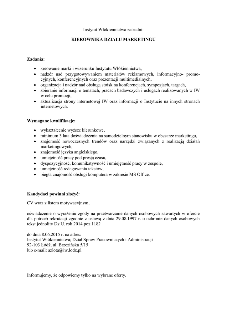Instytut Włókiennictwa zatrudni: KIEROWNIKA DZIAŁU MARKETINGU Zadania: kreowanie marki i wizerunku Instytutu Włókiennictwa, nadzór nad przygotowywaniem materiałów reklamowych, informacyjno- promocyjnych, konferencyjnych oraz prezentacji multimedialnych, organizacja i nadzór nad obsługą stoisk na konferencjach, sympozjach, targach, zbieranie informacji o tematach, pracach badawczych i usługach realizowanych w IW w celu promocji, aktualizacja strony internetowej IW oraz informacji o Instytucie na innych stronach internetowych. Wymagane kwalifikacje: wykształcenie wyższe kierunkowe, minimum 3 lata doświadczenia na samodzielnym stanowisku w obszarze marketingu, znajomość nowoczesnych trendów oraz narzędzi związanych z realizacją działań marketingowych, znajomość języka angielskiego, umiejętność pracy pod presją czasu, dyspozycyjność, komunikatywność i umiejętność pracy w zespole, umiejętność redagowania tekstów, biegła znajomość obsługi komputera w zakresie MS Office. Kandydaci powinni złożyć: CV wraz z listem motywacyjnym, oświadczenie o wyrażeniu zgody na przetwarzanie danych osobowych zawartych w ofercie dla potrzeb rekrutacji zgodnie z ustawą z dnia 29.08.1997 r. o ochronie danych osobowych tekst jednolity Dz.U. rok 2014 poz.1182 do dnia 8.06.2015 r. na adres: Instytut Włókiennictwa; Dział Spraw Pracowniczych i Administracji 92-103 Łódź, ul. Brzezińska 5/15 lub e-mail: [email protected] Informujemy, że odpowiemy tylko na wybrane oferty.