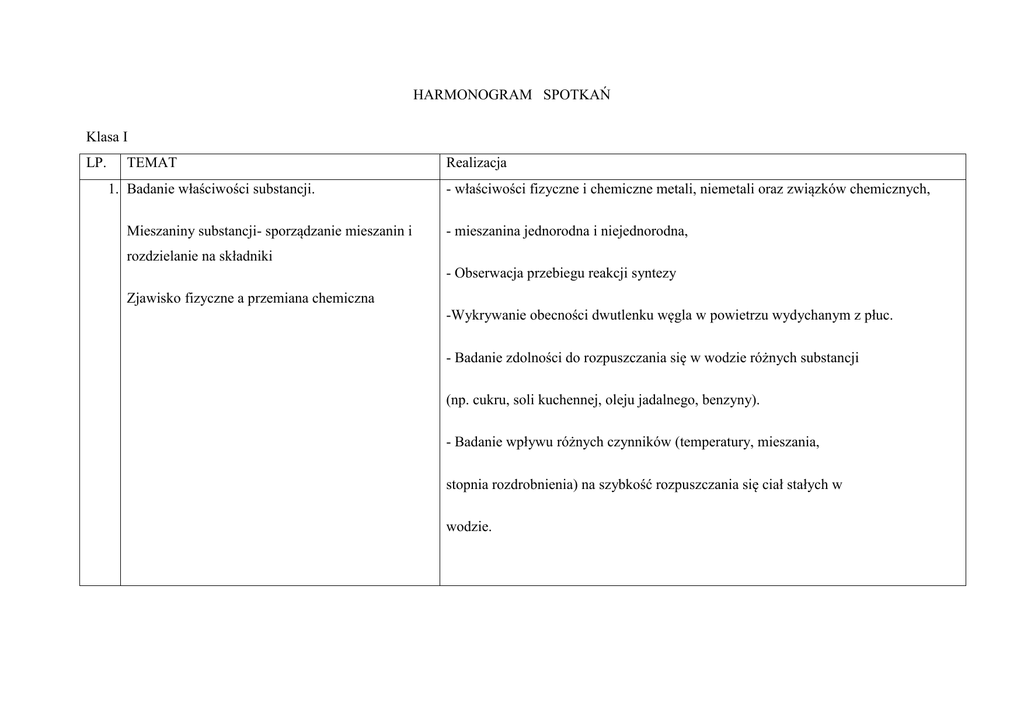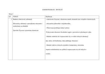 HARMONOGRAM SPOTKAŃ Klasa I LP. TEMAT 1. Badanie właściwości substancji. Mieszaniny substancji- sporządzanie mieszanin i Realizacja - właściwości fizyczne i chemiczne metali, niemetali oraz związków chemicznych, - mieszanina jednorodna i niejednorodna, rozdzielanie na składniki - Obserwacja przebiegu reakcji syntezy Zjawisko fizyczne a przemiana chemiczna -Wykrywanie obecności dwutlenku węgla w powietrzu wydychanym z płuc. - Badanie zdolności do rozpuszczania się w wodzie różnych substancji (np. cukru, soli kuchennej, oleju jadalnego, benzyny). - Badanie wpływu różnych czynników (temperatury, mieszania, stopnia rozdrobnienia) na szybkość rozpuszczania się ciał stałych w wodzie. Klasa II l.p Temat Realizacja 1 Związki nieorganiczne Otrzymywanie Mieszanie Badanie zmiany barwy wskaźników (np. fenoloftaleiny, wskaźnika uniwersalnego) w roztworach kwasów i wodorotlenków. Klasa III l.p Temat Realizacja 1 Pochodne węglowodorów Badanie właściwości etanolu. Badanie właściwości glicerolu. Badanie właściwości kwasu octowego Składniki żywności ( białka , cukry, tłuszcze )
