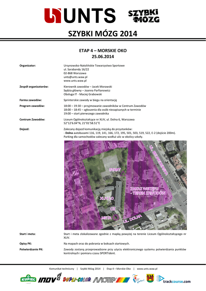 SZYBKI MÓZG 2014 ETAP 4 – MORSKIE OKO 25.06.2014 Organizator: Ursynowsko-Natolioskie Towarzystwo Sportowe ul. Sarabandy 16/22 02-868 Warszawa [email protected] www.unts.waw.pl Zespół organizatorów: Kierownik zawodów – Jacek Morawski Sędzia główny – Joanna Parfianowicz Obsługa IT - Maciej Grabowski Forma zawodów: Sprinterskie zawody w biegu na orientację Program zawodów: 18:00 – 19:30 – przyjmowanie zawodników w Centrum Zawodów 18:00 – 18:45 – zgłoszenia dla osób niezapisanych w terminie 19:00 – start pierwszego zawodnika Centrum Zawodów: Liceum Ogólnokształcące nr XLIV, ul. Dolna 6, Warszawa 52°12'6.04"N, 21°01'58.51"E Dojazd: Zalecany dojazd komunikacją miejską do przystanków: - Dolna autobusami 116, 119, 141, 166, 172, 195, 501, 503, 519, 522, E-2 (dojście 200m). Parking dla samochodów zalecany wzdłuż ulic w okolicy szkoły. Start i meta: Start i meta zlokalizowane zgodnie z mapką powyżej na terenie Liceum Ogólnokształcącego nr XLIV. Opisy PK: Na mapach oraz do pobrania w boksach startowych. Potwierdzanie PK: Zawody zostaną przeprowadzone przy użyciu elektronicznego systemu potwierdzania punktów kontrolnych i pomiaru czasu SPORTident. Komunikat techniczny | Szybki Mózg 2014 | Etap 4 – Morskie Oko | www.unts.waw.pl Dla osób, które nie posiadają kart SPORTident istnieje możliwośd ich wypożyczenia w dniu biegu. Chęd wypożyczenia karty SI należy zgłosid w formularzu zgłoszeniowym, a także wnieśd opłatę za jej wypożyczenie. Mapa: „Morskie Oko”, skala 1:4000, e-2.5m, aktualnośd: czerwiec 2014, autor: Maciej Gędziorowski, format mapy: 297x420mm Wszystkie mapy drukowane techniką cyfrową, dodatkowo zabezpieczone przed wilgocią. Teren: Teren zawodów obejmuje park Morskie Oko oraz okoliczne obszary zabudowane o zróżnicowanej charakterystyce. Występuje tu zarówno zabudowa blokowa, domy jednorodzinne oraz socrealistyczne kamienice wzdłuż ul. Puławskiej. Przez całośd terenu ciągnie się skarpa wiślana o przewyższeniu dochodzącym do 30m. UWAGA! Zawodnicy niejednokrotnie będą przebiegad przez małe uliczki, dlatego prosimy o zachowanie ostrożności przy ich przekraczaniu i stosowanie się do przepisów o ruchu drogowym. Zawodnik biegnący po ulicy nie ma pierwszeostwa przed samochodem! Trasy: Kategoria Opis Profesjonaliści Zuchwali Początkujący Dzieci skomplikowana trasa dla elity dla tych, co nie boją się wyzwao w sam raz dla rozpoczynających przygodę z orientacją krótka i łatwa trasa dla dzieci Trasa [km] 6.8 4.6 2.0 2.4 Liczba PK 28 19 10 12 UWAGA! Długości tras mierzone po najkrótszej linii łączącej punkty kontrolne na mapie z uwzględnieniem obiektów, które podczas biegu trzeba omijad (budynki, mury, tereny prywatne). GPS-tracking: Podczas zawodów z odbiornikami GPS pobiegną wybrani zawodnicy na trasie Profesjonalistów. Lista zawodników biegających z odbiornikami GPS zostanie opublikowana wraz z listami startowymi. Zawodnicy mają obowiązek odebrad odbiorniki na starcie. Limit czasu: Podczas zawodów wszystkich zawodników obowiązuje limit czasu, który wynosi 60 minut. Oznacza to, że osoby, które go przekroczą mogą nie zostad sklasyfikowane. Uczestnictwo: Warunkiem udziału w Szybkim Mózgu 2014 jest: - wyrażenie zgody na przestrzeganie niniejszego Regulaminu i tym samym pełna akceptacja powyższych regulacji oraz zobowiązanie się do ich przestrzegania, - udział w biegach na własną odpowiedzialnośd z pełną świadomością niebezpieczeostw i ryzyk wynikających z charakteru tego wydarzenia, - złożenie oświadczenia o braku przeciwwskazao do wzięcia udziału w zawodach biegowych, - wyrażenie zgody na przetwarzanie danych osobowych, - dokonanie zgłoszenia na zasadach określonych w kolejnym punkcie niniejszego Regulaminu. Zgłoszenia: Zgłoszenia przyjmowane są poprzez formularz zgłoszeniowy dostępny na stronie internetowej www.unts.waw.pl do godziny 23:59 w terminie określonym w programie zwodów. Zgłoszenia po terminie są możliwe wyłącznie w Centrum Zawodów w dniu biegu do 15 minut przed startem pierwszego zawodnika. Opłaty: 15PLN/osobę – zgłoszenie w terminie przez formularz zgłoszeniowy 20PLN/osobę – zgłoszenie w dniu biegu 75PLN/osobę – promocyjne zgłoszenie w terminie przez formularz zgłoszeniowy na wszystkie etapy cyklu (możliwe tylko przed 1. etapem) 3PLN – wypożyczenie karty SI 180PLN – zgubienie wypożyczonej karty SI Płatności: W przypadku osób zgłoszonych przez formularz zgłoszeniowy jedyną możliwością jest wniesienie opłaty w terminie zgłoszeo poprzez system płatności online dostępny na stronie www.unts.waw.pl. Nie ma możliwości przeniesienia wniesionego wpisowego na rzecz innego zawodnika. Komunikat techniczny | Szybki Mózg 2014 | Etap 4 – Morskie Oko | www.unts.waw.pl Osoby, które zgłosiły się przez formularz zgłoszeniowy, a nie dokonały wpłaty wpisowego w terminie zgłoszeo zostaną wykreślone z listy zgłoszonych i w razie chęci udziału w biegu będą musiały dokonad ponownej rejestracji w dniu zawodów. W przypadku osób zgłoszonych w dniu zawodów jedyną akceptowaną formą wniesienia opłaty za udział w zawodach jest płatnośd gotówką. Poprzez dokonanie opłaty uczestnik potwierdza, że zapoznał się z regulaminem i zobowiązuje się do jego przestrzegania oraz wyraża zgodę na przetwarzanie swoich danych osobowych na potrzeby organizacji zawodów Szybki Mózg 2014. Limit uczestników: Na zawodach nie obowiązuje limit uczestników, natomiast liczba osób, które mogą się zapisad na bieg w dniu zawodów będzie ograniczona do 10 osób w każdej kategorii. Wyniki: Wyniki poszczególnych etapów będą publikowane na stronie zawodów po każdym etapie. Klasyfikacja generalna: Podczas tegorocznej edycji Szybkiego Mózgu prowadzona będzie klasyfikacja generalna kobiet i mężczyzn w kategoriach wiekowych: Kategoria kobieca Kategoria męska KM10 Wiek w latach Rok urodzenia 