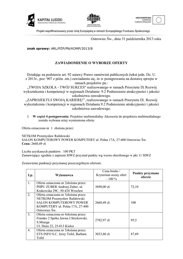 Ostrowiec Św., dnia 31 października 2013 roku znak sprawy: ARL/PZP/PN/KOMP/2013/8 ZAWIADOMIENIE O WYBORZE OFERTY Działając na podstawie art. 92 ustawy Prawo zamówień publicznych (tekst jedn. Dz. U. z 2013r., poz. 907 z późn. zm.) zawiadamia się, że w postępowaniu na dostawę sprzętu w ramach projektów pn.: „TWOJA SZKOŁA - TWÓJ SUKCES" realizowanego w ramach Priorytetu IX Rozwój wykształcenia i kompetencji w regionach Działanie: 9.2 Podniesienie atrakcyjności i jakości szkolnictwa zawodowego. „ZAPROJEKTUJ SWOJĄ KARIERĘ!”, realizowanego w ramach Priorytetu IX. Rozwój wykształcenia i kompetencji w regionach Działania 9.2 Podniesienie atrakcyjności i jakości szkolnictwa zawodowego. I. W części 4 postępowania: Projektor multimedialny Akcesoria do projektora multimedialnego została wybrana niżej wymieniona oferta: Oferta oznaczona nr 1 złożona przez: NETKOM Przemysław Rafałowski SALON KOMPUTEROWY POWER KOMPUTERY ul. Polna 17A, 27-400 Ostrowiec Św. Cena: 2660,49 zł. Liczba uzyskanych punktów: 100 PKT Zamawiający zgodnie z zapisem SIWZ przyznał punkty wg wzoru określonego w pkt 11 SIWZ Zestawienie punktacji przyznanej poszczególnym ofertom: Lp. 1. 2. 3. 4. Wykonawca Oferta oznaczona nr 2złożona przez: PHPU ZUBER Andrzej Zuber, ul. Krakowska 29C, 50-424 Wrocław Oferta oznaczona nr 3złożona przez: NETKOM Przemysław Rafałowski SALON KOMPUTEROWY POWER KOMPUTERY ul. Polna 17A, 27-400 Ostrowiec Św. Oferta oznaczona nr 4złożona przez: Framko 2 Spóka Jawna J.Strykowski, S.Miazga Ul. Duża 22, 25-013 Kielce Oferta oznaczona nr 5złożona przez: ETS INFO S.C. Jerzy Tofel, Barbara Tofel Cena brutto / Kryterium oceny ofert – 100 % Punkty przyznane ofercie 3690,00 zł. 72,10 2660,49 zł. 100 2782,97 zł. 95,5 3033,80 zł. 87,69 5. Ul. Szeroka 3/4, 27-400 Ostrowiec Św. Oferta oznaczona nr 1 złożona przez: RENDER 2000 Ul. Siennieńska 38 , 27-400 Ostrowiec Św. 3022,11 zł. 88 Uzasadnienie: Wybrana oferta spełnia wszystkie wymagania zamawiającego określone w treści SIWZ. Oferta uzyskała najwyższą ilość punktów – zawiera najniższą cenę dostawy. Oferta najkorzystniejsza w rozumieniu art. 2 pkt 5 PZP. Umowa w sprawie udzielenia zamówienia publicznego zostanie zawarta w dniu 7 listopada 2013r. w siedzibie Zamawiającego. Prezes Zarządu Magdalena Salwerowicz ........................................................ Zamawiający Do wiadomości: 1. 2. 3. 4. 5. PHPU ZUBER Andrzej Zuber, ul. Krakowska 29C, 50-424 Wrocław Framko 2 Spóka Jawna J.Strykowski, S.Miazga Ul. Duża 22, 25-013 Kielce NETKOM Przemysław Rafałowski SALON KOMPUTEROWY POWER KOMPUTERY ul. Polna 17A, 27-400 Ostrowiec Św. ETS INFO S.C. Jerzy Tofel, Barbara Tofel Ul. Szeroka 3/4, 27-400 Ostrowiec Św. RENDER 2000 Ul. Siennieńska 38 , 27-400 Ostrowiec Św.