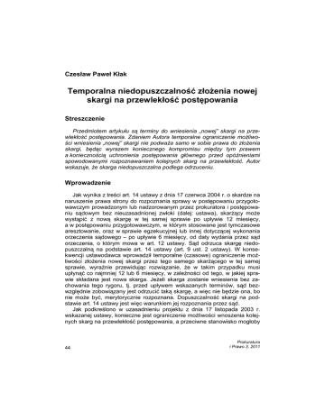 C. P. Kłak Czesław Paweł Kłak Temporalna niedopuszczalność złoŜenia nowej skargi na przewlekłość postępowania Streszczenie Przedmiotem artykułu są terminy do wniesienia „nowej” skargi na przewlekłość postępowania. Zdaniem Autora temporalne ograniczenie moŜliwości wniesienia „nowej” skargi nie podwaŜa samo w sobie prawa do złoŜenia skargi, będąc wyrazem koniecznego kompromisu między tym prawem a koniecznością uchronienia postępowania głównego przed opóźnieniami spowodowanymi rozpoznawaniem kolejnych skarg na przewlekłość. Autor wskazuje, Ŝe skarga niedopuszczalna podlega odrzuceniu. Wprowadzenie Jak wynika z treści art. 14 ustawy z dnia 17 czerwca 2004 r. o skardze na naruszenie prawa strony do rozpoznania sprawy w postępowaniu przygotowawczym prowadzonym lub nadzorowanym przez prokuratora i postępowaniu sądowym bez nieuzasadnionej zwłoki (dalej: ustawa), skarŜący moŜe wystąpić z nową skargę w tej samej sprawie po upływie 12 miesięcy, a w postępowaniu przygotowawczym, w którym stosowane jest tymczasowe aresztowanie, oraz w sprawie egzekucyjnej lub innej dotyczącej wykonania orzeczenia sądowego – po upływie 6 miesięcy, od daty wydania przez sąd orzeczenia, o którym mowa w art. 12 ustawy. Sąd odrzuca skargę niedopuszczalną na podstawie art. 14 ustawy (art. 9 ust. 2 ustawy). W konsekwencji ustawodawca wprowadził temporalne (czasowe) ograniczenie moŜliwości złoŜenia nowej skargi przez tego samego skarŜącego w tej samej sprawie, wyraźnie przewidując rozwiązanie, Ŝe w takim przypadku musi upłynąć co najmniej 12 lub 6 miesięcy, w zaleŜności od tego, w jakiej sprawie składana jest nowa skarga. JeŜeli skarga zostanie wniesienia bez zachowania tego rygoru, tj. przed upływem wskazanych terminów, sąd bezwzględnie zobowiązany jest odrzucić taką skargę, a więc nie będzie ona, bo nie moŜe być, merytorycznie rozpoznana. Dopuszczalność skargi na podstawie art. 14 ustawy jest więc warunkiem jej rozpoznania przez sąd. Jak podkreślono w uzasadnieniu projektu z dnia 17 listopada 2003 r. wskazanej ustawy, konieczne jest ograniczenie moŜliwości wnoszenia kolejnych skarg na przewlekłość postępowania, a przeciwne stanowisko mogłoby 44 Prokuratura i Prawo 3, 2011 Temporalna niedopuszczalność złoŜenia nowej skargi… doprowadzić do zniweczenia celu tej regulacji1. W uzasadnieniu projektu ustawy o zmianie ustawy o skardze na naruszenie prawa strony do rozpoznania sprawy w postępowaniu sądowym bez nieuzasadnionej zwłoki2 z dnia 30 października 2008 r., proponując nowelizację art. 14 w kontekście rozszerzenia zakresu ustawy o postępowania przygotowawcze, takŜe wskazano, Ŝe czasowe ograniczenie moŜliwości złoŜenia nowej skargi w postępowaniu przygotowawczym podyktowane jest koniecznością zapobieŜenia zniweczenia celu ustawy, do którego mogłoby dojść w sytuacji, gdy istniałaby moŜliwość składania nowych skarg, nieograniczona Ŝadnym terminem. Stanowisko to jest jak najbardziej racjonalne, albowiem nie ulega wątpliwości, Ŝe postępowanie incydentalne, jakim jest postępowanie w przedmiocie skargi na przewlekłość, nie moŜe paraliŜować (tamować) postępowania głównego. Musi więc istnieć rozwiązanie, które wyeliminuje „zatamowanie” postępowania głównego, ale przy jednoczesnym zapewnieniu moŜliwości złoŜenia nowej skargi. JeŜeli ma ona bowiem przeciwdziałać przewlekłości i być w tym zakresie skutecznym instrumentem ochrony prawa do rozpoznania sprawy „bez nieuzasadnionej zwłoki” („w rozsądnym terminie”), to musi być ona przed wszystkim „dostępna” dla strony, a to wyklucza wprowadzenie rozwiązań formalnych, bezzasadnie wykluczających moŜliwość złoŜenia kolejnej (kolejnych) skargi (skarg). Temporalne ograniczenie moŜliwości wniesienia „nowej” skargi nie podwaŜa samo w sobie prawa do złoŜenia skargi, będąc wyrazem koniecznego kompromisu między tym prawem a koniecznością uchronienia postępowania głównego przed opóźnieniami spowodowanymi rozpoznawaniem kolejnych skarg na przewlekłość. Z przywołanego uzasadnienia nie wynika, Ŝe rygor art. 14 ustawy ma odnosić się tylko i wyłącznie do podmiotu, który juŜ skorzystał z prawa do wniesienia skargi. Dokładna analiza argumentacji zawartej w uzasadnieniu projektu ustawy, jak równieŜ uzasadnienia projektu jej nowelizacji z dnia 30 października 2008 r., wskazuje na to, Ŝe celem tego przepisu jest „ograniczenie moŜliwości wnoszenia kolejnych skarg”, bez względu na to, kto jest ich autorem. Obecne brzmienie art. 14 ustawy nie koresponduje zatem z ratio legis tej regulacji, zawartym w przywołanych uzasadnieniach. 1 Uzasadnienie projektu ustawy o skardze na naruszenie prawa strony do rozpoznania w rozsądnym terminie sprawy w postępowaniu sądowym z dnia 17 listopada 2003 r., druk sejmowy nr 2256, publ. www.sejm.gov.pl. 2 Druk sejmowy nr 1281, publ. www.sejm.gov.pl. Prokuratura i Prawo 3, 2011 45 C. P. Kłak Zakres zastosowania art. 14 ustawy Art. 14 ustawy z dnia 17 czerwca 2004 r. odnosi się do skarŜącego, który wniósł skargę na przewlekłość postępowania i w sprawie wydane zostało orzeczenie, o którym mowa w art. 12 ustawy. Tym samym ograniczenie zawarte w tym przepisie dotyczy wyłącznie osoby, która skorzystała juŜ z moŜliwości wniesienia skargi, w następstwie czego wydano orzeczenie merytoryczne w przedmiocie skargi, przy czym nie ma znaczenia, czy sąd oddalił skargę (art. 12 ust. 1 ustawy), czy teŜ stwierdził, Ŝe w postępowaniu którego skarga dotyczy, nastąpiła przewlekłość postępowania (art. 12 ust. 2 ustawy). Art. 14 ustawy wyraźnie stanowi, Ŝe wskazane w nim terminy liczy się od daty wydania przez sąd orzeczenia, o którym mowa w art. 12 ustawy, a więc znajduje on zastosowanie bez względu na treść merytorycznego orzeczenia w przedmiocie skargi. Na bieg tych terminów nie ma wpływu przesunięcie post