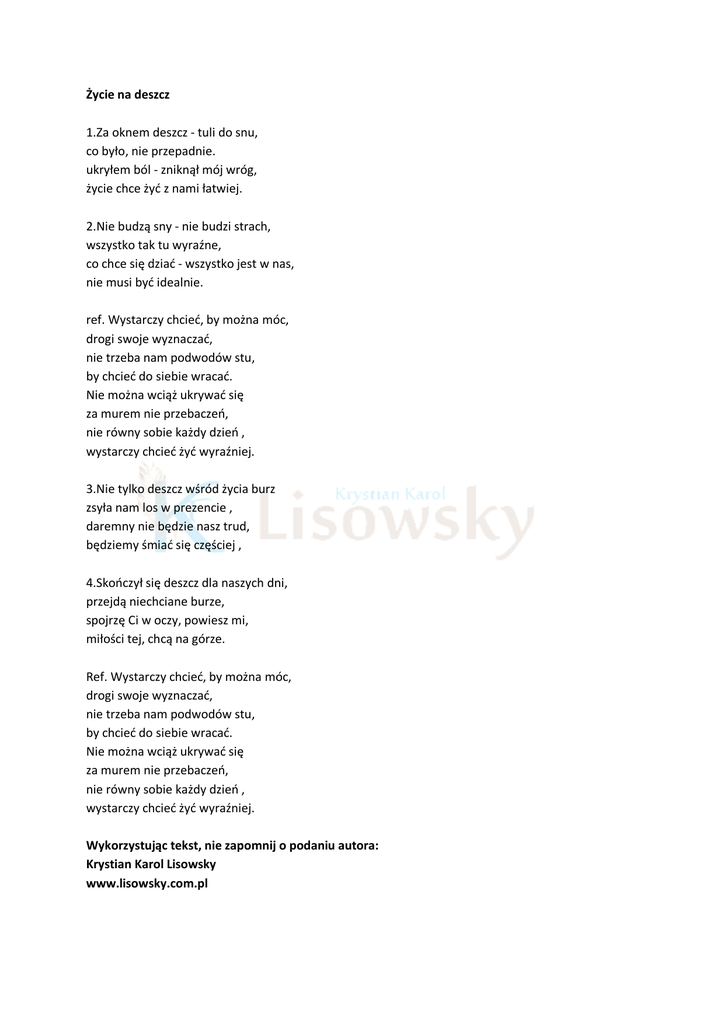 Życie na deszcz 1.Za oknem deszcz - tuli do snu, co było, nie przepadnie. ukryłem ból - zniknął mój wróg, życie chce żyć z nami łatwiej. 2.Nie budzą sny - nie budzi strach, wszystko tak tu wyraźne, co chce się dziać - wszystko jest w nas, nie musi być idealnie. ref. Wystarczy chcieć, by można móc, drogi swoje wyznaczać, nie trzeba nam podwodów stu, by chcieć do siebie wracać. Nie można wciąż ukrywać się za murem nie przebaczeń, nie równy sobie każdy dzień , wystarczy chcieć żyć wyraźniej. 3.Nie tylko deszcz wśród życia burz zsyła nam los w prezencie , daremny nie będzie nasz trud, będziemy śmiać się częściej , 4.Skończył się deszcz dla naszych dni, przejdą niechciane burze, spojrzę Ci w oczy, powiesz mi, miłości tej, chcą na górze. Ref. Wystarczy chcieć, by można móc, drogi swoje wyznaczać, nie trzeba nam podwodów stu, by chcieć do siebie wracać. Nie można wciąż ukrywać się za murem nie przebaczeń, nie równy sobie każdy dzień , wystarczy chcieć żyć wyraźniej. Wykorzystując tekst, nie zapomnij o podaniu autora: Krystian Karol Lisowsky www.lisowsky.com.pl