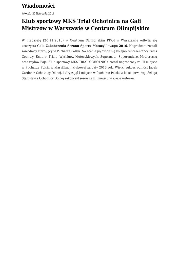 Wiadomości Wtorek, 22 listopada 2016 Klub sportowy MKS Trial Ochotnica na Gali Mistrzów w Warszawie w Centrum Olimpijskim W niedzielę (20.11.2016) w Centrum Olimpijskim PKOl w Warszawie odbyła się uroczysta Gala Zakończenia Sezonu Sportu Motocyklowego 2016. Nagrodzeni zostali zawodnicy startujący w Pucharze Polski. Na scenie pojawiali się kolejno reprezentanci Cross Country, Enduro, Trialu, Wyścigów Motocyklowych, Supermoto, Superenduro, Motocrossu oraz rajdów Baja. Klub sportowy MKS TRIAL OCHOTNICA został nagrodzony za III miejsce w Pucharze Polski w klasyfikacji klubowej za cały 2016 rok. Wielki sukces odniósł Jacek Gardoń z Ochotnicy Dolnej, który zajął I miejsce w Pucharze Polski w klasie otwartej. Szlaga Stanisław z Ochotnicy Dolnej zakończył sezon na III miejscu w klasie weteran.