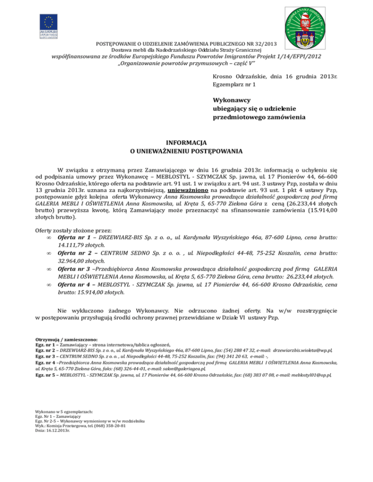 POSTĘPOWANIE O UDZIELENIE ZAMÓWIENIA PUBLICZNEGO NR 32/2013 Dostawa mebli dla Nadodrzańskiego Oddziału Straży Granicznej współfinansowana ze środków Europejskiego Funduszu Powrotów Imigrantów Projekt 1/14/EFPI/2012 „Organizowanie powrotów przymusowych – część V” Krosno Odrzańskie, dnia 16 grudnia 2013r. Egzemplarz nr 1 Wykonawcy ubiegający się o udzielenie przedmiotowego zamówienia INFORMACJA O UNIEWAŻNIENIU POSTĘPOWANIA W związku z otrzymaną przez Zamawiającego w dniu 16 grudnia 2013r. informacją o uchyleniu się od podpisania umowy przez Wykonawcę – MEBLOSTYL - SZYMCZAK Sp. jawna, ul. 17 Pionierów 44, 66-600 Krosno Odrzańskie, którego oferta na podstawie art. 91 ust. 1 w związku z art. 94 ust. 3 ustawy Pzp, została w dniu 13 grudnia 2013r. uznana za najkorzystniejszą, unieważniono na podstawie art. 93 ust. 1 pkt 4 ustawy Pzp, postępowanie gdyż kolejna oferta Wykonawcy Anna Kosmowska prowadząca działalność gospodarczą pod firmą GALERIA MEBLI I OŚWIETLENIA Anna Kosmowska, ul. Kręta 5, 65-770 Zielona Góra z ceną (26.233,44 złotych brutto) przewyższa kwotę, którą Zamawiający może przeznaczyć na sfinansowanie zamówienia (15.914,00 złotych brutto). Oferty zostały złożone przez: • Oferta nr 1 – DRZEWIARZ-BIS Sp. z o. o., ul. Kardynała Wyszyńskiego 46a, 87-600 Lipno, cena brutto: 14.111,79 złotych. • Oferta nr 2 – CENTRUM SEDNO Sp. z o. o. , ul. Niepodległości 44-48, 75-252 Koszalin, cena brutto: 32.964,00 złotych. • Oferta nr 3 –Przedsiębiorca Anna Kosmowska prowadząca działalność gospodarczą pod firmą GALERIA MEBLI I OŚWIETLENIA Anna Kosmowska, ul. Kręta 5, 65-770 Zielona Góra, cena brutto: 26.233,44 złotych. • Oferta nr 4 – MEBLOSTYL - SZYMCZAK Sp. jawna, ul. 17 Pionierów 44, 66-600 Krosno Odrzańskie, cena brutto: 15.914,00 złotych. Nie wykluczono żadnego Wykonawcy. Nie odrzucono żadnej oferty. Na w/w rozstrzygnięcie w postępowaniu przysługują środki ochrony prawnej przewidziane w Dziale VI ustawy Pzp. Otrzymują / zamieszczono: Egz. nr 1 – Zamawiający – strona internetowa/tablica ogłoszeń, Egz. nr 2 – DRZEWIARZ-BIS Sp. z o. o., ul. Kardynała Wyszyńskiego 46a, 87-600 Lipno, fax: (54) 288 47 32, e-mail: [email protected], Egz. nr 3 – CENTRUM SEDNO Sp. z o. o. , ul. Niepodległości 44-48, 75-252 Koszalin, fax: (94) 341 20 63, e-mail: -, Egz. nr 4 –Przedsiębiorca Anna Kosmowska prowadząca działalność gospodarczą pod firmą GALERIA MEBLI I OŚWIETLENIA Anna Kosmowska, ul. Kręta 5, 65-770 Zielona Góra, faks: (68) 326-44-01, e-mail: [email protected], Egz. nr 5 – MEBLOSTYL - SZYMCZAK Sp. jawna, ul. 17 Pionierów 44, 66-600 Krosno Odrzańskie, fax: (68) 383 07 08, e-mail: [email protected], Wykonano w 5 egzemplarzach: Egz. Nr 1 – Zamawiający Egz. Nr 2-5 – Wykonawcy wymieniony w w/w rozdzielniku Wyk.: Komisja Przetargowa, tel. (068) 358-20-81 Dnia: 16.12.2013r. Dokument podpisał: