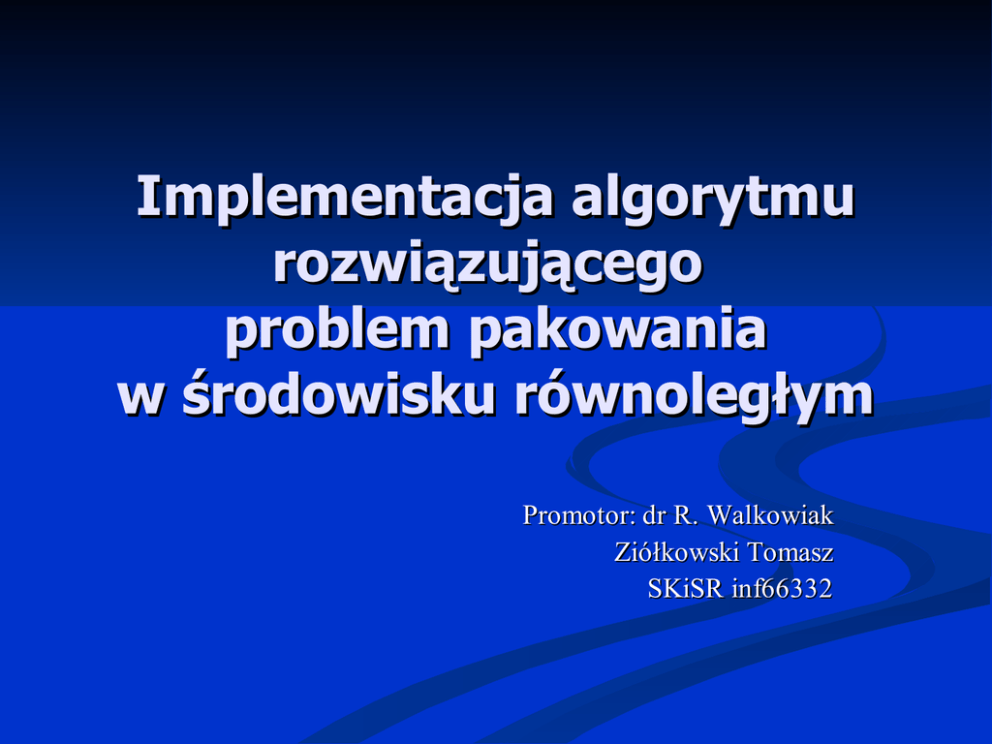 Implementacja algorytmu rozwiązującego problem pakowania w środowisku równoległym Promotor: dr R. Walkowiak Ziółkowski Tomasz SKiSR inf66332 Zawartość pracy Definicja problemu Równoważenie obciążeń Zarządzanie pamięcią Problemy kombinatoryczne Optymalizacja i programowanie matematyczne Narzędzia powiązane z OpenMP Tomasz Ziółkowski 2 Definicja problemu Dane wejściowe : m (typów) – pojemników, określonych przez koszt i rozmiar n - elementów, określonych przez rozmiar Zadanie : Optymalizacja(minimalizacja) kosztu zestawu pojemników (mogących pomieścić elementy wejściowe) Tomasz Ziółkowski 3 Technologia, narzędzia ANSI C OpenMP Perfex Speedshop lpsolve Linux Tomasz Ziółkowski 4 Problemy do rozwiązania(1) Równoważenie obciążeń, heurystyki, B&B Alokacja pamięci (dynamiczna alokacja wykonywana równolegle jest nieefektywna) Zarządzanie pamięcią (dysponujemy ograniczonymi zasobami) Komunikacja między procesami Tomasz Ziółkowski 5 Problemy do rozwiązania(2) Wpływ liczby CPU na wzrost efektywności przetwarzania Aspekty programowania równoległego podnoszone na lab. AiSR Wykorzystanie biblioteki lpsolve w środowisku równoległym Tomasz Ziółkowski 6