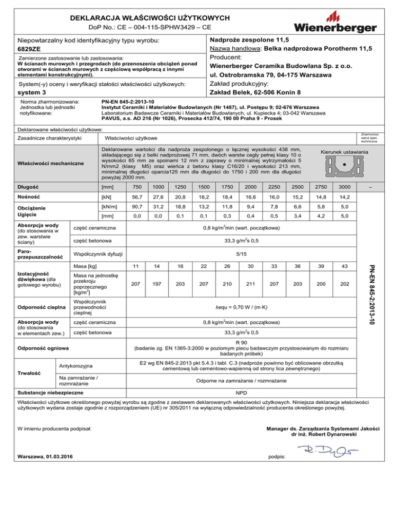 DEKLARACJA WŁAŚCIWOŚCI UŻYTKOWYCH DoP No.: CE – 004-115-SPHW3429 – CE Nadproże zespolone 11,5 Nazwa handlowa: Belka nadprożowa Porotherm 11,5 Producent: Wienerberger Ceramika Budowlana Sp. z o.o. ul. Ostrobramska 79, 04-175 Warszawa Zakład produkcyjny: Zakład Belek, 62-506 Konin 8 Niepowtarzalny kod identyfikacyjny typu wyrobu: 6829ZE Zamierzone zastosowanie lub zastosowania: W ścianach murowych i przegrodach (do przenoszenia obciążeń ponad otworami w ścianach murowych z częściową współpracą z innymi elementami konstrukcyjnymi). System(-y) oceny i weryfikacji stałości właściwości użytkowych: system 3 Norma zharmonizowana: Jednostka lub jednostki notyfikowane: PN-EN 845-2:2013-10 Instytut Ceramiki i Materiałów Budowlanych (Nr 1487), ul. Postępu 9; 02-676 Warszawa Laboratorium Badawcze Ceramiki i Materiałów Budowlanych, ul. Kupiecka 4; 03-042 Warszawa PAVUS, a.s. AO 216 (Nr 1026), Prosecka 412/74, 190 00 Praha 9 - Prosek Deklarowane właściwości użytkowe: Zasadnicze charakterystyki Zharmonizo wana spec. techniczna Właściwości użytkowe Właściwości mechaniczne Deklarowane wartości dla nadproża zespolonego o łącznej wysokości 438 mm, składającego się z belki nadprożowej 71 mm, dwóch warstw cegły pełnej klasy 10 o wysokości 65 mm ze spoinami 12 mm z zaprawy o minimalnej wytrzymałości 5 N/mm2 (klasy M5) oraz wieńca z betonu klasy C16/20 i wysokości 213 mm, minimalnej długości oparcia125 mm dla długości do 1750 i 200 mm dla długości powyżej 2000 mm. Długość [mm] 750 1000 1250 1500 1750 2000 2250 2500 2750 3000 Nośność [kN] 56,7 27,6 20,8 18,2 18,4 16,6 16,0 15,2 14,8 14,2 Obciążenie Ugięcie [kN/m] 90,7 31,2 18,8 13,2 11,8 9,4 7,8 6,6 5,8 5,0 [mm] 0,0 0,0 0,1 0,1 0,3 0,4 0,5 3,4 4,2 5,0 Absorpcja wody (do stosowania w zew. warstwie ściany) 33,3 g/m2s 0,5 część betonowa Odporność cieplna Absorpcja wody (do stosowania w elementach zew.) Współczynnik dyfuzji 5/15 Masa [kg] 11 14 18 22 26 30 33 36 39 43 Masa na jednostkę przekroju poprzecznego [kg/m2] 207 197 203 207 210 211 207 203 200 202 Współczynnik przewodności cieplnej część ceramiczna część betonowa Odporność ogniowa Antykorozyjna λequ = 0,70 W / (m·K) 0,8 kg/m2min (wart. początkowa) PN-EN 845-2:2013-10 Izolacyjność dźwiękowa (dla gotowego wyrobu) – 0,8 kg/m2min (wart. początkowa) część ceramiczna Paroprzepuszczalność Kierunek ustawiania 33,3 g/m2s 0,5 R 90 (badanie zg. EN 1365-3:2000 w poziomym piecu badawczym przystosowanym do rozmiaru badanych próbek) E2 wg EN 845-2:2013 pkt 5.4.3 i tabl. C.3 (nadproże powinno być oblicowane obrzutką cementową lub cementowo-wapienną od strony lica zewnętrznego) Trwałość Na zamrażanie / rozmrażanie Substancje niebezpieczne Odporne na zamrażanie / rozmrażanie NPD Właściwości użytkowe określonego powyżej wyrobu są zgodne z zestawem deklarowanych właściwości użytkowych. Niniejsza deklaracja właściwości użytkowych wydana zostaje zgodnie z rozporządzeniem (UE) nr 305/2011 na wyłączną odpowiedzialność producenta określonego powyżej. W imieniu producenta podpisał: Warszawa, 01.03.2016 Manager ds. Zarządzania Systemami Jakości dr inż. Robert Dynarowski podpis: