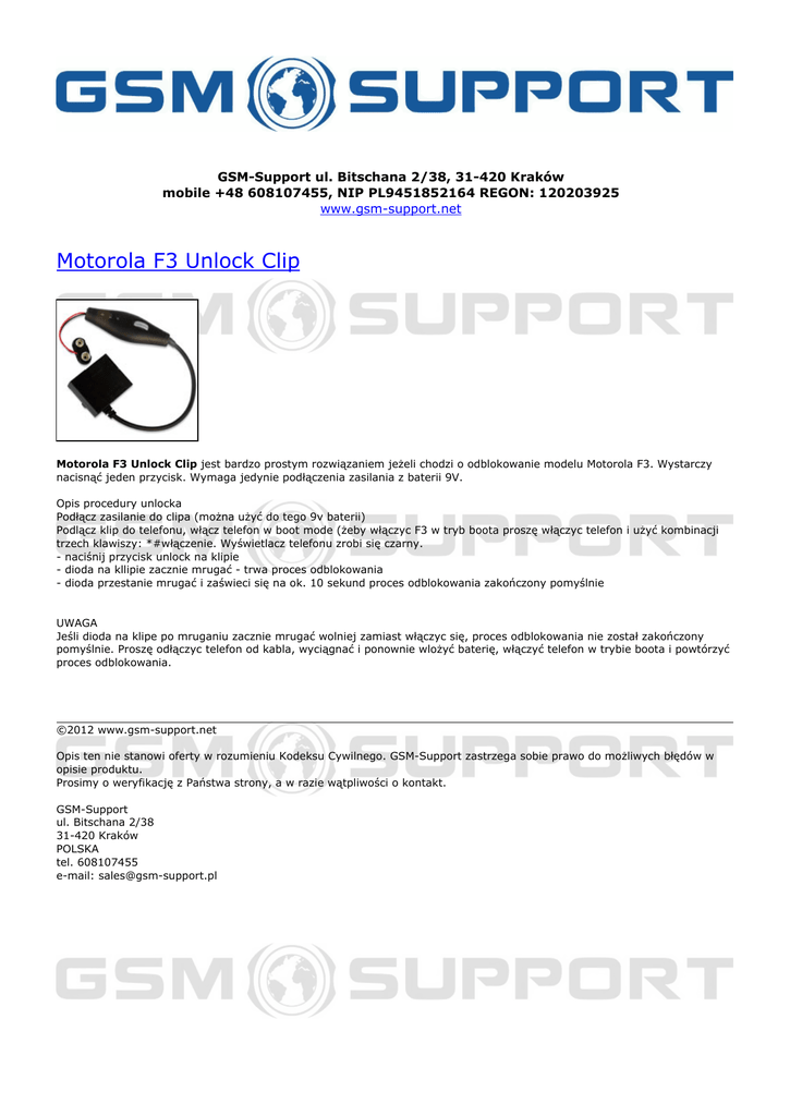 GSM-Support ul. Bitschana 2/38, 31-420 Kraków mobile +48 608107455, NIP PL9451852164 REGON: 120203925 www.gsm-support.net Motorola F3 Unlock Clip Motorola F3 Unlock Clip jest bardzo prostym rozwiązaniem jeżeli chodzi o odblokowanie modelu Motorola F3. Wystarczy nacisnąć jeden przycisk. Wymaga jedynie podłączenia zasilania z baterii 9V. Opis procedury unlocka Podłącz zasilanie do clipa (można użyć do tego 9v baterii) Podlącz klip do telefonu, włącz telefon w boot mode (żeby włączyc F3 w tryb boota proszę włączyc telefon i użyć kombinacji trzech klawiszy: *#włączenie. Wyświetlacz telefonu zrobi się czarny. - naciśnij przycisk unlock na klipie - dioda na kllipie zacznie mrugać - trwa proces odblokowania - dioda przestanie mrugać i zaświeci się na ok. 10 sekund proces odblokowania zakończony pomyślnie UWAGA Jeśli dioda na klipe po mruganiu zacznie mrugać wolniej zamiast włączyc się, proces odblokowania nie został zakończony pomyślnie. Proszę odłączyc telefon od kabla, wyciągnać i ponownie wlożyć baterię, włączyć telefon w trybie boota i powtórzyć proces odblokowania. ©2012 www.gsm-support.net Opis ten nie stanowi oferty w rozumieniu Kodeksu Cywilnego. GSM-Support zastrzega sobie prawo do możliwych błędów w opisie produktu. Prosimy o weryfikację z Państwa strony, a w razie wątpliwości o kontakt. GSM-Support ul. Bitschana 2/38 31-420 Kraków POLSKA tel. 608107455 e-mail: [email protected] Powered by TCPDF (www.tcpdf.org)