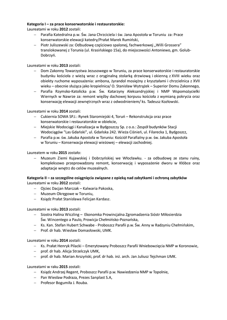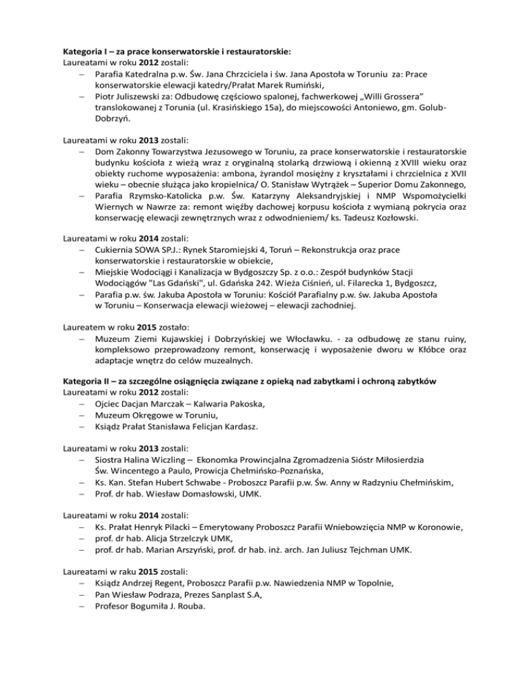 Kategoria I – za prace konserwatorskie i restauratorskie: Laureatami w roku 2012 zostali: Parafia Katedralna p.w. Św. Jana Chrzciciela i św. Jana Apostoła w Toruniu za: Prace konserwatorskie elewacji katedry/Prałat Marek Rumiński, Piotr Juliszewski za: Odbudowę częściowo spalonej, fachwerkowej „Willi Grossera” translokowanej z Torunia (ul. Krasińskiego 15a), do miejscowości Antoniewo, gm. GolubDobrzyń. Laureatami w roku 2013 zostali: Dom Zakonny Towarzystwa Jezusowego w Toruniu, za prace konserwatorskie i restauratorskie budynku kościoła z wieżą wraz z oryginalną stolarką drzwiową i okienną z XVIII wieku oraz obiekty ruchome wyposażenia: ambona, żyrandol mosiężny z kryształami i chrzcielnica z XVII wieku – obecnie służąca jako kropielnica/ O. Stanisław Wytrążek – Superior Domu Zakonnego, Parafia Rzymsko-Katolicka p.w. Św. Katarzyny Aleksandryjskiej i NMP Wspomożycielki Wiernych w Nawrze za: remont więźby dachowej korpusu kościoła z wymianą pokrycia oraz konserwację elewacji zewnętrznych wraz z odwodnieniem/ ks. Tadeusz Kozłowski. Laureatami w roku 2014 zostali: Cukiernia SOWA SP.J.: Rynek Staromiejski 4, Toruń – Rekonstrukcja oraz prace konserwatorskie i restauratorskie w obiekcie, Miejskie Wodociągi i Kanalizacja w Bydgoszczy Sp. z o.o.: Zespół budynków Stacji Wodociągów "Las Gdański", ul. Gdańska 242. Wieża Ciśnień, ul. Filarecka 1, Bydgoszcz, Parafia p.w. św. Jakuba Apostoła w Toruniu: Kościół Parafialny p.w. św. Jakuba Apostoła w Toruniu – Konserwacja elewacji wieżowej – elewacji zachodniej. Laureatem w roku 2015 zostało: Muzeum Ziemi Kujawskiej i Dobrzyńskiej we Włocławku. - za odbudowę ze stanu ruiny, kompleksowo przeprowadzony remont, konserwację i wyposażenie dworu w Kłóbce oraz adaptacje wnętrz do celów muzealnych. Kategoria II – za szczególne osiągnięcia związane z opieką nad zabytkami i ochroną zabytków Laureatami w roku 2012 zostali: Ojciec Dacjan Marczak – Kalwaria Pakoska, Muzeum Okręgowe w Toruniu, Ksiądz Prałat Stanisława Felicjan Kardasz. Laureatami w roku 2013 zostali: Siostra Halina Wiczling – Ekonomka Prowincjalna Zgromadzenia Sióstr Miłosierdzia Św. Wincentego a Paulo, Prowicja Chełmińsko-Poznańska, Ks. Kan. Stefan Hubert Schwabe - Proboszcz Parafii p.w. Św. Anny w Radzyniu Chełmińskim, Prof. dr hab. Wiesław Domasłowski, UMK. Laureatami w roku 2014 zostali: Ks. Prałat Henryk Pilacki – Emerytowany Proboszcz Parafii Wniebowzięcia NMP w Koronowie, prof. dr hab. Alicja Strzelczyk UMK, prof. dr hab. Marian Arszyński, prof. dr hab. inż. arch. Jan Juliusz Tejchman UMK. Laureatami w raku 2015 zostali: Ksiądz Andrzej Regent, Proboszcz Parafii p.w. Nawiedzenia NMP w Topolnie, Pan Wiesław Podraza, Prezes Sanplast S.A, Profesor Bogumiła J. Rouba.