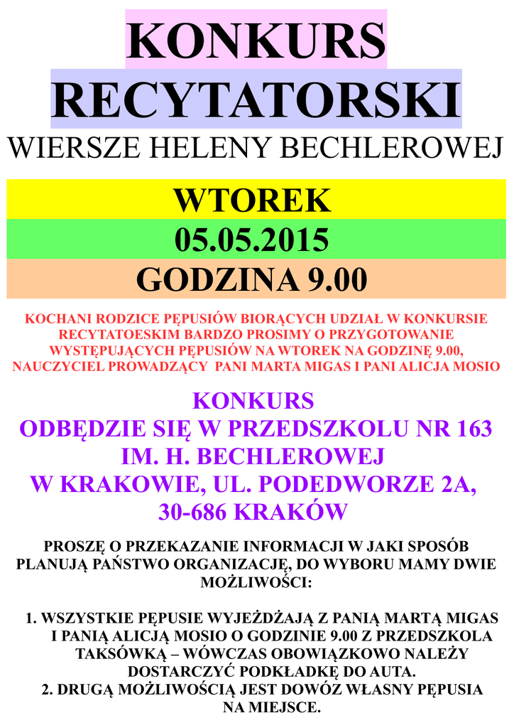 KONKURS RECYTATORSKI WIERSZE HELENY BECHLEROWEJ WTOREK 05.05.2015 GODZINA 9.00 KOCHANI RODZICE PĘPUSIÓW BIORĄCYCH UDZIAŁ W KONKURSIE RECYTATOESKIM BARDZO PROSIMY O PRZYGOTOWANIE WYSTĘPUJĄCYCH PĘPUSIÓW NA WTOREK NA GODZINĘ 9.00, NAUCZYCIEL PROWADZĄCY PANI MARTA MIGAS I PANI ALICJA MOSIO KONKURS ODBĘDZIE SIĘ W PRZEDSZKOLU NR 163 IM. H. BECHLEROWEJ W KRAKOWIE, UL. PODEDWORZE 2A, 30-686 KRAKÓW PROSZĘ O PRZEKAZANIE INFORMACJI W JAKI SPOSÓB PLANUJĄ PAŃSTWO ORGANIZACJĘ, DO WYBORU MAMY DWIE MOŻLIWOŚCI: 1. WSZYSTKIE PĘPUSIE WYJEŻDŻAJĄ Z PANIĄ MARTĄ MIGAS I PANIĄ ALICJĄ MOSIO O GODZINIE 9.00 Z PRZEDSZKOLA TAKSÓWKĄ – WÓWCZAS OBOWIĄZKOWO NALEŻY DOSTARCZYĆ PODKŁADKĘ DO AUTA. 2. DRUGĄ MOŻLIWOŚCIĄ JEST DOWÓZ WŁASNY PĘPUSIA NA MIEJSCE. BARDZO PROSZĘ O PRZEKAZANIE INFORMACJI DO PAŃ PROWADZĄCYCH WYBRANEGO SPOSOBU DOJAZDU, ABYŚMY MOGLI USTALIĆ ILOŚĆ KONIECZNEGO TRANSPORTU I ORGANIZACJ Ę KONKURSU. OD 9.30 ROZPOCZYNA SIĘ KONKURS, KTÓRY PLANOWO MA ZAKOŃCZYĆ SIĘ DLA NASZEGO PRZEDSZKOLA „PĘPUŚ ŚWIATA” OKOŁO 10.30 PROSIMY RÓWNIEŻ O PRZYGOTOWANIE ODPOWIEDNICH STROJÓW DLA PEPUSIÓW: 1. JULIA JAMROZIK- „ LEKARSTWO DLA MISIA” - STRÓJ PANI DOKTOR I PLUSZAK MISIU 2. PIOTR BĄKIEWICZ - „ O DWÓCH KOTKACH „ - STRÓJ KOTKA I PLUSZAK KOTEK 3. OLIWIA JURUSZ - „ŻYRAFA” - STRÓJ W KOLORACH ŻÓŁTYCH 4. JAN KRALKA - „BAJKA DLA MAMY” - STRÓJ ELEGANCKI 5. KAROLINA DREWIENKIEWICZ - „ LIST DO JASKÓŁKI” STRÓJ KOLORACH CZARNO BIAŁYCH 6. MAGDALENA STAŚKO - „ POKAŻ MI SWÓJ DOMEK „ - STRÓJ ELEGANCKI