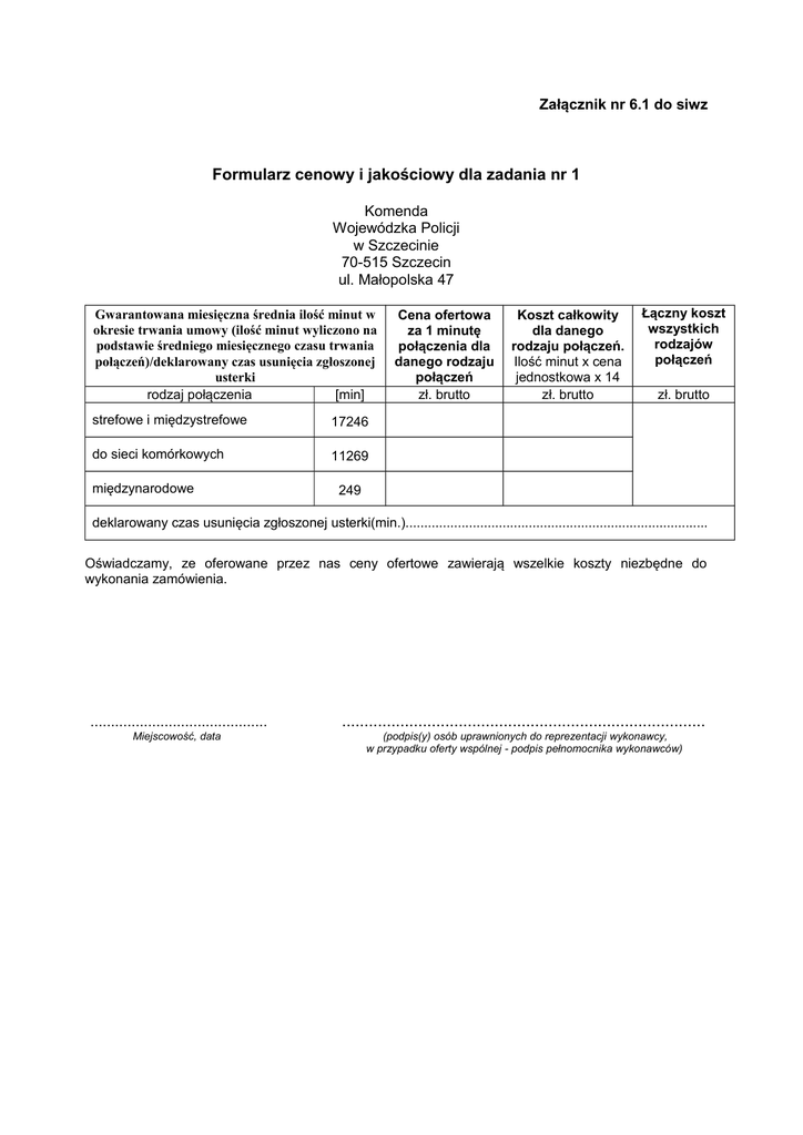 Załącznik nr 6.1 do siwz Formularz cenowy i jakościowy dla zadania nr 1 Komenda Wojewódzka Policji w Szczecinie 70-515 Szczecin ul. Małopolska 47 Gwarantowana miesięczna średnia ilość minut w okresie trwania umowy (ilość minut wyliczono na podstawie średniego miesięcznego czasu trwania połączeń)/deklarowany czas usunięcia zgłoszonej usterki rodzaj połączenia [min] strefowe i międzystrefowe 17246 do sieci komórkowych 11269 międzynarodowe Cena ofertowa za 1 minutę połączenia dla danego rodzaju połączeń zł. brutto Koszt całkowity dla danego rodzaju połączeń. Ilość minut x cena jednostkowa x 14 zł. brutto Łączny koszt wszystkich rodzajów połączeń zł. brutto 249 deklarowany czas usunięcia zgłoszonej usterki(min.)................................................................................. Oświadczamy, ze oferowane przez nas ceny ofertowe zawierają wszelkie koszty niezbędne do wykonania zamówienia. ........................................... ................................................................................. Miejscowość, data (podpis(y) osób uprawnionych do reprezentacji wykonawcy, w przypadku oferty wspólnej - podpis pełnomocnika wykonawców) Załącznik nr 6.2 do siwz Formularz cenowy i jakościowy dla zadania nr 2 Komenda Miejska Policji w Świnoujściu 72-600 Świnoujście, ul. Krzywoustego 2a Gwarantowana miesięczna średnia ilość minut w okresie trwania umowy (ilość minut wyliczono na podstawie średniego miesięcznego czasu trwania połączeń)/deklarowany czas usunięcia zgłoszonej usterki rodzaj połączenia [min] Strefowe i międzystrefowe 214 do sieci komórkowych 340 Cena ofertowa za 1 minutę połączenia dla danego rodzaju połączeń zł. brutto Koszt całkowity dla danego rodzaju połączeń. Ilość minut x cena jednostkowa x 14 zł. brutto Łączny koszt wszystkich rodzajów połączeń zł. brutto deklarowany czas usunięcia zgłoszonej usterki (min.)................................................................. Oświadczamy, ze oferowane przez nas ceny ofertowe zawierają wszelkie koszty niezbędne do wykonania zamówienia. ........................................... ................................................................................. Miejscowość, data (podpis(y) osób uprawnionych do reprezentacji wykonawcy, w przypadku oferty wspólnej - podpis pełnomocnika wykonawców) Załącznik nr 6.3 do siwz Formularz cenowy i jakościowy dla zadania nr 3 Komenda Miejska Policji w Koszalinie 75-009 Koszalin, ul. Słowackiego 11 Gwarantowana miesięczna średnia ilość minut w okresie trwania umowy (ilość minut wyliczono na podstawie średniego miesięcznego czasu trwania połączeń)/deklarowany czas usunięcia zgłoszonej usterki rodzaj połączenia [min] Strefowe i międzystrefowe 3467 do sieci komórkowych 1367 Cena ofertowa za 1 minutę połączenia dla danego rodzaju połączeń zł. brutto Koszt całkowity dla danego rodzaju połączeń. Ilość minut x cena jednostkowa x 14 Łączny koszt wszystkich rodzajów połączeń zł. brutto zł. brutto deklarowany czas usunięcia zgłoszonej usterki (min.)................................................................. Oświadczamy, ze oferowane przez nas ceny ofertowe zawierają wszelkie koszty niezbędne do wykonania zamówienia. ........................................... ................................................................................. Miejscowość, data (podpis(y) osób uprawnionych do reprezentacji wykonawcy, w przypadku oferty wspólnej - podpis pełnomocnika wykonawców) Załącznik nr 6.4 do siwz Formularz cenowy i jakościowy dla zadania nr 4 Komenda Powiatowa Policji w Białogardzie 78-200 Białogard, ul. Staromiejska 35 Gwarantowana miesięczna średnia ilość minut w okresie trwania umowy (ilość minut wyliczono na podstawie średniego miesięcznego czasu trwania połączeń)/deklarowany czas usunięcia zgłoszonej usterki rodzaj połączenia [min] Strefowe i międzystrefowe 402 do sieci komórkowych 461 Cena ofertowa za 1 minutę połączenia dla danego rodzaju połączeń zł. brutto Koszt całkowity dla danego rodzaju połączeń. Ilość minut x cena jednostkowa x 14 zł. brutto Łączny koszt wszystkich rodzajów połączeń zł. brutto deklarowany czas usunięcia zgłoszonej usterki (min.)................................................................. Oświadczamy, ze oferowane przez nas ceny ofertowe zawierają wszelkie koszty niezbędne do wykonania zamówienia. ........................................... ................................................................................. Miejscowość, data (podpis(y) osób uprawnionych do reprezentacji wykonawcy, w przypadku oferty wspólnej - podpis pełnomocnika wykonawców) Załącznik nr 6.5 do siwz Formularz cenowy i jakościowy dla zadania nr 5 Komenda Powiatowa Policji w Choszcznie 73-200 Choszczno, ul. Boh. Warszawy 7C Gwarantowana miesięczna średnia ilość minut w okresie trwania umowy (ilość minut wyliczono na podstawie średniego miesięcznego czasu trwania połączeń)/deklarowany czas usunięcia zgłoszonej usterki rodzaj połączenia [min] Strefowe i międzystrefowe 1215 do sieci komórkowych 1223 Cena ofertowa za 1 minutę połączenia dla danego rodzaju połączeń zł. brutto Koszt całkowity dla danego rodzaju połączeń. Ilość minut x cena jednostkowa x 14 Łączny koszt wszystkich rodzajów połączeń zł. brutto zł. brutto deklarowany czas usunięcia zgłoszonej usterki (min.)................................................................. Oświadczamy, ze oferowane przez nas ceny ofertowe zawierają wszelkie koszty niezbędne do wykonania zamówienia. ........................................... ................................................................................. Miejscowość, data (podpis(y) osób uprawnionych do reprezentacji wykonawcy, w przypadku oferty wspólnej - podpis pełnomocnika wykonawc