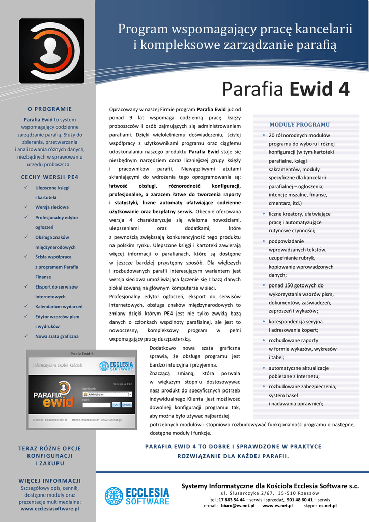 potrzebnych modułów Program wspomagający pracę kancelarii programu o następne, dostępne moduły i funkcje. i kompleksowe zarządzanie parafią i stopniowo rozbudowywać funkcjonalność Parafia Ewid 4 O PR OGR AM I E Parafia Ewid to system wspomagający codzienne zarządzanie parafią. Służy do zbierania, przetwarzania i analizowania różnych danych, niezbędnych w sprawowaniu urzędu proboszcza.. CE C HY W E RS J I P E4 Ulepszone księgi i kartoteki Wersja sieciowa Opracowany w naszej Firmie program Parafia Ewid już od ponad 9 lat wspomaga codzienną pracę księży proboszczów i osób zajmujących się administrowaniem MODUŁY PROGRAMU parafiami. Dzięki wieloletniemu doświadczeniu, ścisłej 20 różnorodnych modułów współpracy z użytkownikami programu oraz ciągłemu programu do wyboru i różnej udoskonalaniu naszego produktu Parafia Ewid staje się konfiguracji (w tym kartoteki niezbędnym narzędziem coraz liczniejszej grupy księży parafialne, księgi i sakramentów, moduły pracowników parafii. Niewątpliwymi atutami skłaniającymi do wdrożenia tego oprogramowania są: specyficzne dla kancelarii łatwość parafialnej – ogłoszenia, obsługi, różnorodność konfiguracji, profesjonalne, a zarazem łatwe do tworzenia raporty intencje mszalne, finanse, i statystyki, liczne automaty ułatwiające codzienne cmentarz, itd.) użytkowanie oraz bezpłatny serwis. Obecnie oferowana Profesjonalny edytor liczne kreatory, ułatwiające wersja 4 charakteryzuje się wieloma nowościami, ogłoszeń pracę i automatyzujące ulepszeniami rutynowe czynności; Obsługa znaków z pewnością zwiększają konkurencyjność tego produktu międzynarodowych na polskim rynku. Ulepszone księgi i kartoteki zawierają Ścisła współpraca z programem Parafia oraz dodatkami, które więcej informacji o parafianach, które są dostępne w jeszcze bardziej przystępny sposób. Dla większych i rozbudowanych parafii interesującym wariantem jest podpowiadanie wprowadzanych tekstów, uzupełnianie rubryk, kopiowanie wprowadzonych danych; Finanse wersja sieciowa umożliwiająca łączenie się z bazą danych Eksport do serwisów zlokalizowaną na głównym komputerze w sieci. internetowych Profesjonalny edytor ogłoszeń, eksport do serwisów wykorzystania wzorów pism, Kalendarium wydarzeń internetowych, obsługa znaków międzynarodowych to dokumentów, zaświadczeń, zmiany dzięki którym PE4 jest nie tylko zwykłą bazą zaproszeń i wykazów; Edytor wzorców pism danych o członkach wspólnoty parafialnej, ale jest to korespondencja seryjna i wydruków Nowa szata graficzna nowoczesny, kompleksowy program w pełni wspomagający pracę duszpasterską. Dodatkowo nowa szata graficzna bardzo intuicyjna i przyjemna. zmianą, i adresowanie kopert; rozbudowane raporty sprawia, że obsługa programu jest Znaczącą ponad 150 gotowych do która pozwala w większym stopniu dostosowywać nasz produkt do specyficznych potrzeb indywidualnego Klienta jest możliwość dowolnej konfiguracji programu tak, w formie wykazów, wykresów i tabel; automatyczne aktualizacje pobierane z Internetu; rozbudowane zabezpieczenia, system haseł i nadawania uprawnień; aby można było używać najbardziej potrzebnych modułów i stopniowo rozbudowywać funkcjonalność programu o następne, dostępne moduły i funkcje. T ER AZ R ÓŻN E O PC J E K ONF IG UR A C JI I Z A KU P U WI Ę C E J I NF ORM A C JI Szczegółowy opis, cennik, dostępne moduły oraz prezentacje multimedialne: www.ecclesiasoftware.pl PARAFIA EWID 4 TO DOBRE I SPRAWDZONE W PRAKTYCE ROZWIĄZANIE DLA KAŻDEJ PARAFII. Systemy Informatyczne dla Kościoła Ecclesia Software s.c. ul. Ślusarczyka 2/67, 35 -510 Rzeszów tel.: 17 863 54 44 – serwis I sprzedaż, 501 48 60 41 – serwis e-mail: [email protected] www.es.net.pl skype: es.net.pl