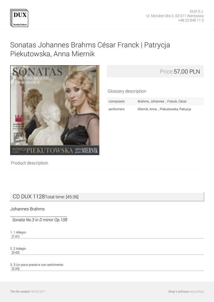 DUX S.J. Ul. Morskie Oko 2, 02-511 Warszawa +48 22 849 11 3 Sonatas Johannes Brahms César Franck | Patrycja Piekutowska, Anna Miernik Price:57,00 PLN Glossary description composers Brahms, Johannes ∎, Franck, César ∎ performers Miernik, Anna ∎, Piekutowska, Patrycja ∎ Product description CD DUX 1128Total time: [45:36] Johannes Brahms Sonata No.3 in D minor Op.108 1. 1 Allegro [7:41] 2. 2 Adagio [3:43] 3. 3 Un poco presto e con sentimento [2:35] The file created: 08-03-2017 Shop`s software AptusShop DUX S.J. Ul. Morskie Oko 2, 02-511 Warszawa +48 22 849 11 3 4. 4 Presto agitato [5:25] César Franck Sonata in A major for Violin & Piano 5. 1 Allegretto moderato [5:36] 6. 2 Allegro [7:53] 7. 3 Recitativo-Fantasia [6:15] 8. 4 Allegretto poco mosso [6:16] Performers: Anna Miernik /piano/ Patrycja Piekutowska /violin/ The file created: 08-03-2017 Powered by TCPDF (www.tcpdf.org) Shop`s software AptusShop