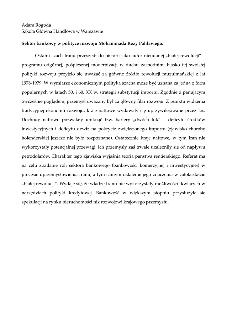Adam Rogoda Szkoła Główna Handlowa w Warszawie Sektor bankowy w polityce rozwoju Mohammada Rezy Pahlaviego. Ostatni szach Iranu przeszedł do historii jako autor nieudanej „białej rewolucji” – programu odgórnej, pośpiesznej modernizacji w duchu zachodnim. Fiasko tej swoistej polityki rozwoju przyjęło się uważać za główne źródło rewolucji muzułmańskiej z lat 1978-1979. W wymiarze ekonomicznym polityka szacha może być uznana za jedną z form popularnych w latach 50. i 60. XX w. strategii substytucji importu. Zgodnie z panującym ówcześnie poglądem, przemysł uważany był za główny filar rozwoju. Z punktu widzenia tradycyjnej ekonomii rozwoju, kraje naftowe wydawały się uprzywilejowane przez los. Dochody naftowe pozwalały uniknąć tzw. bariery „dwóch luk” – deficytu środków inwestycyjnych i deficytu dewiz na pokrycie zwiększonego importu (zjawisko choroby holenderskiej jeszcze nie było rozpoznane). Ostatecznie kraje naftowe, w tym Iran nie wykorzystały potencjalnej przewagi, ich przemysły zaś trwale uzależniły się od napływu petrodolarów. Charakter tego zjawiska wyjaśnia teoria państwa rentierskiego. Referat ma na celu zbadanie roli sektora bankowego (bankowości komercyjnej i inwestycyjnej) w procesie uprzemysłowienia Iranu, a tym samym ustalenie jego znaczenia w całokształcie „białej rewolucji”. Wydaje się, że władze Iranu nie wykorzystały możliwości tkwiących w narzędziach polityki kredytowej. Bankowość w większym stopniu przysłużyła się spekulacji na rynku nieruchomości niż rozwojowi krajowego przemysłu.