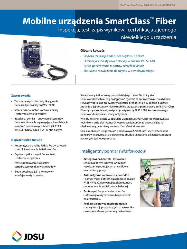 URZĄDZENIA POMIAROWE DLA TELEKOMUNIKACJI Mobilne urządzenia SmartClass™ Fiber Inspekcja, test, zapis wyników i certyfikacja z jednego niewielkiego urządzenia Główne korzyści • Szybsza realizacja zadań, bez błędów i na czas! • Eliminacja subiektywnych decyzji w analizie PASS / FAIL • Łatwe generowanie raportów certyfikacyjnych • Elastyczne rozwiązanie do użytku w dowolnym miejsc! Zastosowania • Tworzenie raportów certyfikacyjnych z analizą łączności typu PASS / FAIL • Standaryzacja metod kontroli, analizy i testowania światłowodów • Instalacja, pomiar i utrzymanie systemów światłowodowych, wymagających mobilnych urządzeń pomiarowych, takich jak FTTX, BPON/EPON/GPON, FTTA i centra danych. Najważniejsze funkcje • Automatyczna analiza PASS / FAIL w zakresie kontroli i testowania światłowodów • Zapis wszystkich wyników kontroli i testów w urządzeniu • Proste generowanie raportów certyfikacyjnych dla światłowodów • Ekran dotykowy 3,5" z kolorowym interfejsem użytkownika Światłowody to kluczowy punkt dzisiejszych sieci. Technicy sieci światłowodowych muszą postępować zgodnie ze sprawdzonymi praktykami i wykazywać jakość pracy, poświadczając prędkość sieci w sposób budzący zaufanie u jej dostawcy. Nowe mobilne urządzenia pomiarowe z serii SmartClass Fiber łączą w sobie automatyczną certyfikację PASS / FAIL kontrolowanego światłowodu i pomiaru mocy optycznej. Wielofunkcyjne, proste w obsłudze urządzenia SmartClass Fiber zapewniają technikom dużą elastyczność i wysoką wydajność oraz pozwalają na ich błyskawiczną przemianę w ekspertów od światłowodów. Dzięki mobilnym urządzeniom pomiarowym SmartClass Fiber skrócisz czas pomiarów i certyfikacji o połowę oraz zbudujesz zaufanie u klientów, poprzez naciśnięcie jednego przycisku. Inteligentny pomiar światłowodów • Zintegrowana kontrola i testowanie światłowodów w jednym, wydajnym rozwiązaniu promującym prawidłowe mechanizmy pracy. • Automatyczna kontrola światłowodów i pomiar mocy optycznej za pomocą analizy PASS / FAIL realizowanej bez konieczności podejmowania subiektywnych decyzji. • Zapis wyników pomiarów, obrazów i informacji o użytkowniku bezpośrednio na urządzeniu. • Realizacja sprawdzonych praktyk za sprawą funkcji prowadzących użytkownika przez prawidłową procedurę testowania. Inspekcja, pomiar, zapis wyników i certyfikacja... z jednego niewielkiego urządzenia Inspekcja Inspekcja zgodnie ze standardami przemysłowymi (np. IEC-61300-335) bez konieczności kierowania się subiektywnymi decyzjami. Generowanie automatycznego wyniku PASS / FAIL po naciśnięciu tylko jednego przycisku. Test Zapis i certyfikacja Szerokopasmowy miernik mocy (OLP-82) Zapis wyników w urządzeniu Miernik mocy PON (OLP-87) Generowanie raportów certyfikacyjnych Dokładny pomiar mocy optycznej dla wielu długości fal, ustawianie wartości progu PASS / FAIL, ustawianie wartości referencyjnej. Skonfiguruj niestandardowe długości fali i powiąż pomiary mocy optycznej z wynikami kontroli. Zbuduj zaufanie klientów poprzez jakość pracy. Zapisz wyniki kontroli i pomiarów w urządzeniu SmartClass, przenieś je do komputera, aby zarchiwizować i wygenerować raporty certyfikacyjne. Dwa razy szybsza realizacja zadań Osiągnięcie optymalnej wydajności wymaga systematycznej, proaktywnej realizacji procedur, które dla wielu techników są problematyczne i niejasne. Rozwiązaniem tych problemów są wygodne, szybkie i przenośne urządzenia SmartClass Fiber, które oferują wszystkie najważniejsze funkcje. Kroki 1 Sprawdź czystość patchcordu Wyczyść, przeprowadź kontrolę 2 czystości i zapisz obraz czystego patchcordu Sprawdź czystość portu 3 optycznego Wyczyść, przeprowadź kontrolę 4 czystości i zapisz obraz czystego włókna w porcie optycznym Zmierz moc optyczną 5 i zapisz dane 6 Przejdź do następnego portu Przenośne rozwiązania pomiarowe SmartClass Fiber Proste kroki – profesjonalny pomiar Kontrola patchcordów Kontrola portów optycznych Pomiar mocy optycznej Każde urządzenie SmartClass Fiber ma przycisk, który prowadzi użytkownika przez różne aplikacje niezbędne do realizacji pomiarów w prawidłowy sposób. Jest to funkcja przydatna dla wszystkich użytkowników niezależnie od poziomu doświadczenia, ponieważ pozwala na prostą realizację krok po kroku procedur i bezbłędne wykonanie zadania za pierwszym razem. • Prowadzi użytkownika przez wykonywany pomiar za pomocą prostych w realizacji, powtarzalnych czynności • Pozwala na prawidłowe przeprowadzenie pomiaru za pierwszym razem • Wzmacnia właściwe zachowania u użytkowników Kontrola powierzchni czołowej złączy optycznych z analizą PASS / FAIL Zanieczyszczone złącza są główną przyczyną problemów w sieciach optycznych. Z tego powodu komisja IEC opracowała normę IEC 613003-35, światowy standard jakości i czystości powierzchni czołowej złączy światłowodowych. Kontrola złączy światłowodowych według standardu lub specyfikacji , bez odpowiednich narzędzi, jest trudna i czasochłonna. Urządzenia pomiarowe SmartClass Fiber pozwalają na wyeliminowanie tych problemów. Niezależnie od tego, czy pomiar jest realizowany zgodnie z normą, czy specyficznymi wymaganiami klienta, użytkownicy mogą łatwo, szybko i dokładnie przetestować i certyfikować powierzchnie czołowe złączy światłowodowych za pomocą automatycznej analizy PASS / FAIL. Wystarczy naciśnięcie jednego przycisku. • Jednoznaczne sprawdzanie zgodności ze specyfikacją • Szybkie wyniki za naciśnięciem jednego przycisku • Certyfikacja zgodności ze standardami przemysłowymi (IEC) lub klienta • Usunięcie subiektywności z procesu pomiaru dzięki automatycznej analizie PASS / FAIL Które z tych złączy spełniają normy IEC? Za pomocą urządzeń SmartClass Fiber otrzymasz szybką odpowiedź. Generowanie raportów certy