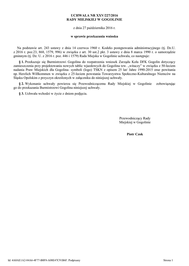 UCHWAŁA NR XXV/227/2016 RADY MIEJSKIEJ W GOGOLINIE z dnia 27 października 2016 r. w sprawie przekazania wniosku Na podstawie art. 243 ustawy z dnia 14 czerwca 1960 r. Kodeks postępowania administracyjnego (tj. Dz.U. z 2016 r. poz.23, 868, 1579, 996) w związku z art. 30 ust.2 pkt. 3 ustawy z dnia 8 marca 1990 r. o samorządzie gminnym (tj. Dz. U. z 2016 r. poz. 446 i 1579) Rada Miejska w Gogolinie uchwala, co następuje: § 1. Przekazuje się Burmistrzowi Gogolina do rozpatrzenia wniosek Zarządu Koła DFK Gogolin dotyczący zamieszczenia przy projektowaniu nowych tablic wjazdowych do Gogolina tzw. „witaczy” w związku z 50-leciem nadania Praw Miejskich dla Gogolina- symboli (logo) TSKN z opisem 25 lat/ Jahre 1990-2015 oraz powitania np. Herzlich Willkommen w związku z 25-leciem powstania Towarzystwa Społeczno-Kulturalnego Niemców na Śląsku Opolskim z przyczyn określonych w załączniku do niniejszej uchwały. § 2. Wykonanie uchwały powierza się Przewodniczącemu Rady Miejskiej w Gogolinie go do przekazania Burmistrzowi Gogolina niniejszej uchwały. zobowiązując § 3. Uchwała wchodzi w życie z dniem podjęcia. Przewodniczący Rady Miejskiej w Gogolinie Piotr Czok Id: 4A0AE1A2-84A6-4F77-B0F8-A08E47C91B6F. Podpisany Strona 1 Załącznik do Uchwały Nr XXV/227/2016 Rady Miejskiej w Gogolinie z dnia 27 października 2016 r. W dniu 14.10.2016r. Zarząd Koła DFK Gogolin przekazał Radzie Miejskiej w Gogolinie wniosek dotyczący zamieszczenia przy projektowaniu nowych tablic wjazdowych do Gogolina tzw. „witaczy” w związku z 50leciem nadania Praw Miejskich dla Gogolina- symboli (logo) TSKN z opisem 25 lat/Jahre 1990-2015 oraz powitania np. Herzlich Willkommen w związku z 25-leciem powstania Towarzystwa Społeczno-Kulturalnego Niemców na Śląsku Opolskim. Zgodnie z art. 30 ust. 2 pkt. 3 ustawy z dnia 8 marca 1990r. o samorządzie gminnym (Dz. U. z 2016r. poz. 446 i 1579) do zadań wójta należy w szczególności gospodarowanie mieniem komunalnym. Wniosek Zarządu DFK Gogolin dotyczy tablic informacyjnych stanowiących mienie gminy, którego zarządcą jest Burmistrz Gogolina. Zgodnie z art. 243 ustawy z dnia 14 czerwca 1960r. Kodeks postępowania administracyjnego (tj. Dz.U. z 2016r. poz.23, 868, 1579,996) jeżeli organ, który otrzymał wniosek, nie jest właściwy do jego rozpatrzenia obowiązany jest przekazać go właściwemu organowi. Wobec braku kompetencji Rady Miejskiej w Gogolinie do rozpatrzenia wniosku Zarządu Koła DFK Gogolin, wniosek należy przekazać Burmistrzowi Gogolina, jako właściwemu do gospodarowania mieniem komunalnym tj. tablicami informacyjnymi znajdującymi się na drogach wjazdowych do Gogolina. Id: 4A0AE1A2-84A6-4F77-B0F8-A08E47C91B6F. Podpisany Strona 1