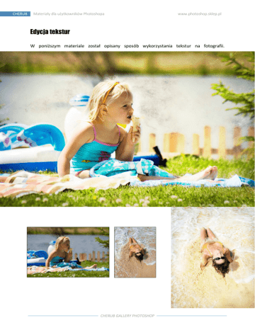 CHERUB Materiały dla użytkowników Photoshopa www.photoshop.sklep.pl Edycja tekstur W poniższym materiale został opisany sposób wykorzystania tekstur na fotografii. CHERUB GALLERY PHOTOSHOP CHERUB Materiały dla użytkowników Photoshopa www.photoshop.sklep.pl Otwieramy dowolną fotografię i dokument tekstury, jaki chcemy na niej zastosować. W naszym przykładzie portret dziecka i teksturę 03. Jeżeli posiadamy fotografię orientacji poziomej wówczas musimy dokonać obrócenia dokumentu tekstury. W tym celu wybieramy z menu Obrazek>Obróć obrazek>90 st. (Image>Image Rotation>90 CW). Za pomocą narzędzia Przesunięcie (Move Tool) przenosimy teksturę do dokumentu fotografii. Wybieramy z menu Edycja>Swobodnie przekształć (Edit>Free Transform). Chwytamy jeden z narożników ramki skalowania i z przytrzymanym klawiszem Shift, celem zachowania proporcji boków, dopasowujemy teksturę do rozmiaru fotografii. Akceptujemy Enter. Przechodzimy do palety Warstwy (Layers). Zmieniamy tryb mieszania ze Zwykły (Normal) na Nakładka (Overlay). Zmniejszamy nieznacznie parametr Krycie (Opacity) dostępny na palecie Warstwy (Layers). W naszym przykładzie do wartości 85%. Za pomocą ikony dostępnej na palecie, tworzymy maskę warstwy. Wybieramy narzędzie Pędzel (Brush Tool). Na przyborniku ustalamy czarny kolor narzędzia. Zamalowujemy główny obiekt fotografii,w naszym przykładzie dziecko. Użycie maski pozwala na usunięcie zastosowanego trybu mieszania na obszarze malowanym. CHERUB GALLERY PHOTOSHOP CHERUB Materiały dla użytkowników Photoshopa www.photoshop.sklep.pl Tworzymy warstwę dopasowania wybierając z menu Warstwa>Nowa warstwa dopasowania>Jasność/Kontrast (Layer>New Adjustments Layer>Brightness/Contrast). Akceptujemy OK w wyświetlonym oknie dialogowym. W wyświetlonym oknie Dopasowania (Adjustments) zwiększamy Jasność (Brightness) skupiając się na rozjaśnieniu głównego obiektu. W naszym przykładzie do wartości 90. Mając nadal aktywny Pędzel (Brush Tool) z ustalonym czarnym kolorem narzędzia, malujemy cały obszar poza głównym obiektem. Jeżeli zajdzie potrzeba możemy dokonać dodatkowo ściemnienia krawędzi edytowanego dokumentu. W tym celu uaktywniamy miniaturkę podglądu warstwy Layer1, wskazaną na przykładzie obok. Wybieramy Pędzel (Brush Tool) z ustalonym czarnym kolorem narzędzia. Na pasku opcji zmniejszamy parametr Krycie (Opacity) do około 10‐20%. Malujemy po krawędziach obiektu dokonując ściemnienia wedle własnych potrzeb estetycznych. CHERUB GALLERY PHOTOSHOP CHERUB Materiały dla użytkowników Photoshopa www.photoshop.sklep.pl Spłaszczamy dokument wybierając z menu Warstwa>Spłaszcz obrazek (Layer>Flatten Image). Tą samą metodę stosujemy na wszystkich teksturach dostępnych na nośniku. W poniższym przykładzie została w taki sam sposób wykorzystana inna tekstura. W zależności od tonacji edytowanej fotografii możemy również skorzystać z trybu mieszania Mnożenie (Multiply). Podczas gdy tryb mieszania Nakładka (Overlay) powoduje przyciemnienie najciemniejszych i rozjaśnienie najjaśniejszych pikseli w obrazie mieszając ze sobą półcienie o tyle tryb Mnożenie (Multiply) spowoduje ściemnienie dokumentu wykonując między warstwami gładkie przejścia. Autor: cherub CHERUB GALLERY PHOTOSHOP