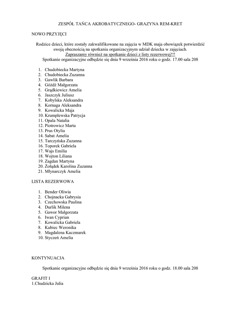 ZESPÓŁ TAŃCA AKROBATYCZNEGO- GRAZYNA REM-KRET NOWO PRZYJĘCI Rodzice dzieci, które zostały zakwalifikowane na zajęcia w MDK maja obowiązek potwierdzić swoją obecnością na spotkaniu organizacyjnym udział dziecka w zajęciach. Zapraszamy również na spotkanie dzieci z listy rezerwowej!!! Spotkanie organizacyjne odbędzie się dnia 9 września 2016 roku o godz. 17.00 sala 208 1. Chudobiecka Martyna 2. Chudobiecka Zuzanna 3. Gawlik Barbara 4. Góźdź Małgorzata 5. Grądkiewicz Amelia 6. Jaszczyk Juliusz 7. Kobylska Aleksandra 8. Kornaga Aleksandra 9. Kowalicka Maja 10. Krumplewska Patrycja 11. Opala Natalia 12. Piotrowicz Marta 13. Prus Otylia 14. Sabat Amelia 15. Tarczyńska Zuzanna 16. Toporek Gabriela 17. Wajs Emilia 18. Wojton Liliana 19. Zagdan Martyna 20. Żołądek Karolina Zuzanna 21. Młynarczyk Amelia LISTA REZERWOWA 1. Bender Oliwia 2. Chojnacka Gabrysia 3. Czechowska Paulina 4. Durlik Milena 5. Gawor Małgorzata 6. Iwan Cyprian 7. Kowalicka Gabriela 8. Kubiec Weronika 9. Magdalena Kaczmarek 10. Styczeń Amelia KONTYNUACJA Spotkanie organizacyjne odbędzie się dnia 9 września 2016 roku o godz. 18.00 sala 208 GRAFIT I 1.Chudzicka Julia 2.Dalach Natalia 3.Gołąbek Natalia 4.Jarosz Laura 5.Karwacińska Klara 6.Neska Aleksandra 7.Olendzka Kaja 8.Olendzka Nina 9.Rutka Izabela 10.Siudak Urszula 11.Stokowska Aleksandra 12.Surowiec Julia 13.Wawrzeńczyk Maria 14.Wijas Gabiela 15.Wijas Wiktoria 16.Wójcicka Zofia 17.Zięba Klaudia 18.Żaboklicka Hanna GRAFIT II: 1.Babiarczyk Wiktoria 2.Gawor Sandra 3.Gruba Paulina 4.Gruszka Aleksandra 5.Jachymek Julia 6.Kierkowska Bogna 7.Klamka Maja 8.Kubicka Zuzanna 9.Kubisztal Julia 10.Król Amelia 11.Król Antoni 12.Michalska Magdalena 13.Plech Karolina 14.Różycka Maja 15.Wiech Zuzanna 16.Witecka Ewelina ŻONGLERKA: 1.Patrycja Piotrowska 2.Małgorzata Malecka 3.Julia Chudzicka 4.Natalia Dalia 5.Natalia Gołąbek 6.Wiktoria Wijas 7.Urszula Siudak 8.Izabela Rutka GRAFIT III 1.Bronarska Maja 2.Bronarska Zuzanna 3.Fidera Daria 4.Nowocień Aleksandra 5.Odej Piotr 6.Piotrowska Julia 7.Piotrowska Natalia 8.Przepióra Julia 9.Przepióra Natalia 10.Rudka Luiza 11.Żelazny Gabriela